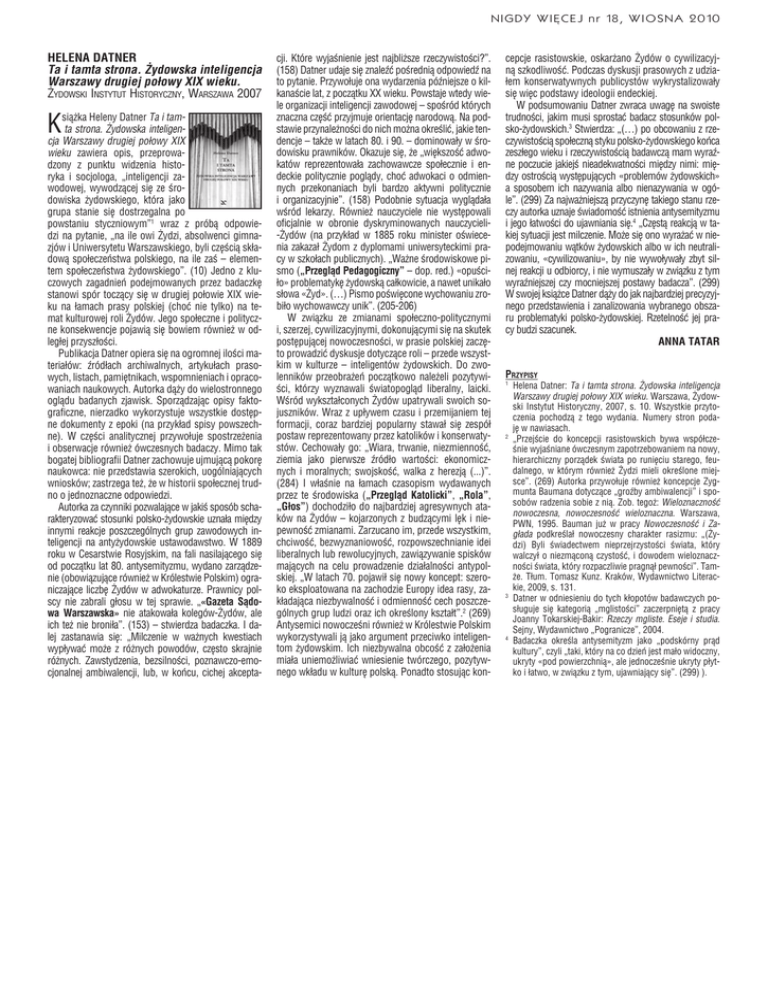 NIGDY WIĘCEJ nr 18, WIOSNA 2010 HELENA DATNER Ta i tamta strona. Żydowska inteligencja Warszawy drugiej połowy XIX wieku. ŻYDOWSKI INSTYTUT HISTORYCZNY, WARSZAWA 2007 siążka Heleny Datner Ta i tamK ta strona. Żydowska inteligencja Warszawy drugiej połowy XIX wieku zawiera opis, przeprowadzony z punktu widzenia historyka i socjologa, „inteligencji zawodowej, wywodzącej się ze środowiska żydowskiego, która jako grupa stanie się dostrzegalna po powstaniu styczniowym”1 wraz z próbą odpowiedzi na pytanie, „na ile owi Żydzi, absolwenci gimnazjów i Uniwersytetu Warszawskiego, byli częścią składową społeczeństwa polskiego, na ile zaś – elementem społeczeństwa żydowskiego”. (10) Jedno z kluczowych zagadnień podejmowanych przez badaczkę stanowi spór toczący się w drugiej połowie XIX wieku na łamach prasy polskiej (choć nie tylko) na temat kulturowej roli Żydów. Jego społeczne i polityczne konsekwencje pojawią się bowiem również w odległej przyszłości. Publikacja Datner opiera się na ogromnej ilości materiałów: źródłach archiwalnych, artykułach prasowych, listach, pamiętnikach, wspomnieniach i opracowaniach naukowych. Autorka dąży do wielostronnego oglądu badanych zjawisk. Sporządzając opisy faktograficzne, nierzadko wykorzystuje wszystkie dostępne dokumenty z epoki (na przykład spisy powszechne). W części analitycznej przywołuje spostrzeżenia i obserwacje również ówczesnych badaczy. Mimo tak bogatej bibliografii Datner zachowuje ujmującą pokorę naukowca: nie przedstawia szerokich, uogólniających wniosków; zastrzega też, że w historii społecznej trudno o jednoznaczne odpowiedzi. Autorka za czynniki pozwalające w jakiś sposób scharakteryzować stosunki polsko-żydowskie uznała między innymi reakcje poszczególnych grup zawodowych inteligencji na antyżydowskie ustawodawstwo. W 1889 roku w Cesarstwie Rosyjskim, na fali nasilającego się od początku lat 80. antysemityzmu, wydano zarządzenie (obowiązujące również w Królestwie Polskim) ograniczające liczbę Żydów w adwokaturze. Prawnicy polscy nie zabrali głosu w tej sprawie. „«Gazeta Sądowa Warszawska» nie atakowała kolegów-Żydów, ale ich też nie broniła”. (153) – stwierdza badaczka. I dalej zastanawia się: „Milczenie w ważnych kwestiach wypływać może z różnych powodów, często skrajnie różnych. Zawstydzenia, bezsilności, poznawczo-emocjonalnej ambiwalencji, lub, w końcu, cichej akcepta- cji. Które wyjaśnienie jest najbliższe rzeczywistości?”. (158) Datner udaje się znaleźć pośrednią odpowiedź na to pytanie. Przywołuje ona wydarzenia późniejsze o kilkanaście lat, z początku XX wieku. Powstaje wtedy wiele organizacji inteligencji zawodowej – spośród których znaczna część przyjmuje orientację narodową. Na podstawie przynależności do nich można określić, jakie tendencje – także w latach 80. i 90. – dominowały w środowisku prawników. Okazuje się, że „większość adwokatów reprezentowała zachowawcze społecznie i endeckie politycznie poglądy, choć adwokaci o odmiennych przekonaniach byli bardzo aktywni politycznie i organizacyjnie”. (158) Podobnie sytuacja wyglądała wśród lekarzy. Również nauczyciele nie występowali oficjalnie w obronie dyskryminowanych nauczycieli-Żydów (na przykład w 1885 roku minister oświecenia zakazał Żydom z dyplomami uniwersyteckimi pracy w szkołach publicznych). „Ważne środowiskowe pismo („Przegląd Pedagogiczny” – dop. red.) «opuściło» problematykę żydowską całkowicie, a nawet unikało słowa «Żyd». (…) Pismo poświęcone wychowaniu zrobiło wychowawczy unik”. (205-206) W związku ze zmianami społeczno-politycznymi i, szerzej, cywilizacyjnymi, dokonującymi się na skutek postępującej nowoczesności, w prasie polskiej zaczęto prowadzić dyskusje dotyczące roli – przede wszystkim w kulturze – inteligentów żydowskich. Do zwolenników przeobrażeń początkowo należeli pozytywiści, którzy wyznawali światopogląd liberalny, laicki. Wśród wykształconych Żydów upatrywali swoich sojuszników. Wraz z upływem czasu i przemijaniem tej formacji, coraz bardziej popularny stawał się zespół postaw reprezentowany przez katolików i konserwatystów. Cechowały go: „Wiara, trwanie, niezmienność, ziemia jako pierwsze źródło wartości: ekonomicznych i moralnych; swojskość, walka z herezją (...)”. (284) I właśnie na łamach czasopism wydawanych przez te środowiska („Przegląd Katolicki”, „Rola”, „Głos”) dochodziło do najbardziej agresywnych ataków na Żydów – kojarzonych z budzącymi lęk i niepewność zmianami. Zarzucano im, przede wszystkim, chciwość, bezwyznaniowość, rozpowszechnianie idei liberalnych lub rewolucyjnych, zawiązywanie spisków mających na celu prowadzenie działalności antypolskiej. „W latach 70. pojawił się nowy koncept: szeroko eksploatowana na zachodzie Europy idea rasy, zakładająca niezbywalność i odmienność cech poszczególnych grup ludzi oraz ich określony kształt”.2 (269) Antysemici nowocześni również w Królestwie Polskim wykorzystywali ją jako argument przeciwko inteligentom żydowskim. Ich niezbywalna obcość z założenia miała uniemożliwiać wniesienie twórczego, pozytywnego wkładu w kulturę polską. Ponadto stosując kon- cepcje rasistowskie, oskarżano Żydów o cywilizacyjną szkodliwość. Podczas dyskusji prasowych z udziałem konserwatywnych publicystów wykrystalizowały się więc podstawy ideologii endeckiej. W podsumowaniu Datner zwraca uwagę na swoiste trudności, jakim musi sprostać badacz stosunków polsko-żydowskich.3 Stwierdza: „(…) po obcowaniu z rzeczywistością społeczną styku polsko-żydowskiego końca zeszłego wieku i rzeczywistością badawczą mam wyraźne poczucie jakiejś nieadekwatności między nimi: między ostrością występujących «problemów żydowskich» a sposobem ich