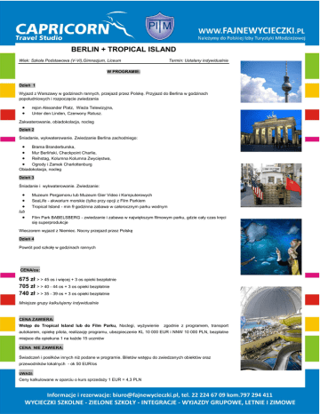 BERLIN + TROPICAL ISLAND Wiek: Szkoła Podstawowa (V-VI),Gimnazjum, Liceum Termin: Ustalany indywidualnie W PROGRAMIE: Dzień 1 Wyjazd z Warszawy w godzinach rannych, przejazd przez Polskę. Przyjazd do Berlina w godzinach popołudniowych i rozpoczęcie zwiedzania rejon Alexander Platz, Wieża Telewizyjna, Unter den Linden, Czerwony Ratusz. Zakwaterowanie, obiadokolacja, nocleg Dzień 2 Śniadanie, wykwaterowanie. Zwiedzanie Berlina zachodniego: Brama Branderburska, Mur Berliński, Checkpoint Charlie, Reihstag, Kolumna Kolumna Zwycięstwa, Ogrody i Zamek Charlottenburg Obiadokolacja, nocleg Dzień 3 Śniadanie i wykwaterowanie. Zwiedzanie: Muzeum Pergamonu lub Muzeum Gier Video i Komputerowych SeaLife - akwarium morskie (tylko przy opcji z Film Parkiem Tropical Island - min 9 godzinna zabawa w całorocznym parku wodnym lub Film Park BABELSBERG - zwiedzanie i zabawa w największym filmowym parku, gdzie cały czas kręci się superprodukcje Wieczorem wyjazd z Niemiec. Nocny przejazd przez Polskę Dzień 4 Powrót pod szkołę w godzinach rannych CENA/os: 675 zł > > 45 os i więcej + 3 os opieki bezpłatnie 705 zł > > 40 - 44 os + 3 os opieki bezpłatnie 740 zł > > 35 - 39 os + 3 os opieki bezpłatnie Mniejsze grupy kalkulujemy indywidualnie CENA ZAWIERA: Wstęp do Tropical Island lub do Film Parku, Noclegi, wyżywienie zgodnie z programem, transport autokarem, opiekę pilota, realizację programu, ubezpieczenie KL 10 000 EUR i NNW 10 000 PLN, bezpłatne miejsce dla opiekuna 1 na każde 15 uczniów CENA NIE ZAWIERA: Świadczeń i posiłków innych niż podane w programie. Biletów wstępu do zwiedzanych obiektów oraz przewodników lokalnych - ok 50 EUR/os UWAGI: Ceny kalkulowane w oparciu o kurs sprzedaży 1 EUR = 4,3 PLN