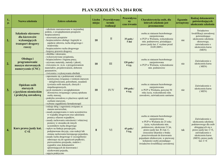 PLAN SZKOLEŃ NA 2014 ROK L. p. Nazwa szkolenia 1. Szkolenie okresowe dla kierowców wykonujących transport drogowy rzeczy 2. Obsługa i programowanie maszyn sterowanych numerycznie (CNC) 3. Opiekun osób starszych z językiem niemieckim i praktyką zawodową 4. Kurs prawa jazdy kat. C+E Zakres szkolenia - szkolenie zaawansowane w racjonalnej jeździe, z uwzględnieniem przepisów bezpieczeństwa - stosowanie przepisów - bezpieczeństwo obsługi i logistyki w aspekcie zdrowia, ruchu drogowego i środowiska - bezpieczeństwo ruchu drogowego - krajowy przewóz drogowy - obróbka i skrawanie, - wykorzystywane urządzenia, - bezpieczeństwo i higiena pracy, - uŜywane materiały, metody i jakość, - ćwiczenia zw. m.in. z przygotowaniem materiałów, projektowaniem, doborem parametrów, - ćwiczenia z wykonywania obróbek - zapoznanie się z podstawami wiedzy teoretycznej związanej z wiekiem starszym – dolegliwościami, potrzebami, zasadami Ŝywienia osób starszych, chorych i niepełnosprawnych, - język niemiecki z uwzględnieniem słownictwa związanego z pracą opiekuna osoby starszej, - praktyka zawodowa w placówce opieki nad osobami starszymi, - wybrane zagadnienia farmakoterapii - rodzaje dróg i zagroŜenia związane ze stanem nawierzchni, - zasady postępowania w razie uczestnictwa w wypadku drogowym oraz udzielania pomocy ofiarom wypadków, - zasady zachowania ostroŜności i właściwej postawy w stosunku do innych uczestników ruchu drogowego - wpływ na funkcje percepcyjne, podejmowane decyzje, czas reakcji lub zmianę zachowania kierującego pojazdem, - zasady ruchu drogowego w szczególności odnoszące się do ograniczeń prędkości, pierwszeństwa przejazdu, znaków i sygnałów oraz dokumentów uprawniających do kierowania i uŜytkowania pojazdu, - zajęcia praktyczne Liczba miejsc 10 10 10 8 Przewidywa Przewidywany ny termin czas trwania realizacji Charakterystyka osób, dla których szkolenie jest przeznaczone II 35 godz./ 5 dni osoba ze statusem bezrobotnego zarejestrowana w PUP w Wieluniu, wykształcenie min. podstawowe, posiadająca prawo jazdy kat. C wydane przed 10.09.2009 r. III 120 godz./ 4 tyg. osoba ze statusem bezrobotnego zarejestrowana w PUP w Wieluniu, wykształcenie min. podstawowe 190 godz./ 6 tyg. osoba ze statusem bezrobotnego zarejestrowana w PUP w Wieluniu, powyŜej 50 roku Ŝycia, wykształcenie min. zawodowe, zaświadczenie sanitarne 45 godz./ 5 tyg. osoba ze statusem bezrobotnego zarejestrowana w PUP w Wieluniu do 25 roku Ŝycia, wykształcenie min. podstawowe, ukończone 21 lat, prawo jazdy kat. B i kat. C, orzeczenie lekarskie o braku przeciwwskazań do kierowania pojazdami silnikowymi, w pierwszej kolejności osoby posiadające świadectwo kwalifikacji zawodowej IV/V VI Egzamin zewnętrzny Rodzaj dokumentów potwierdzających ukończenie szkolenia nie Świadectwo kwalifikacji zawodowej potwierdzające ukończenie szkolenia okresowego, zaświadczenie o ukończeniu kursu (MEN) nie Zaświadczenie o ukończeniu kursu ( MEN) nie tak Zaświadczenie o ukończeniu kursu ( MEN) Zaświadczenie o ukończeniu szkolenia podstawowego dla osób ubiegających się o prawo jazdy kat. C+E, zaświadczenie o ukończeniu kursu (MEN), prawo jazdy kat. C+E 5. Eksploatacja urządzeń, instalacji i sieci elektroenergetycznych do 1 kV 6. Profesjonalny przedstawiciel handlowy 7. Obsługa pilarek łańcuchowychspalinowych 8. Obsługa komputera dla początkujących wraz z obsługą kas fiskalnych - przepisy ogólne i wybrane zagadnienia, - obowiązki osób na stanowisku elektryka E, - organizacja pracy przy urządzeniach elektroenergetycznych G1, - ochrona przeciwporaŜeniowa, - układy sieciowe, - ochrona odgromowa i przepięciowa, - sprzęt ochronny na stanowisku pracy elektryka, - BHP przy urządzeniach, instalacjach i sieciach elektroenergetycznych, ochrona p.poŜ, - zasady dysponowania mocą urządzeń przyłączonych do sieci - techniki sprzedaŜy, - elementy skutecznego komunikatu werbalnego, - negocjacje handlowe, - obsługa komputera , - prezentacja oferty handlowej, - kontakt z trudnym klientem, - budowanie wizerunku własnego i firmy - telemarketing - BHP podczas obsługi pilarek mechanicznych - budowa pilarki spalinowej oraz zasady eksploatacji - techniki pracy pilarkami spalinowymiłańcuchowymi -uruchamianie i korzystanie z systemu WINDOWS, - programy uŜytkowe i stosowanie komputerów, - urządzenia peryferyjne, - edytor tekstu WORD, - zarządzanie plikami i folderami, - arkusz kalkulacyjny EXCEL, - korzystanie z Internetu, - budowa i obsługa kas fiskalnych ( wydruk paragonów i raportów, usuwanie usterek, programowanie kasy, - obsługa urządzeń współpracujących z kasą: czytnik kodów kreskowych, terminal kart płatniczych 10 10 10 15 VIII 24godz./ 3 dni osoba ze statusem bezrobotnego zarejestrowana w PUP w Wieluniu, wykształcenie min. podstawowe tak Świadectwo kwalifikacyjne uprawniające do zajmowania się eksploatacją urządzeń, instalacji i sieci na stanowisku eksploatacji, zaświadczenie o ukończeniu kursu (MEN) IX/X 120 godz./ 4 tyg. osoba ze statusem bezrobotnego zarejestrowana w PUP w Wieluniu, wykształcenie min. średnie nie Zaświadczenie o ukończeniu kursu ( MEN) 16 godz./ 2 dni osoba ze statusem bezrobotnego zarejestrowana w PUP w Wieluniu, powyŜej 50 roku Ŝycia, z brakiem przeciwwskazań zdrowotnych do obsługi pilarki spalinowej nie Zaświadczenie o ukończeniu kursu ( MEN) 100 godz./ 3,5 tyg. osoba ze statusem bezrobotnego zarejestrowana w PUP w Wieluniu, powyŜej 50 roku Ŝycia, wykształcenie min. podstawowe nie Zaświadczenie o ukończeniu kursu ( MEN) IV/V IX/X 9. 10. MontaŜ rusztowań budowlanych metalowych Szkolenie z zakresu umiejętności poszukiwania pracy realizowane w klubie pracy - zagadnienia związane z bhp przy montaŜu i uŜytkowaniu rusztowań, - dokumentacja techniczna oraz zasady uŜytkowania rusztowań budowlanomontaŜowych metalowych, - konstrukcja rusztowań budowlanomontaŜowych z rur stalowych or