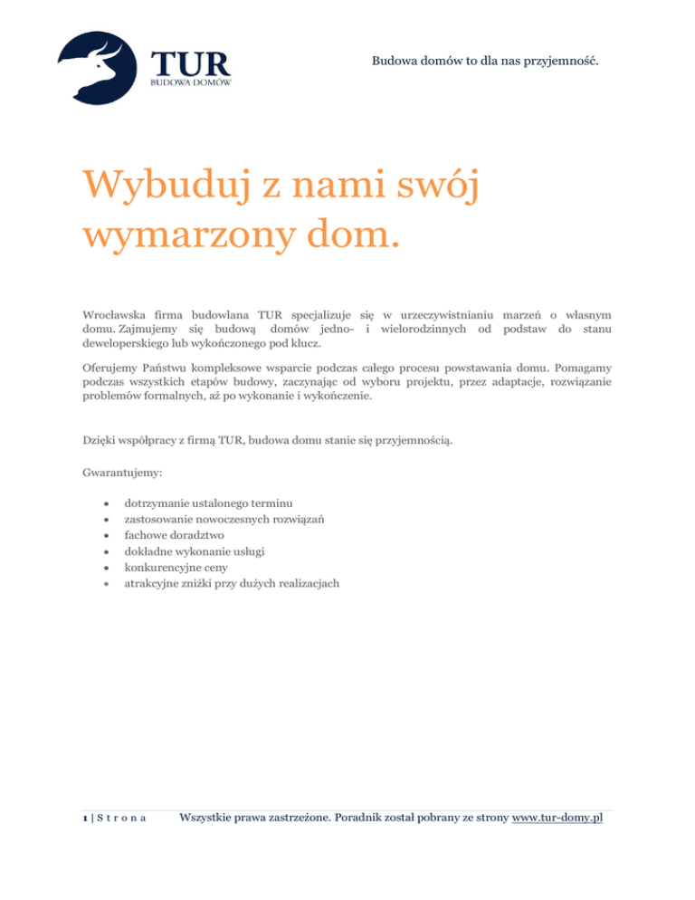 Budowa domów to dla nas przyjemność. Wybuduj z nami swój wymarzony dom. Wrocławska firma budowlana TUR specjalizuje się w urzeczywistnianiu marzeń o własnym domu. Zajmujemy się budową domów jedno- i wielorodzinnych od podstaw do stanu deweloperskiego lub wykończonego pod klucz. Oferujemy Państwu kompleksowe wsparcie podczas całego procesu powstawania domu. Pomagamy podczas wszystkich etapów budowy, zaczynając od wyboru projektu, przez adaptacje, rozwiązanie problemów formalnych, aż po wykonanie i wykończenie. Dzięki współpracy z firmą TUR, budowa domu stanie się przyjemnością. Gwarantujemy: dotrzymanie ustalonego terminu zastosowanie nowoczesnych rozwiązań fachowe doradztwo dokładne wykonanie usługi konkurencyjne ceny atrakcyjne zniżki przy dużych realizacjach 1|S tr o n a Wszystkie prawa zastrzeżone. Poradnik został pobrany ze strony www.tur-domy.pl Budowa domów to dla nas przyjemność. 1. Pierwszy krok BUDOWA DOMU TO DLA NAS PRAWDZIWA PRZYJEMNOŚĆ ›Jak zacząć? Gdzie warto zamieszkać? Co wziąć pod uwagę przy wyborze działki? Jak ubiegać się o pozwolenie na budowę? Wybór terenu pod budowę przyszłego domu, to dopiero pierwszy krok na długiej drodze do zamieszkania w wymarzonym miejscu. Poza decyzją o wyborze najlepszego projektu, ważne jest nie tylko wynajęcie odpowiedniego wykonawcy, ale też sprawne załatwienie spraw formalnych. Większość prac budowlanych wymaga pozwolenia urzędników. Warto więc zacząć od skompletowania odpowiednich dokumentów. Aby budowa domu stała się dla Państwa przyjemnością, warto zaangażować do pomocy firmę TUR, która pomoże Państwu zrobić pierwszy krok i zadba o wszystkie formalności. ›Formalności Jakie dokumentu należy skompletować? Co może przydać się dodatkowo? Kto mi pomoże? Lista elementów niezbędnych do budowy domu i formalności, których należy dopełnić, jest długa: 1. Działka budowlana 2. Mapa do celów projektowych 3. Warunki zabudowy działki 4. Ustalenia archeologiczne 5. Projekt domu 6. Adaptacja projektu 7. Projekt zagospodarowania działki 8. Wniosek o pozwolenie na budowę 9. Umowa z Zakładem Energetycznym o dostawę prądu 10. Wniosek pozwolenia na budowę 2|Str on a Wszystkie prawa zastrzeżone. Poradnik został pobrany ze strony www.tur-domy.pl Budowa domów to dla nas przyjemność. Jednak to nie wszystko, co może być wymagane. Jeśli potrzebujesz bardziej szczegółowych informacji, odwiedź naszą strona internetową lub skontaktuj się z nami. Wrocławska firma TUR służy kompleksową pomocą podczas całego procesu budowania domu. ›Projekt domu Jaki wybrać projekt - indywidualny, czy gotowy? Jak będą zmieniać się potrzeby rodziny? Czy dom może być ładny, wygodny, a także ekonomiczny w budowie i eksploatacji? Projekt domu to nic innego, jak wizualizacja naszego marzenia przez architekta oraz podstawa do określenia kosztorysu. Na tym etapie budowania domu warto określić oczekiwania rodziny wobec nieruchomości. Spis pomysłów posłuży jako podstawa do rozmowy z architektem, który pomoże wybrać elementy pasujące do koncepcji i możliwości finansowych. Warto pamiętać, że wybór standardowego, już gotowego projektu nie gwarantuje niższych kosztów. Dlaczego? Skontaktuj się z nami, aby uniknąć potem niepotrzebnych kosztów! Firma budowlana TUR oferuje wsparcie na każdym etapie budowy domu. Przy podpisaniu umowy na budowę domu, przygotowanie szczegółowego kosztorysu otrzymacie Państwo W PREZENCIE. ›Projekt wnętrza Wrocławska firma TUR nie tylko wybuduje Państwu idealny dom, ale także zaprojektuje wnętrze zgodne z Państwa marzeniami: zmienimy każdą wizję w konkretny projekt dopracujemy wszystkie detale dostosujemy projekt do możliwości finansowych klienta zadbamy o spójność stylistyczną pomieszczenia zaproponujemy unikalne rozwiązania dostosowane do potrzeb klienta Jeśli chcą Państwo zaznać przyjemności, jaką jest wprowadzenie się do gotowego i urządzonego domu, wykończymy go zgodnie z Państwa oczekiwaniami. ›Technologia Co obejmuje stan surowy? Czym wyróżnia się stan deweloperski? Co charakteryzuje dom wykończony pod klucz? We wrocławskiej firmie TUR specjalizujemy się w budowie domów jedno- i wielorodzinnych, zarówno w stanie surowym, deweloperskim, jak i wykończonych pod klucz. Stan surowy zamknięty obejmuje: wytyczenie geodezyjne budynku 3|Str on a Wszystkie prawa zastrzeżone. Poradnik został pobrany ze strony www.tur-domy.pl Budowa domów to dla nas przyjemność. roboty ziemne ławy fundamentowe ściany fundamentowe podsypka piaskowa pod podłoże betonowe stanu zero kanalizacja stanu zero przepusty kanalizacyjne, wodne, energetyczne izolacje termiczne i p. wilgociowe stanu zero ściany nośne zewnętrzne i wewnętrzne ściany działowe stropy, słupy, podciągi, wieńce schody żelbetowe więźba dachowa pokrycie dachowe wraz z orynnowaniem kominy wykończenie kominów ponad dachem okna i drzwi zewnętrzne oraz brama garażowa ogrodzenie Stan deweloperski obejmuje: rozprowadzenie instalacji ciepłej i zimnej wody oraz kanalizacji rozprowadzenie instalacji hydraulicznych rozprowadzenie instalacji elektrycznej, alarmowej, TV, telefon elewacja z ociepleniem i cokołem podbitka dachowa parapety zewnętrzne ścianki działowe tynki wewnętrzne szlichty betonowe z izolacjami ocieplenie dachu płyty kartonowo-gipsowe Dom pod klucz obejmuje: parapety wewnętrzne wykończenie ścian i podłóg (malowanie, prace glazurnicze) montaż białego osprzętu (prysznica, wanny, umywalki, wc, baterii umywalkowej itp.) obłożenie schodów wewnętrznych i zewnętrznych, tarasów położenie okładzin na płytach balkonowych, wykonanie balustrad drzwi wewnętrzne małą architekturę (podjazdy, podejścia, trawniki, zasadzenie zieleni) 4|S tr o n a Wszystkie prawa zastrzeżone. Poradnik został pobrany ze strony www.tur-domy.pl Budowa domów to dla nas przyjemność. ogrodzenie przyłącz