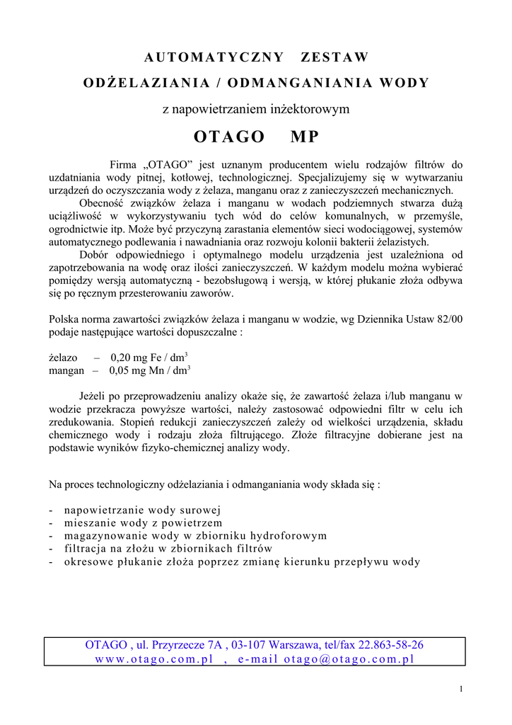 AUTOMATYCZNY ZESTAW ODŻELAZIANIA / ODMANGANIANIA WODY z napowietrzaniem inżektorowym O TAG O MP Firma „OTAGO” jest uznanym producentem wielu rodzajów filtrów do uzdatniania wody pitnej, kotłowej, technologicznej. Specjalizujemy się w wytwarzaniu urządzeń do oczyszczania wody z żelaza, manganu oraz z zanieczyszczeń mechanicznych. Obecność związków żelaza i manganu w wodach podziemnych stwarza dużą uciążliwość w wykorzystywaniu tych wód do celów komunalnych, w przemyśle, ogrodnictwie itp. Może być przyczyną zarastania elementów sieci wodociągowej, systemów automatycznego podlewania i nawadniania oraz rozwoju kolonii bakterii żelazistych. Dobór odpowiedniego i optymalnego modelu urządzenia jest uzależniona od zapotrzebowania na wodę oraz ilości zanieczyszczeń. W każdym modelu można wybierać pomiędzy wersją automatyczną - bezobsługową i wersją, w której płukanie złoża odbywa się po ręcznym przesterowaniu zaworów. Polska norma zawartości związków żelaza i manganu w wodzie, wg Dziennika Ustaw 82/00 podaje następujące wartości dopuszczalne : żelazo – 0,20 mg Fe / dm3 mangan – 0,05 mg Mn / dm3 Jeżeli po przeprowadzeniu analizy okaże się, że zawartość żelaza i/lub manganu w wodzie przekracza powyższe wartości, należy zastosować odpowiedni filtr w celu ich zredukowania. Stopień redukcji zanieczyszczeń zależy od wielkości urządzenia, składu chemicznego wody i rodzaju złoża filtrującego. Złoże filtracyjne dobierane jest na podstawie wyników fizyko-chemicznej analizy wody. Na proces technologiczny odżelaziania i odmanganiania wody składa się : - napowietrzanie wody surowej mieszanie wody z powietrzem magazynowanie wody w zbiorniku hydroforowym filtracja na złożu w zbiornikach filtrów okresowe płukanie złoża poprzez zmianę kierunku przepływu wody OTAGO , ul. Przyrzecze 7A , 03-107 Warszawa, tel/fax 22.863-58-26 www.otago.com.pl , e-mail [email protected] 1 Parametry 1 zbiornika filtru serii MP MP-2 MP-3,5 MP-5,5 MP-9 średnica wejście/wyjście 1” lub 1¼” 1” , 1¼” lub 1½” 1¼” lub 1½” 1½” lub 2” objętość zbiornika filtracyjnego 150 dm3 300 dm3 500 dm3 1000 dm3 objętość złoża filtracyjnego 110 dm3 220 dm3 340 dm3 750 dm3 masa pustego zbiornika 55 kg 80 kg 150 kg 270 kg masa zbiornika ze złożem ~ 275 kg ~ 520 kg ~ 750 kg ~ 1550 kg wymiary zbiornika h1 h2 d L ~ 155 cm ~ 165 cm ~ 45 cm ~ 60 cm ~ 160 cm ~ 170 cm ~ 55 cm ~ 90 cm ~ 190 cm ~ 205 cm ~ 70 cm ~ 110 cm ~ 195 cm ~ 210 cm ~ 90 cm ~ 125 cm ciśnienie robocze 1,8 6 atm. 1,8 6 atm. 1,8 6 atm. 1,8 6 atm. 2 m3/h 3,5 m3/h 5,5 m3/h 9 m3/h 2 m3/h . ilość zbiorników 3,5 m3/h . ilość zbiorników 5,5 m3/h . ilość zbiorników 9 m3/h . ilość zbiorników h2 filtr h1 max. przepływ przy pracy ciągłej (1 filtr) lub przy zestawie połączonym szeregowo max. przepływ przy pracy ciągłej, zestaw połączony równolegle d L 2 SYSTEM UZDATNIANIA WODY Na proces technologiczny odżelaziania i odmanganiania wody składa się : napowietrzanie wody surowej mieszanie i magazynowanie wody filtracja na złożu w zbiornikach filtrów okresowe płukanie złoża poprzez zmianę kierunku przepływu wody W skład stacji uzdatniania wody wchodzą : 1. pompa wody inżektorowy napowietrzacz wody zbiornik hydroforowy z wodowskazem zestaw zbiorników ze złożem filtrującym ASPIRATOR Aspirator jest to urządzenie, które służy do napowietrzania wody w procesie jej oczyszczania z żelaza i manganu. Efektem napowietrzania wody jest przemiana związków żelaza łatwo rozpuszczalnych w wodzie w związki trudno rozpuszczalne, które mogą zostać zatrzymane na złożu filtracyjnym. Aspirator pozwala także na utrzymywania stałego poziomu poduszki powietrznej w zbiorniku hydroforowym. Przepływająca przez zwężkę woda wywołuje podciśnienie w dyszy, czego konsekwencją jest zasysanie powietrza. Konstrukcja aspiratora produkowanego przez „OTAGO” oparta jest na zwężce Venturiego (inżektor), która wykorzystuje efekt różnicy ciśnień między jej wlotem a wylotem. Aspirator ma prostą konstrukcję. Pozwala to na łatwy montaż i nieskomplikowaną, bezawaryjną obsługę. Zwężka Venturiego umieszczona jest w by-passie. Zawór kulowy pełni rolę regulatora ciśnienia między wlotem a wylotem inżektora. Na dyszy zasysającej umieszczony jest zawór zwrotny. 3 Uwagi montażowe dotyczące aspiratora : Aspirator należy zainstalować w sieci hydraulicznej między pompą a zbiornikiem hydroforowym Należy zamontować go zaworem zwrotnym pionowo do góry Aspirator jest urządzeniem typu WE/WY, należy więc zamontować go tak, aby woda przepływała w kierunku zgodnym ze strzałką wybitą na zwężce inżektorowej. Do współpracy z aspiratorem należy użyć zbiornik hydroforowy bez przepony (membrany). Pomiędzy aspiratorem a zbiornikiem hydroforowym należy zamontować zawór zwrotny. Na czas montażu należy rozkręcić oba półśrubunki i zdjąć zwężkę z kolanami. 2. ZBIORNIK HYDROFOROWY Do współpracy z odżelaziaczem lub odmanganiaczem należy zastosować zbiornik hydroforowy z poduszką powietrzną, sposób podłączenia hydroforu musi być zgodny z następującymi zaleceniami : 3. wodę do zbiornika należy doprowadzić przez otwór górny wskazane jest zastosowanie na wlocie do zbiornika dyszy rozpryskowej. Dodatkowo miesza ona wodę z powietrzem zawartym w zbiorniku hydroforowym w otworze dolnym zbiornika należy zamontować zawór spustowy MONTAŻ ZBIORNIKA ZE ZŁOŻEM FILTRACYJNYM Zbiorniki filtrów należy zainstalować w sieci hydraulicznej zgodnie z załączonym schematem. Po zainstalowaniu zbiorników należy : - odłączyć orurowanie - odkręcić właz górny z dyszą wlotową - wlać przez górny otwór wodę (ok. 1/3 objętości zbiornika filtru) - wsypać przez górny otwór złoże filtracyjne, rozpoczynając od największej granulacji, a kończąc na najmniejszej lub zgodnie z numeracją zaznaczoną na op