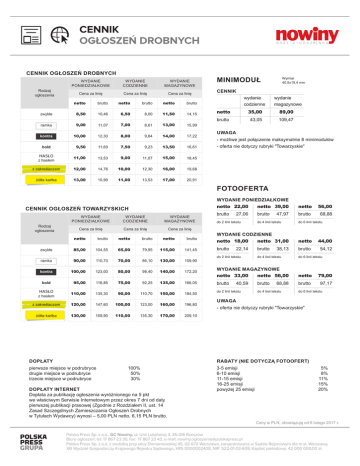 CENNIK OGŁOSZEŃ DROBNYCH CENNIK OGŁOSZEŃ DROBNYCH WYDANIE PONIEDZIAŁKOWE WYDANIE CODZIENNE WYDANIE MAGAZYNOWE Cena za linię Cena za linię Cena za linię MINIMODUŁ Wymiar 40,5x19,4 mm netto brutto netto brutto netto brutto CENNIK zwykłe 8,50 10,46 6,50 8,00 11,50 14,15 netto35,0089,00 ramka 9,00 11,07 7,00 8,61 13,00 15,99 kontra 10,00 12,30 8,00 9,84 14,00 17,22 9,50 11,69 7,50 9,23 13,50 16,61 HASŁO z hasłem 11,00 13,53 9,00 11,07 15,00 18,45 z zakreślaczem 12,00 14,76 10,00 12,30 16,00 19,68 żółta kartka 13,00 15,99 11,00 13,53 17,00 20,91 Rodzaj ogłoszenia bold wydanie codzienne brutto 43,05 wydanie magazynowe 109,47 UWAGA - możliwe jest połączenie maksymalnie 8 minimodułów - oferta nie dotyczy rubryki "Towarzyskie" FOTOOFERTA CENNIK OGŁOSZEŃ TOWARZYSKICH Rodzaj ogłoszenia zwykłe WYDANIE PONIEDZIAŁKOWE WYDANIE CODZIENNE WYDANIE MAGAZYNOWE Cena za linię Cena za linię Cena za linię netto brutto netto brutto netto brutto 85,00 104,55 65,00 79,95 115,00 141,45 WYDANIE PONIEDZIAŁKOWE netto22,00 netto39,00 netto 56,00 brutto brutto 27,06 brutto do 2 linii tekstu 47,97 do 4 linii tekstu 68,88 do 6 linii tekstu WYDANIE CODZIENNE netto18,00 netto31,00 netto 44,00 brutto brutto 22,14 brutto do 2 linii tekstu 38,13 do 4 linii tekstu 54,12 do 6 linii tekstu ramka 90,00 110,70 70,00 86,10 130,00 159,90 kontra 100,00 123,00 80,00 98,40 140,00 172,20 WYDANIE MAGAZYNOWE netto33,00 netto56,00 netto 79,00 95,00 116,85 75,00 92,25 135,00 166,05 brutto brutto HASŁO z hasłem 110,00 135,30 90,00 110,70 150,00 184,50 z zakreślaczem 120,00 147,60 100,00 123,00 160,00 196,80 żółta kartka 130,00 159,90 110,00 135,30 170,00 209,10 bold DOPŁATY 40,59 brutto do 2 linii tekstu 68,88 do 4 linii tekstu 97,17 do 6 linii tekstu UWAGA - oferta nie dotyczy rubryki "Towarzyskie" RABATY (NIE DOTYCZĄ FOTOOFERT) pierwsze miejsce w podrubryce drugie miejsce w podrubryce trzecie miejsce w podrubryce 100% 50% 30% DOPŁATY INTERNET Dopłata za publikację ogłoszenia wyróżnionego na 5 pkt we właściwym Serwisie Internetowym przez okres 7 dni od daty pierwszej publikacji prasowej (Zgodnie z Rozdziałem II, ust. 14 Zasad Szczególnych Zamieszczania Ogłoszeń Drobnych w Tytułach Wydawcy) wynosi – 5,00 PLN netto, 6,15 PLN brutto. 3-5 emisji 6-10 emisji 11-15 emisji 16-25 emisji powyżej 25 emisji 5% 8% 11% 15% 20% Ceny w PLN, obowiązują od 6 lutego 2017 r. Polska Press Sp. z o.o., GC Nowiny, ul. Unii Lubelskiej 3, 35-016 Rzeszów Biuro ogloszeń: tel. 17 867 23 30, fax: 17 867 23 43, e-mail: [email protected] Polska Press Sp. z o.o. z siedzibą przy ulicy Domaniewskiej 45, 02-672 Warszawa, zarejestrowana w Sądzie Rejonowym dla m.st. Warszawy, XIII Wydział Gospodarczy Krajowego Rejestru Sądowego, KRS 0000002408, NIP: 522-01-03-609, Kapitał zakładowy: 42 000 000,00 zł.
