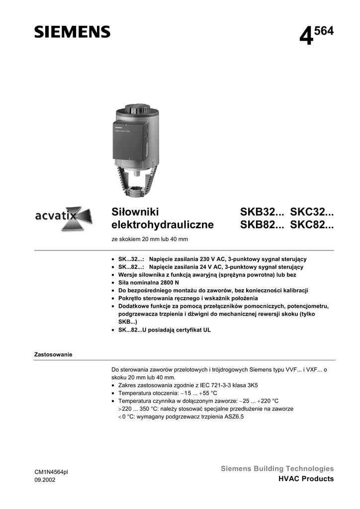 4 564 Siłowniki elektrohydrauliczne SKB32... SKC32... SKB82... SKC82... ze skokiem 20 mm lub 40 mm • • • • • • • SK...32...: Napięcie zasilania 230 V AC, 3-punktowy sygnał sterujący SK...82...: Napięcie zasilania 24 V AC, 3-punktowy sygnał sterujący Wersje siłownika z funkcją awaryjną (sprężyna powrotna) lub bez Siła nominalna 2800 N Do bezpośredniego montażu do zaworów, bez konieczności kalibracji Pokrętło sterowania ręcznego i wskaźnik położenia Dodatkowe funkcje za pomocą przełączników pomocniczych, potencjometru, podgrzewacza trzpienia i dźwigni do mechanicznej rewersji skoku (tylko SKB...) • SK...82...U posiadają certyfikat UL Zastosowanie Do sterowania zaworów przelotowych i trójdrogowych Siemens typu VVF... i VXF... o skoku 20 mm lub 40 mm. • Zakres zastosowania zgodnie z IEC 721-3-3 klasa 3K5 • Temperatura otoczenia: − 1 5 ... + 55 °C • Temperatura czynnika w dołączonym zaworze: − 25 ... + 220 °C > 220 ... 350 °C: należy stosować specjalne przedłużenie na zaworze < 0 °C: wymagany podgrzewacz trzpienia ASZ6.5 CM1N4564pl 09.2002 Siemens Building Technologies HVAC Products Funkcje • • • • • • • • • Siłowniki elektrohydrauliczne, bezobsługowe Pompa, tłok w cylindrze ciśnieniowym do otwierania zaworu Sprężyna powrotna i zawór zwrotny do zamykania zaworu Możliwość wyboru siłownika z funkcją bezpieczeństwa (sprężyną powrotną) wg DIN 32730 lub bez niej Pokrętło sterowania ręcznego i wskaźnik położenia Miejsce do montażu pary przełączników pomocniczych i potencjometru W razie potrzeby można zamocować podgrzewacz trzpienia W razie potrzeby można zainstalować dźwignię do mechanicznej rewersji skoku Siłowniki SK...82...U posiadają certyfikat UL Zestawienie typów SKB... ze skokiem 20 mm Typ Napięcie zasilania Sygnał sterujący SKB32.50 230 V AC 3-stawny Sprężyna powrotna Funkcja Czas Nie ma -- Jest 10 s SKB32.51 SKB82.50 24 V AC Nie ma -- Jest 10 s SKB82.51 SKC... ze skokiem 40 mm SKB82.50U * Nie ma -- SKB82.51U * Jest 10 s Typ Napięcie zasilania Sygnał sterujący SKC32.60 230 V AC 3- stawny Sprężyna powrotna Funkcja Czas Nie ma -- Jest 18 s Nie ma -- SKC32.61 SKC82.60 24 V AC SKC82.61 Jest 18 s SKC82.60U * Nie ma -- SKC82.61U * Jest 18 s Czas przebiegu Otwieranie Zamykanie 120 s 120 s Czas przebiegu Otwieranie Zamykanie 120 s 120 s * wersje z certyfikatem UL Wyposażenie dodatkowe Typ Opis ASC9.3 Para przełączników pomocniczych ASZ7.3 * Potencjometr 1000 Ω ASZ7.31 * Potencjometr 135 Ω ASZ7.32 * Potencjometr 200 Ω ASZ6.5 Podgrzewacz trzpienia 24 V AC ASK51 Dźwignia rewersji skoku (tylko SKB...) * w siłowniku może być zainstalowany tylko jeden potencjometr Zamawianie Przy zamówieniu należy podać ilość, nazwę urządzenia i oznaczenie typu. Przykład: 1 siłownik SKDC2.50 i 1 potencjometr ASZ7.31, 135 Ω Dostawa Siłownik, zawór i elementy wyposażenia dodatkowego dostarczane są w oddzielnych opakowaniach i nie są zmontowane. 2/10 Siemens Building Technologies HVAC Products Siłowniki elektrohydrauliczne CM1N4564pl 09.2002 Urządzenia współpracujące Regulatory Siłowniki mogą być sterowane w instalacjach regulacyjnych z sygnałem zasilającym 24 V AC SELV/PELV (SK...82…) lub 230 V AC (SK...32…) i z 3-stawnym sygnałem sterującym. Zawory liniowe Siłowniki mogą być montowane na następujących zaworach przelotowych i trójdrogowych Siemens o skoku 20 mm lub 40 mm: Zawór DN PN Karta katalogowa Zawory przelotowe VV… (zawory regulacyjne lub odcinające): VVF21... (kołnierzowe) 25 ... 100 mm 6 bar N4310 VVF31... (kołnierzowe) 25 ... 150 mm 10 bar N4320 VVF40... (kołnierzowe) 15 ... 150 mm 16 bar N4330 VVF41... (kołnierzowe) 50 ... 150 mm 16 bar N4340 VVF45... (kołnierzowe) 50 ... 150 mm 16 bar N4345 VVF52... (kołnierzowe) 15 ... 40 mm 25 bar N4373 VVF61... (kołnierzowe) 15 ... 150 mm 40 bar N4382 Zawory trójdrogowe, VX... (zawory regulacyjne mieszające i rozdzielające): VXF21... (kołnierzowe) 25 ... 100 mm 6 bar N4410 VXF31... (kołnierzowe) 25 ... 150 mm 10 bar N4420 VXF40... (kołnierzowe) 15 ... 150 mm 16 bar N4430 VXF41... (kołnierzowe) 15 ... 150 mm 16 bar N4440 VXF61... (kołnierzowe) 15 I 25 mm 40 bar N4482 Dopuszczalne różnice ciśnienia ∆pmax i ciśnienia zamykające ∆ps podane są w kartach katalogowych zaworów. Uwaga Można stosować zawory innych producentów o skoku 6…20 mm (SKB...) i 12...40 mm (SKC...), pod warunkiem, że posiadają one funkcję zamykającą zawór w stanie nie zasilonym oraz wyposażone są w odpowiedni typ złącza dla siłownika. W celu ograniczenia skoku, sygnał Y1 musi być doprowadzony poprzez nastawialny wyłącznik krańcowy (ASC9.3). Niezbędne informacje można uzyskać w lokalnych oddziałach Siemens. Budowa 1 Zasada działania siłowników elektrohydraulicznych 2 4 4 7 6 8 3 5 12 9 10 11 Zawór zamknięty 1 Pokrętło sterowania ręcznego 2 Cylinder ciśnieniowy 3 Tłok 4 Zbiornik 5 Komora ciśnieniowa 6 Pompa 7 Sprężyna powrotna 8 Zawór zwrotny 9 Przyłącze zaworu 10 Trzpień zaworu 11 Zawór wewnętrzny 12 Wskaźnik położenia (0 do 1) Zawór otwarty 3/10 Siemens Building Technologies HVAC Products Siłowniki elektrohydrauliczne CM1N4564pl 09.2002 • Napięcie na Y1: Pompa (6) tłoczy olej hydrauliczny ze zbiornika (4) do komory ciśnieniowej (5) wytwarzając przy tym skok: trzpień zaworu (10) chowa się i grzyb zaworu (11) otwiera się. • Napięcie na Y2: Otwiera się zawór zwrotny (8) przepuszczając olej z komory ciśnieniowej (5) z powrotem do zbiornika (4) pod wpływem sprężyny powrotnej (7). Trzpień zaworu (10) wysuwa się i grzyb zaworu (11) zamyka się. • Brak napięcia na Y1 lub Y2: Siłownik i zawór pozostają w bieżącej pozycji. Funkcja bezpieczeństwa (sprężyna powrotna) Siłowniki SKB32.51, SKB82.51(U), SKC32.61 i SKC82.61(U) wyposażone w sprężynę powrotną, posiadają drugi zawór zwrotny, otwierający się przy zaniku napięcia zasilan