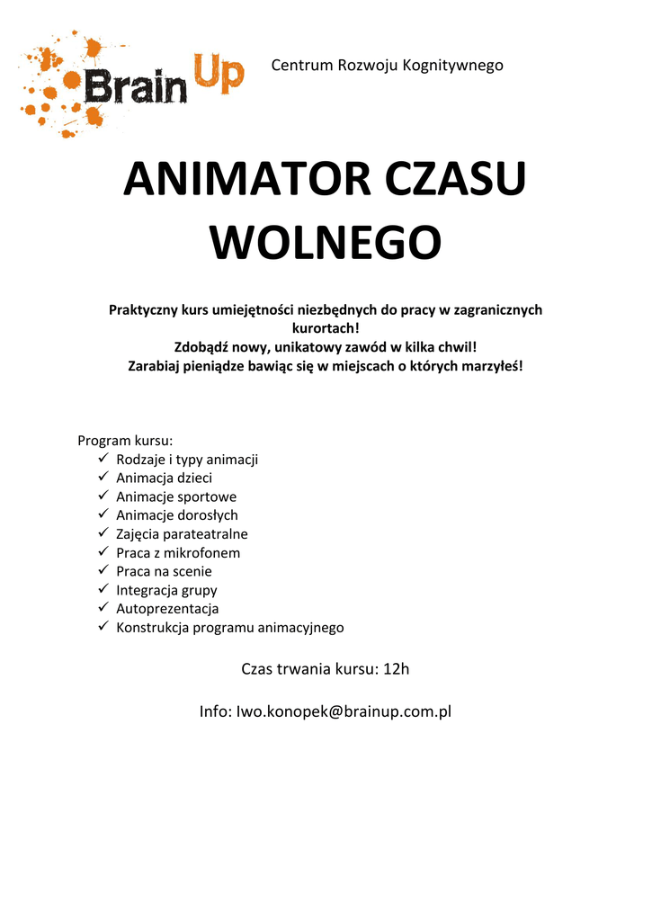 Centrum Rozwoju Kognitywnego ANIMATOR CZASU WOLNEGO Praktyczny kurs umiejętności niezbędnych do pracy w zagranicznych kurortach! Zdobądź nowy, unikatowy zawód w kilka chwil! Zarabiaj pieniądze bawiąc się w miejscach o których marzyłeś! Program kursu: Rodzaje i typy animacji Animacja dzieci Animacje sportowe Animacje dorosłych Zajęcia parateatralne Praca z mikrofonem Praca na scenie Integracja grupy Autoprezentacja Konstrukcja programu animacyjnego Czas trwania kursu: 12h Info: [email protected]