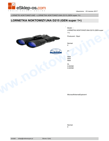 w Utworzono : 03 marzec 2017 LORNETKI NOKTOWIZYJNE > LORNETKA NOKTOWIZYJNA D215 (GEN super 1+) LORNETKA NOKTOWIZYJNA D215 (GEN super 1+) p . e Model : - LORNETKA NOKTOWIZYJNA D215 (GEN super 1+) Producent : Dipol n j y iz Normal 0 21 w o t k o .n false false false PL X-NONE X-NONE w w MicrosoftInternetExplorer4 Normal 0 kontakt : - [email protected] Strona 1/{nb} w Utworzono : 03 marzec 2017 LORNETKI NOKTOWIZYJNE > LORNETKA NOKTOWIZYJNA D215 (GEN super 1+) LORNETKA NOKTOWIZYJNA D215 (GEN super 1+) p . e 21 false false false n j y iz PL X-NONE X-NONE w o t k o .n MicrosoftInternetExplorer4 w w Normal 0 21 false false false PL X-NONE X-NONE kontakt : - [email protected] Strona 2/{nb} w Utworzono : 03 marzec 2017 LORNETKI NOKTOWIZYJNE > LORNETKA NOKTOWIZYJNA D215 (GEN super 1+) LORNETKA NOKTOWIZYJNA D215 (GEN super 1+) p . e n j y iz MicrosoftInternetExplorer4 w o t k o .n w w 150%" class="MsoNormal"> 150%;font-family:"Times New Roman","serif"">Lor netka noktowizyjna Dipol D215 generacji super 1+ posiada wbudowany podświetlacz laserowy z regulacją skupienia wiązki oraz płynną regulacją natężenia podświetlenia. Ergonomiczna i wytrzymała obudowa zabezpiecza wnętrze lornetki i zwiększa wygodę użytkowania urządzenia. Dzięki wbudowanemu emiterowi podczerwieni można prowadzić obserwację nawet w zamkniętych pomieszczeniach, a także miejscach gdzie nie ma dostępu źródeł światła np. od księżyca, czy gwiazd lub też są one mocno ograniczone. Warto wspomnieć też o wbudowanym czujniku, który automatycznie wyłącza urządzenie w przypadku kontaktu z intensywnym źródłem światła. Wygodnie umieszczone przyciski kontakt : - [email protected] Strona 3/{nb} w Utworzono : 03 marzec 2017 LORNETKI NOKTOWIZYJNE > LORNETKA NOKTOWIZYJNA D215 (GEN super 1+) LORNETKA NOKTOWIZYJNA D215 (GEN super 1+) sterowania pozwalają włączyć / wyłączyć szybko i intuicyjnie urządzenie oraz wbudowany iluminator IR. normal">Lornetka Dipol D215 zasilana jest baterią typu CR123A. n j y iz p . e 150%" class="MsoNormal"> 150%;font-family:"Times New Roman","serif"">Da ne techniczne: - generacja: super I+ - ogniskowa: F80 mm - zasięg przy szczątkowym oświetleniu: 250 m - iluminator podczerwieni: tak - powiększenie: 3,5x - waga: 800 g. - czas pracy: 120 godz. - kąt widzenia: 12 st. - zasilanie: CR123A - wymiary: 202x123x72 mm w o t k o .n Elementy zestawu: - lornetka Dipol D215 - futerał - dokumentacja w w Gwarancja 12 miesięcy. DefSemiHidden="true" DefQFormat="false" DefPriority="99" LatentStyleCount="267"> UnhideWhenUsed="false" QFormat="true" Name="Normal" /> UnhideWhenUsed="false" QFormat="true" Name="heading 1" /> kontakt : - [email protected] Strona 4/{nb} w Utworzono : 03 marzec 2017 LORNETKI NOKTOWIZYJNE > LORNETKA NOKTOWIZYJNA D215 (GEN super 1+) LORNETKA NOKTOWIZYJNA D215 (GEN super 1+) n j y iz p . e UnhideWhenUsed="false" QFormat="true" Name="Title" /> UnhideWhenUsed="false" QFormat="true" Name="Subtitle" /> w o t k o .n UnhideWhenUsed="false" QFormat="true" Name="Strong" /> UnhideWhenUsed="false" QFormat="true" Name="Emphasis" /> UnhideWhenUsed="false" Name="Table Grid" /> UnhideWhenUsed="false" QFormat="true" Name="No Spacing" /> w w UnhideWhenUsed="false" Name="Light Shading" /> UnhideWhenUsed="false" Name="Light List" /> UnhideWhenUsed="false" Name="Light Grid" /> UnhideWhenUsed="false" Name="Medium Shading 1" /> UnhideWhenUsed="false" Name="Medium Shading 2" /> UnhideWhenUsed="false" Name="Medium List 1" /> UnhideWhenUsed="false" Name="Medium List 2" /> UnhideWhenUsed="false" Name="Medium Grid 1" /> UnhideWhenUsed="false" Name="Medium Grid 2" /> kontakt : - [email protected] Strona 5/{nb} w Utworzono : 03 marzec 2017 LORNETKI NOKTOWIZYJNE > LORNETKA NOKTOWIZYJNA D215 (GEN super 1+) LORNETKA NOKTOWIZYJNA D215 (GEN super 1+) p . e UnhideWhenUsed="false" Name="Medium Grid 3" /> UnhideWhenUsed="false" Name="Dark List" /> n j y iz UnhideWhenUsed="false" Name="Colorful Shading" /> UnhideWhenUsed="false" Name="Colorful List" /> UnhideWhenUsed="false" Name="Colorful Grid" /> w o t k o .n UnhideWhenUsed="false" Name="Light Shading Accent 1" /> UnhideWhenUsed="false" Name="Light List Accent 1" /> UnhideWhenUsed="false" Name="Light Grid Accent 1" /> UnhideWhenUsed="false" Name="Medium Shading 1 Accent 1" /> w w UnhideWhenUsed="false" Name="Medium Shading 2 Accent 1" /> UnhideWhenUsed="false" Name="Medium List 1 Accent 1" /> UnhideWhenUsed="false" QFormat="true" Name="List Paragraph" /> UnhideWhenUsed="false" QFormat="true" Name="Quote" /> UnhideWhenUsed="false" QFormat="true" Name="Intense Quote" /> UnhideWhenUsed="false" Name="Medium List 2 Accent 1" /> UnhideWhenUsed="false" Name="Medium Grid 1 Accent 1" /> UnhideWhenUsed="false" kontakt : - [email protected] Strona 6/{nb} w Utworzono : 03 marzec 2017 LORNETKI NOKTOWIZYJNE > LORNETKA NOKTOWIZYJNA D215 (GEN super 1+) LORNETKA NOKTOWIZYJNA D215 (GEN super 1+) p . e Name="Medium Grid 2 Accent 1" /> UnhideWhenUsed="false" Name="Medium Grid 3 Accent 1" /> n j y iz UnhideWhenUsed="false" Name="Dark List Accent 1" /> UnhideWhenUsed="false" Name="Colorful Shading Accent 1" /> UnhideWhenUsed="false" Name="Colorful List Accent 1" /> w o t k o .n UnhideWhenUsed="false" Name="Colorful Grid Accent 1" /> UnhideWhenUsed="false" Name="Light Shading Accent 2" /> UnhideWhenUsed="false" Name="Light List Accent 2" /> UnhideWhenUsed="false" Name="Light Grid Accent 2" /> w w UnhideWhenUsed="false" Name="Medium Shading 1 Accent 2" /> UnhideWhenUsed="false" Name="Medium Shading 2 Accent 2" /> UnhideWhenUsed="false" Name="Medium List 1 Accent 2" /> UnhideWhenUsed="false" Name="Medium List 2 Accent 2" /> UnhideWhenUsed="false" Name="Medium Grid 1 Accent 2" /> UnhideWhenUsed="false" Name="Medium Grid 2 Accent 2" /> UnhideWhenUsed="false" Name="Medium Grid 3 Accent 2" /> UnhideWhenUsed="false" Name="Dark List Accent 2" /> UnhideWhenUsed="false" Name="Colorful Shading Accent 2" kontakt : - [email protected] Strona 7/{nb} w Utworzono : 03 marzec 2017 LORNETK