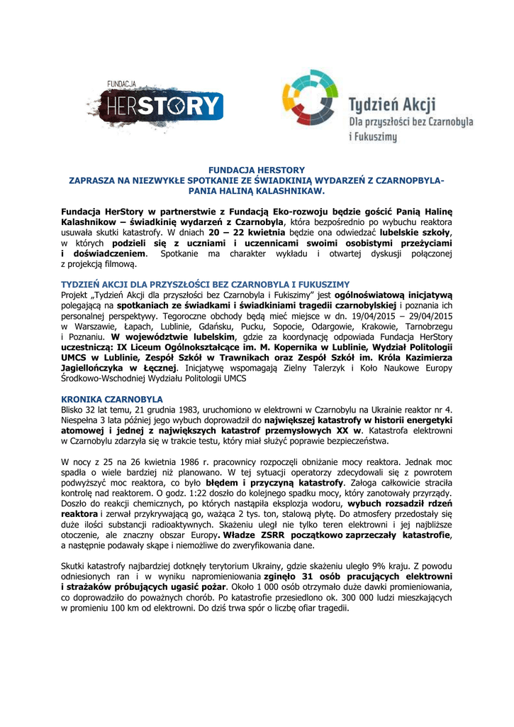 FUNDACJA HERSTORY ZAPRASZA NA NIEZWYKŁE SPOTKANIE ZE ŚWIADKINIĄ WYDARZEŃ Z CZARNOPBYLAPANIA HALINĄ KALASHNIKAW. Fundacja HerStory w partnerstwie z Fundacją Eko-rozwoju będzie gościć Panią Halinę Kalashnikow – świadkinię wydarzeń z Czarnobyla, która bezpośrednio po wybuchu reaktora usuwała skutki katastrofy. W dniach 20 – 22 kwietnia będzie ona odwiedzać lubelskie szkoły, w których podzieli się z uczniami i uczennicami swoimi osobistymi przeżyciami i doświadczeniem. Spotkanie ma charakter wykładu i otwartej dyskusji połączonej z projekcją filmową. TYDZIEŃ AKCJI DLA PRZYSZŁOŚCI BEZ CZARNOBYLA I FUKUSZIMY Projekt „Tydzień Akcji dla przyszłości bez Czarnobyla i Fukiszimy” jest ogólnoświatową inicjatywą polegającą na spotkaniach ze świadkami i świadkiniami tragedii czarnobylskiej i poznania ich personalnej perspektywy. Tegoroczne obchody będą mieć miejsce w dn. 19/04/2015 – 29/04/2015 w Warszawie, Łapach, Lublinie, Gdańsku, Pucku, Sopocie, Odargowie, Krakowie, Tarnobrzegu i Poznaniu. W województwie lubelskim, gdzie za koordynację odpowiada Fundacja HerStory uczestniczą: IX Liceum Ogólnokształcące im. M. Kopernika w Lublinie, Wydział Politologii UMCS w Lublinie, Zespół Szkół w Trawnikach oraz Zespół Szkół im. Króla Kazimierza Jagiellończyka w Łęcznej. Inicjatywę wspomagają Zielny Talerzyk i Koło Naukowe Europy Środkowo-Wschodniej Wydziału Politologii UMCS KRONIKA CZARNOBYLA Blisko 32 lat temu, 21 grudnia 1983, uruchomiono w elektrowni w Czarnobylu na Ukrainie reaktor nr 4. Niespełna 3 lata później jego wybuch doprowadził do największej katastrofy w historii energetyki atomowej i jednej z największych katastrof przemysłowych XX w. Katastrofa elektrowni w Czarnobylu zdarzyła się w trakcie testu, który miał służyć poprawie bezpieczeństwa. W nocy z 25 na 26 kwietnia 1986 r. pracownicy rozpoczęli obniżanie mocy reaktora. Jednak moc spadła o wiele bardziej niż planowano. W tej sytuacji operatorzy zdecydowali się z powrotem podwyższyć moc reaktora, co było błędem i przyczyną katastrofy. Załoga całkowicie straciła kontrolę nad reaktorem. O godz. 1:22 doszło do kolejnego spadku mocy, który zanotowały przyrządy. Doszło do reakcji chemicznych, po których nastąpiła eksplozja wodoru, wybuch rozsadził rdzeń reaktora i zerwał przykrywającą go, ważąca 2 tys. ton, stalową płytę. Do atmosfery przedostały się duże ilości substancji radioaktywnych. Skażeniu uległ nie tylko teren elektrowni i jej najbliższe otoczenie, ale znaczny obszar Europy. Władze ZSRR początkowo zaprzeczały katastrofie, a następnie podawały skąpe i niemożliwe do zweryfikowania dane. Skutki katastrofy najbardziej dotknęły terytorium Ukrainy, gdzie skażeniu uległo 9% kraju. Z powodu odniesionych ran i w wyniku napromieniowania zginęło 31 osób pracujących elektrowni i strażaków próbujących ugasić pożar. Około 1 000 osób otrzymało duże dawki promieniowania, co doprowadziło do poważnych chorób. Po katastrofie przesiedlono ok. 300 000 ludzi mieszkających w promieniu 100 km od elektrowni. Do dziś trwa spór o liczbę ofiar tragedii. OCZAMI ŚWAIDKINI Pani Halina Kalashnikaw (ur. 26/02/1958 w obwodzie grodzieńskim) ukończyła Białoruski Państwowy Uniwersytet w Mińsku i po studiach podjęła pracę jako nauczycielka i sekretarka w szkole rolniczej w miejscowości Narowla (na granicy z Ukrainą, 40 km od Czarnobyla). Od 1992 r. mieszka w Mińsku, gdzie pracuje jako Dyrektor szkoły. Narowl – niewielka, spokojna i malowniczą miejscowość w obwodzie homelskim. Ciekawym jest, że przed katastrofą grono nauczycielskie oraz młodzież szkoły rolniczej z Narowli utrzymywali kontakty z przedstawicielstwem czarnobylskiej elektrowni odwiedzając m.in. „słynny” blok 4. Dowód tego stanowi zdjęcie Pani H. Kalashnikow z terenu elektrowni. Pani Halina o wybuchu dowiedziała się przypadkiem, od spotkanej w podróży do miasta Homel byłej uczennicy, było to ponad 2 tygodnie po tym jak reaktor wybuchł. Informacja ta była dla Pani Haliny prawdziwie szokująca. Kiedy sprawa katastrofy wyszła na jaw młodzież oraz grono nauczycielskie z narowlskiej szkoły ewakuowana w ciągu jednej nocy, docelowo do nadczarnomorskiego kurortu – do Narowli powrócili pod koniec sierpnia 1986 r. Niebawem po ich przyjeździe pojawiło się wojsko, które zaangażowało kadrę szkody do likwidowania szkód po wybuchu. Pani Halina wyszła za mąż w 1990 r., cztery lata później urodziła córkę – ta niestety cierpiała na schorzenia układu pokarmowego i wzroku. Obecnie obie działają w sektorze edukacji w Mińsku – są pedagożkami i nauczycielkami. Pani Halina otrzymała niewspółmiernie małe wsparcie wobec poniesionych strat – w początkowej fazie były to m.in. zniżki na wybrane linie komunikacji miejskiej, opieka medyczna, która z czasem została zniesiona. HARMONOGRAM 1. Miejsce Zespół Szkół im. Króla Kazimierza Jagiellończyka 2. Wydział Politologii UMCS 3. IX Liceum Ogólnokształcące Mikołaja Kopernika Zespół Szkół w Trawnikach 4. im. Termin 21/04/2015, godz. 9.40 – 10.25, 10.35 11.20 21/04/2015, godz. 15.00 16.30, sala 109 22/02/2015, godz. 8.20 9.05, 9.10 – 9.55 22/04/2015, godz. 12.30 13.15 – – – – Adres ul. Bogdanowicza 9, 21 – 10 Łęczna pl. Litewski 5, 20-080 Lublin ul. A. Struga 6, 20 – 709 Lublin Trawniki 263, 21 – 044 Trawniki FUNDACJA HERSTORY Fundacja HerStory to lubelska organizacja pozarządowa działająca w obszarze równości, różnorodności, antydyskryminacji, wielokulturowości i praw człowieka. Powstała w marcu 2014 r. z inicjatywy dwóch aktywistek: Katarzyny Zabratańskiej i Leny Bielskiej. Fundacja podejmuje działania na rzecz grup mniejszościowych, defaworyzowanych i wykluczonych, przeciwdziała dyskryminacji ze względu na płeć, poglądy polityczne i inne, rasę, kolor skóry, pochodzenie narodowe i etniczne, religię