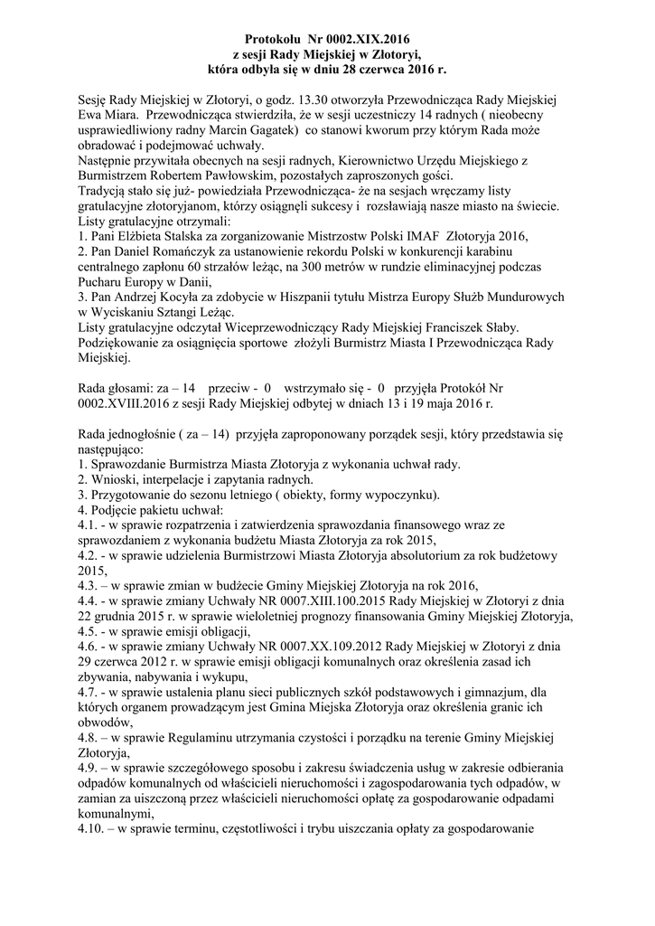 Protokołu Nr 0002.XIX.2016 z sesji Rady Miejskiej w Złotoryi, która odbyła się w dniu 28 czerwca 2016 r. Sesję Rady Miejskiej w Złotoryi, o godz. 13.30 otworzyła Przewodnicząca Rady Miejskiej Ewa Miara. Przewodnicząca stwierdziła, że w sesji uczestniczy 14 radnych ( nieobecny usprawiedliwiony radny Marcin Gagatek) co stanowi kworum przy którym Rada może obradować i podejmować uchwały. Następnie przywitała obecnych na sesji radnych, Kierownictwo Urzędu Miejskiego z Burmistrzem Robertem Pawłowskim, pozostałych zaproszonych gości. Tradycją stało się już- powiedziała Przewodnicząca- że na sesjach wręczamy listy gratulacyjne złotoryjanom, którzy osiągnęli sukcesy i rozsławiają nasze miasto na świecie. Listy gratulacyjne otrzymali: 1. Pani Elżbieta Stalska za zorganizowanie Mistrzostw Polski IMAF Złotoryja 2016, 2. Pan Daniel Romańczyk za ustanowienie rekordu Polski w konkurencji karabinu centralnego zapłonu 60 strzałów leżąc, na 300 metrów w rundzie eliminacyjnej podczas Pucharu Europy w Danii, 3. Pan Andrzej Kocyła za zdobycie w Hiszpanii tytułu Mistrza Europy Służb Mundurowych w Wyciskaniu Sztangi Leżąc. Listy gratulacyjne odczytał Wiceprzewodniczący Rady Miejskiej Franciszek Słaby. Podziękowanie za osiągnięcia sportowe złożyli Burmistrz Miasta I Przewodnicząca Rady Miejskiej. Rada głosami: za – 14 przeciw - 0 wstrzymało się - 0 przyjęła Protokół Nr 0002.XVIII.2016 z sesji Rady Miejskiej odbytej w dniach 13 i 19 maja 2016 r. Rada jednogłośnie ( za – 14) przyjęła zaproponowany porządek sesji, który przedstawia się następująco: 1. Sprawozdanie Burmistrza Miasta Złotoryja z wykonania uchwał rady. 2. Wnioski, interpelacje i zapytania radnych. 3. Przygotowanie do sezonu letniego ( obiekty, formy wypoczynku). 4. Podjęcie pakietu uchwał: 4.1. - w sprawie rozpatrzenia i zatwierdzenia sprawozdania finansowego wraz ze sprawozdaniem z wykonania budżetu Miasta Złotoryja za rok 2015, 4.2. - w sprawie udzielenia Burmistrzowi Miasta Złotoryja absolutorium za rok budżetowy 2015, 4.3. – w sprawie zmian w budżecie Gminy Miejskiej Złotoryja na rok 2016, 4.4. - w sprawie zmiany Uchwały NR 0007.XIII.100.2015 Rady Miejskiej w Złotoryi z dnia 22 grudnia 2015 r. w sprawie wieloletniej prognozy finansowania Gminy Miejskiej Złotoryja, 4.5. - w sprawie emisji obligacji, 4.6. - w sprawie zmiany Uchwały NR 0007.XX.109.2012 Rady Miejskiej w Złotoryi z dnia 29 czerwca 2012 r. w sprawie emisji obligacji komunalnych oraz określenia zasad ich zbywania, nabywania i wykupu, 4.7. - w sprawie ustalenia planu sieci publicznych szkół podstawowych i gimnazjum, dla których organem prowadzącym jest Gmina Miejska Złotoryja oraz określenia granic ich obwodów, 4.8. – w sprawie Regulaminu utrzymania czystości i porządku na terenie Gminy Miejskiej Złotoryja, 4.9. – w sprawie szczegółowego sposobu i zakresu świadczenia usług w zakresie odbierania odpadów komunalnych od właścicieli nieruchomości i zagospodarowania tych odpadów, w zamian za uiszczoną przez właścicieli nieruchomości opłatę za gospodarowanie odpadami komunalnymi, 4.10. – w sprawie terminu, częstotliwości i trybu uiszczania opłaty za gospodarowanie odpadami komunalnymi, 4.11. – w sprawie ogłoszenia tekstu jednolitego Statutu Miejskiego Ośrodka Pomocy Społecznej w Złotoryi, 4.12. – w sprawie zlecenia rozpatrzenia skargi na działalność Burmistrza Miasta Złotoryja, 4.13. – w sprawie nadania tytułu Honorowego Obywatela Miasta Złotoryja, 4.14. – w sprawie nadania tytułu Honorowego Obywatela Miasta Złotoryja, 4.15. – w sprawie nadania tytułu Honorowego Obywatela Miasta Złotoryja, 4.16. – w sprawie nadania tytułu Honorowego Obywatela Miasta Złotoryja. 5. Odpowiedzi na wnioski, interpelacje i zapytania radnych. 6. Sprawy różne. AD. 1 - SPRAWOZDANIE BURMISTRZA MIASTA ZŁOTORYJA Z WYKONANIA UCHWAŁ RADY. Z upoważnienia Burmistrza Miasta , sprawozdanie z realizacji uchwał podjętych na poprzedniej sesji Rady złożył Sekretarz Miasta Włodzimierz Bajoński. Poinformował, że 4 uchwały dotyczące budżetu są realizowane na bieżąco, były po sesji przesłane do Wojewody i RIO. Dwie uchwały dotyczące uporządkowania obwodów głosowania i okręgów wyborczych są opublikowane w Dzienniku Urzędowym Województwa Dolnośląskiego. Sprawozdanie z pracy Urzędu Miejskiego w okresie między sesjami Rady stanowi załącznik do protokołu. AD. 2 – WNIOSKI, INTERPELACJE I ZAPYTANIA RADNYCH. Radni zgłosili następujące sprawy: Radny Leszek Antonowicz - podziękował Burmistrzowi Miasta za spełnienie prośby mieszkańców ul. Górniczej t.j. za trwałe umocowanie studzienek kanalizacyjnych. 1. Na ul. Górniczej naprzeciw ul. Kaczawskiej 2 lampa świeci w sposób przerywany, 2. Jest propozycja wykonania progu spowalniającego na ul. Górniczej. Odcinek drogi jest prosty i samochody jeżdżą tam bardzo szybko, 3. Czy modernizacja ul. W.Polskiego obejmuje też modernizację sieci burzowo – kanalizacyjnej? Na terenie przy garażach konieczna jest dodatkowa studzienka, podczas ulewnych deszczów obecna studzienka wybija wodę. Radny Dariusz Dobosz - zwrócił się z prośbą o pisemną informację na temat spotkania Burmistrza z mieszkańcami ul. Bukowej. Radny Józef Banaszek : 1. Mieszkańcy miasta pytają czy będzie ustawiona Brama Jubileuszowa. 2. Czy sprawa rury ściekowej na ul. Staszica została załatwiona? 3. Dostrzegam, że studzienki ściekowe są nieregularnie czyszczone. Chodzi o ul. Krzywoustego. Na interwencję 1 studzienkę oczyszczono, pozostałe są zamulone. Powinien być harmonogram prac w tym zakresie. Radny Leszek Antonowicz zwrócił uwagę na: 1. Stan skrzynki energetycznej przy tablicach koło kościoła, jest skorodowana, stwarza zagrożenie, 2. Z budynku, w którym znajduje się sklep z dewocjonaliami odpadł kawałek tynku, jest niebezpiecznie. Radny Franciszek Słaby - zaproponował aby zlikwidowa