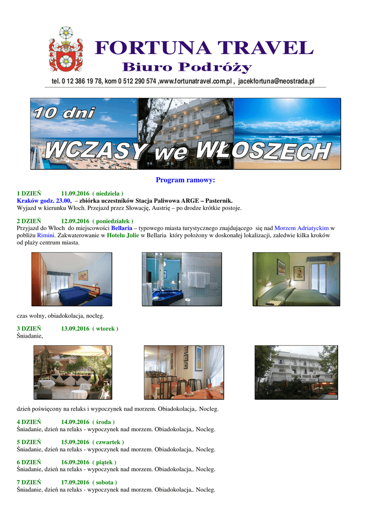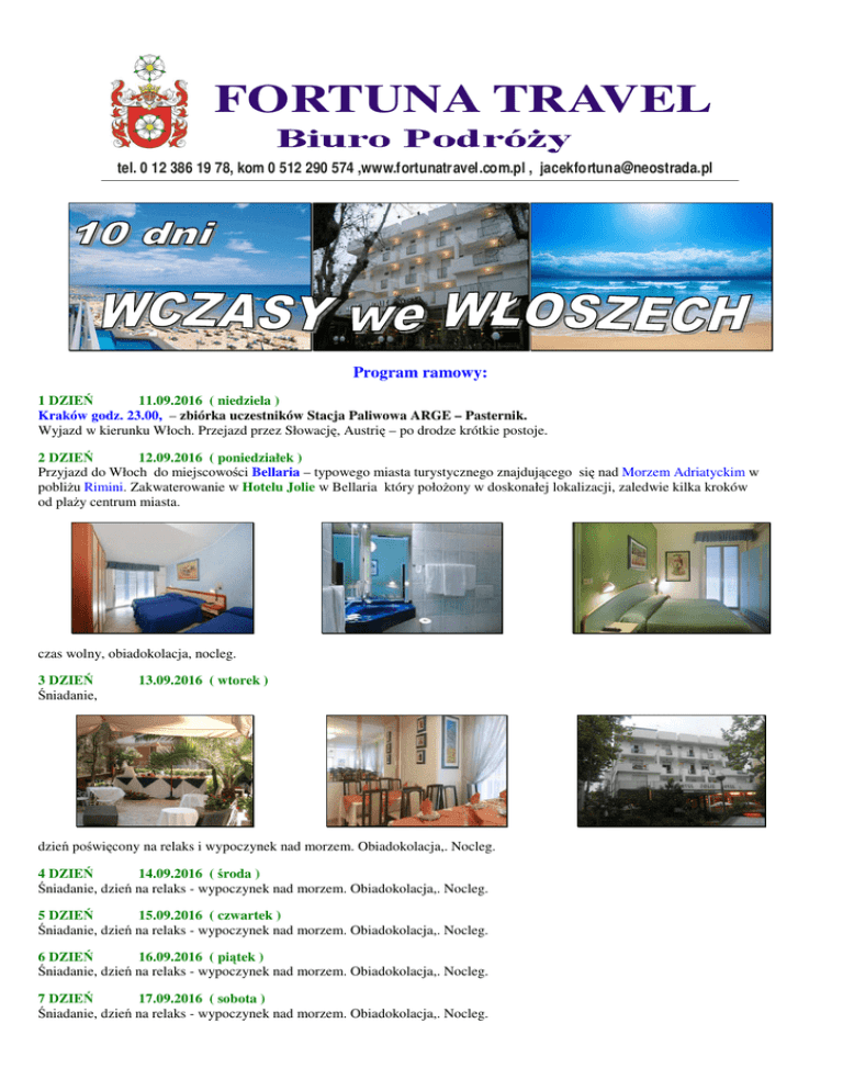 FORTUNA TRAVEL tel. 0 12 386 19 78, kom 0 512 290 574 ,www.fortunatravel.com.pl , [email protected] Program ramowy: 1 DZIEŃ 11.09.2016 ( niedziela ) Kraków godz. 23.00, – zbiórka uczestników Stacja Paliwowa ARGE – Pasternik. Wyjazd w kierunku Włoch. Przejazd przez Słowację, Austrię – po drodze krótkie postoje. 2 DZIEŃ 12.09.2016 ( poniedziałek ) Przyjazd do Włoch do miejscowości Bellaria – typowego miasta turystycznego znajdującego się nad Morzem Adriatyckim w pobliżu Rimini. Zakwaterowanie w Hotelu Jolie w Bellaria który położony w doskonałej lokalizacji, zaledwie kilka kroków od plaży centrum miasta. czas wolny, obiadokolacja, nocleg. 3 DZIEŃ Śniadanie, 13.09.2016 ( wtorek ) dzień poświęcony na relaks i wypoczynek nad morzem. Obiadokolacja,. Nocleg. 4 DZIEŃ 14.09.2016 ( środa ) Śniadanie, dzień na relaks - wypoczynek nad morzem. Obiadokolacja,. Nocleg. 5 DZIEŃ 15.09.2016 ( czwartek ) Śniadanie, dzień na relaks - wypoczynek nad morzem. Obiadokolacja,. Nocleg. 6 DZIEŃ 16.09.2016 ( piątek ) Śniadanie, dzień na relaks - wypoczynek nad morzem. Obiadokolacja,. Nocleg. 7 DZIEŃ 17.09.2016 ( sobota ) Śniadanie, dzień na relaks - wypoczynek nad morzem. Obiadokolacja,. Nocleg. 8 DZIEŃ 18.09.2016 ( niedziela ) Śniadanie, dzień na relaks - wypoczynek nad morzem. Obiadokolacja,. Nocleg. 9 DZIEŃ 19.09.2016 ( niedziela ) Po śniadaniu wykwaterowanie wyjazd w drogę powrotną do Polski. 10 DZIEŃ 20.09.2016 ( poniedziałek ) Powrót do Krakowa w godzinach rannych. Cena : 1.290,00 zł / osoba - przy udziale 40 uczestników obejmuje: - przejazd autokarem (WC, barek, klimatyzacja, video) - zakwaterowanie : 7 noclegów w hotelu, pokoje: 2 i 3 os. z łazienkami. (TV, telefon, sejf i klimatyzację, balkon.) - wyżywienie: 7 śniadań, 7 obiadokolacji, Napoje do obiadokolacji dodatkowo płatne. - ubezpieczenie KL, NNW - usługa pilota. Zniżki - Dziecko do 2 do 4 lat na dostawce przy dwóch osobach dorosłych – 625,00 zł - Dziecko od 5 do 9 lat na dostawce przy zakwaterowanych dwóch osobach dorosłych – 1.000,00 zł Wyposażenie : restauracja główna, aperitif bar, sejf, mini club, parking. Plaża : naturalnie piaszczysta w odległości ok. 75 m, odpowiednia dla dzieci. Pokoje : duże, przestronne wyposażone są w liczne udogodnienia, aby zaspokoić wszystkie potrzeby i zapewnić gościom spokojny sen. Wyposażone w TV, telefon, sejf i klimatyzację, większość pokoi posiada balkony, a niektóre pokoje mają widok na morze. Sport : siatkówka plażowa, animacje, aerobic, sporty wodne, w pobliżu paintball UWAGA : Taksa klimatyczna płatna – 10,00 Euro / osoba ( obligatoryjnie ) Wycieczki fakultatywne do wyboru terminy ustalane na bieżąco ; FLORENACJA zwiedzanie stolicy Toskanii - Kościół Santa Croce, Katedra Santa Maria del Fiore, Wieża Giotta, Most Ponte Vecchio. San Marino - jest jednym z najmniejszych państw świata (w dodatku w całości otoczonym innym państwem) i najstarszą nieprzerwanie istniejącą republiką. Fascynujące krajobrazy, imponujące zamki, ciekawe zabytki, wąskie, kręte i strome uliczki, malownicze domy urzekające swym średniowiecznym stylem. Świetna okazja na zakupy w licznych sklepach m. in. ze słynnymi likierami, winami i perfumami. Italia w miniaturze - park tematyczny z modelami najsłynniejszych włoskich i europejskich budowli. Na otwartej przestrzeni, wśród pięknie zaprojektowanej zieleni, znajdziecie ich tu ponad 270. Jeśli nie poznaliście jeszcze prawdziwej Padwy, Werony czy Wenecji, tutaj możecie zobaczyć najpiękniejsze budynki zakątki tych miast. Asyż - miejsce pochodzenia i działania Świętego Franciszka z Asyżu – włoskiego duchownego katolickiego, diakona, założyciela zakonu franciszkanów, misjonarza, mistyka średniowiecznego, stygmatyka. Święty katolicki, uważany za prekursora ekologii. Ogólne zwiedzanie: Bazylika Św. Franciszka, Kościół Św. Klary - współzałożycielki Klarysek. Święta Delfinarium - jedną z atrakcji pobytu w Rimini jest Delfinarium z miniaturowym oceanarium. Półgodzinne pokazy z udziałem delfinów odbywają się kilka razy dziennie. Wjazd do Czech, Austrii i Włoch tylko na podstawie ważnego Dowodu Osobistego lub Paszportu