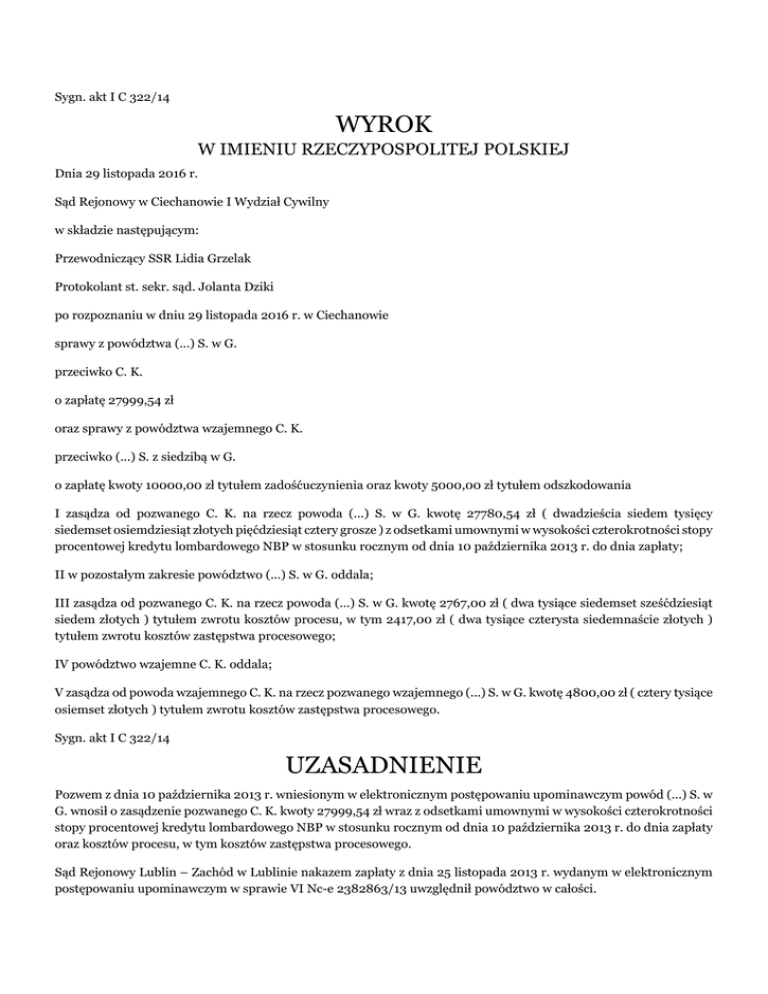Sygn. akt I C 322/14 WYROK W IMIENIU RZECZYPOSPOLITEJ POLSKIEJ Dnia 29 listopada 2016 r. Sąd Rejonowy w Ciechanowie I Wydział Cywilny w składzie następującym: Przewodniczący SSR Lidia Grzelak Protokolant st. sekr. sąd. Jolanta Dziki po rozpoznaniu w dniu 29 listopada 2016 r. w Ciechanowie sprawy z powództwa (...) S. w G. przeciwko C. K. o zapłatę 27999,54 zł oraz sprawy z powództwa wzajemnego C. K. przeciwko (...) S. z siedzibą w G. o zapłatę kwoty 10000,00 zł tytułem zadośćuczynienia oraz kwoty 5000,00 zł tytułem odszkodowania I zasądza od pozwanego C. K. na rzecz powoda (...) S. w G. kwotę 27780,54 zł ( dwadzieścia siedem tysięcy siedemset osiemdziesiąt złotych pięćdziesiąt cztery grosze ) z odsetkami umownymi w wysokości czterokrotności stopy procentowej kredytu lombardowego NBP w stosunku rocznym od dnia 10 października 2013 r. do dnia zapłaty; II w pozostałym zakresie powództwo (...) S. w G. oddala; III zasądza od pozwanego C. K. na rzecz powoda (...) S. w G. kwotę 2767,00 zł ( dwa tysiące siedemset sześćdziesiąt siedem złotych ) tytułem zwrotu kosztów procesu, w tym 2417,00 zł ( dwa tysiące czterysta siedemnaście złotych ) tytułem zwrotu kosztów zastępstwa procesowego; IV powództwo wzajemne C. K. oddala; V zasądza od powoda wzajemnego C. K. na rzecz pozwanego wzajemnego (...) S. w G. kwotę 4800,00 zł ( cztery tysiące osiemset złotych ) tytułem zwrotu kosztów zastępstwa procesowego. Sygn. akt I C 322/14 UZASADNIENIE Pozwem z dnia 10 października 2013 r. wniesionym w elektronicznym postępowaniu upominawczym powód (...) S. w G. wnosił o zasądzenie pozwanego C. K. kwoty 27999,54 zł wraz z odsetkami umownymi w wysokości czterokrotności stopy procentowej kredytu lombardowego NBP w stosunku rocznym od dnia 10 października 2013 r. do dnia zapłaty oraz kosztów procesu, w tym kosztów zastępstwa procesowego. Sąd Rejonowy Lublin – Zachód w Lublinie nakazem zapłaty z dnia 25 listopada 2013 r. wydanym w elektronicznym postępowaniu upominawczym w sprawie VI Nc-e 2382863/13 uwzględnił powództwo w całości. Od powyższego nakazu zapłaty pozwany C. K. wniósł sprzeciw. Postanowieniem z dnia 3 lutego 2014 r. Sąd Rejonowy Lublin – Zachód w Lublinie przekazał sprawę do rozpoznania Sądowi Rejonowemu w Ciechanowie. W korespondencji z dnia 23 kwietnia 2014 r. ( data stempla operatora pocztowego ) powód uzupełnił braki pozwu złożonego w elektronicznym postepowaniu upominawczym. Pozwany C. K. wnosił o odrzucenie pozwu lub jego oddalenie na wypadek nieuwzględnienia wniosku o odrzucenie pozwu. Wniósł ponadto w dniu 12 lutego 2016 r. ( data stempla operatora pocztowego ) pozew wzajemny o zasądzenie na jego rzecz od pozwanego wzajemnego (...) S. w G. kwoty 10000,00 zł tytułem zadośćuczynienia oraz kwoty 5000,00 zł tytułem odszkodowania; wnosił ponadto o zasądzenie na jego rzecz zwrotu kosztów procesu. Postanowieniem z dnia 9 czerwca 2016 r. Sąd Rejonowy w Ciechanowie zwolnił C. K. od kosztów sądowych w obu sprawach. Pozwany wzajemny (...) S. w G. wnosił o oddalenie powództwa wzajemnego, podtrzymując jednocześnie własne żądanie pozwu; wniósł ponadto o zasądzenie zwrotu kosztów procesu, w tym kosztów zastępstwa procesowego. Prawomocnym postanowieniem z dnia 14 czerwca 2016 r. Sąd odmówił odrzucenia pozwu. Sąd Rejonowy ustalił następujący stan faktyczny: W dniu 25 stycznia 2012 r. C. K. ( nr członkowski (...) ) zawarł ze (...) S. w G. ( w skrócie: (...) ) umowę pożyczki nr (...). Była to pożyczka konsolidacyjna przeznaczona na spłatę wcześniejszych zobowiązań finansowych C. K.. Zgodnie z przedmiotową umową (...) udzielił C. K. pożyczki w wysokości 31200,00 zł na okres od 25 stycznia 2012 r. do 20 stycznia 2017 r. na warunkach określonych w umowie oraz regulaminie udzielania kredytów i pożyczek konsumenckich (...). Pożyczka oprocentowana została według zmiennej procentowej ustalonej przez Zarząd Kasy wynoszącej w dniu zawarcia umowy 18,35 %. Rzeczywista roczna stopa oprocentowania ( (...) ) wynosiła 25,5 %, a całkowita kwota do zapłaty w dniu zawarcia umowy wynosiła 50609,80 zł. Pożyczkobiorca zobowiązał się do spłaty pożyczki wraz z należnymi odsetkami w 60 ratach miesięcznych, zaś termin ostatecznej spłaty ustalony został na dzień 20 stycznia 2017 r. Zgodnie z pkt 23 zd. 1 w przypadku nieterminowej spłaty pożyczki należności z tego tytułu stawały się w dniu następnym należnościami przeterminowanymi, których roczna stopa oprocentowania wynosiła czterokrotność stopy kredytu lombardowego NBP. Natomiast zgodnie z pkt 23 zd. 2 umowy od niespłaconego w całości lub w części kapitału, a od dnia wniesienia powództwa od całości zadłużenia, pobierane są odsetki w wysokości czterokrotności stopy procentowej kredytu lombardowego NBP w stosunku rocznym. (...) przysługiwało prawo do wypowiedzenia umowy z 30 - dniowym terminem wypowiedzenia w przypadku stwierdzenia, że warunki udzielania pożyczki nie zostały dotrzymane, a także w przypadku gdy pożyczkobiorca nie zapłacił w terminach określonych w umowie pełnych rat pożyczki za co najmniej 2 okresy płatności, po uprzednim wezwaniu pożyczkobiorcy listem poleconym do zapłaty rat w terminie nie krótszym niż 7 dni od otrzymania wezwania, pod rygorem wypowiedzenie umowy. Po upływie terminu wypowiedzenia umowa uległa rozwiązaniu, co oznaczało postawienie całej pożyczki wraz z odsetkami w stan natychmiastowej wymagalności i konieczność spłaty zadłużania w terminie określonym przez pożyczkodawcę. Umowa oraz regulamin uprawniały również pożyczkodawcę do pobierania prowizji i opłat za czynności związane z udzieleniem i obsługą pożyczki oraz czynnościami windykacyjnymi. W pkt 22 umowy pożyczki strony ustaliły, iż w przypadku zaległości w spłacie pożyczki, pożyczkobiorczyni będzie zobowiązana do uiszczenia na rzecz (...) opłat za c