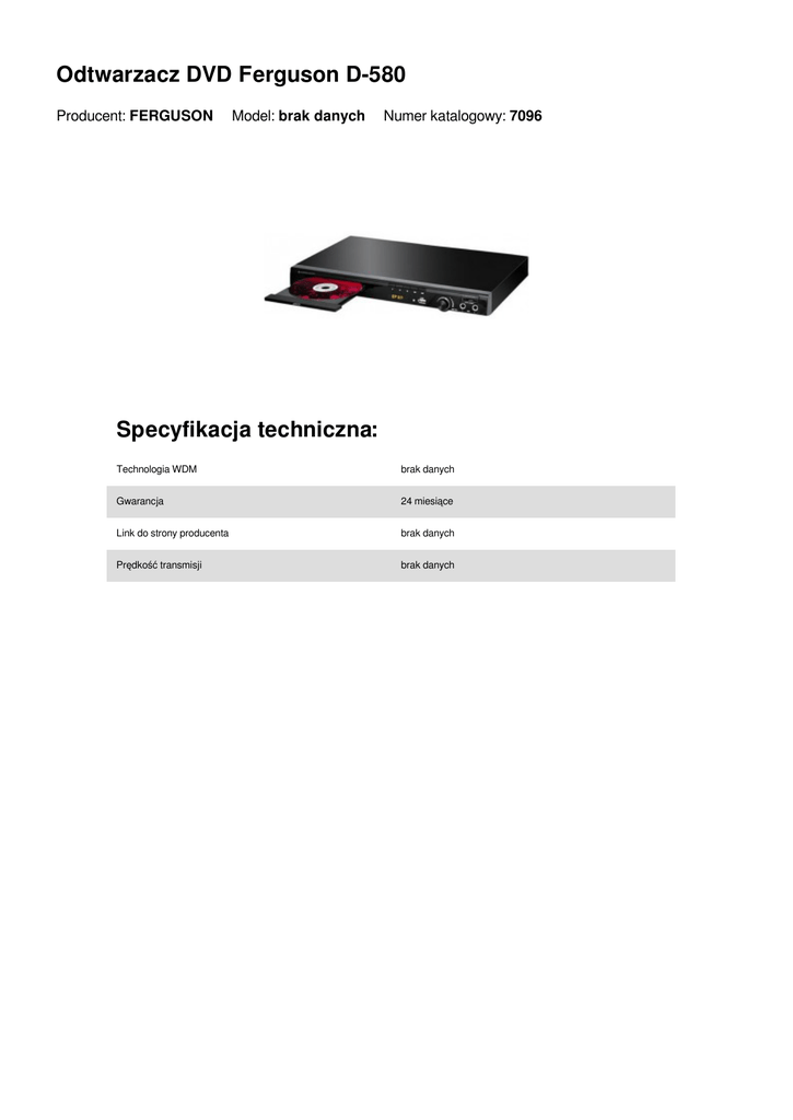 Odtwarzacz DVD Ferguson D-580 Producent: FERGUSON Model: brak danych Numer katalogowy: 7096 Specyfikacja techniczna: Technologia WDM brak danych Gwarancja 24 miesiące Link do strony producenta brak danych Prędkość transmisji brak danych