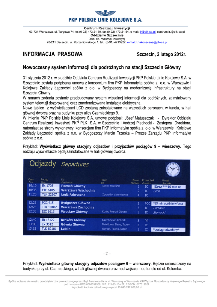 Centrum Realizacji Inwestycji 03-734 Warszawa, ul. Targowa 74, tel.(0-22) 473 21 50, fax (0-22) 473 21 54, e-mail: [email protected], [email protected] Oddział w Szczecinie Dział ds. realizacji inwestycji 70-211 Szczecin, ul. Korzeniowskiego 1, tel. (0-91) 4713927, e-mail:[email protected] INFORMACJA PRASOWA Szczecin, 2 lutego 2012r. Nowoczesny system informacji dla podróŜnych na stacji Szczecin Główny 31 stycznia 2012 r. w siedzibie Oddziału Centrum Realizacji Inwestycji PKP Polskie Linie Kolejowe S.A. w Szczecinie została podpisana umowa z konsorcjum firm PKP Informatyka spółka z o.o. w Warszawie i Kolejowe Zakłady Łączności spółka z o.o. w Bydgoszczy na modernizację infrastruktury na stacji Szczecin Główny. W ramach zadania zostanie przebudowany system wizualnej informacji dla podróŜnych, zainstalowany system telewizji dozorowanej oraz zmodernizowana instalacja elektryczna. Nowe tablice z wyświetlaczami LCD zostaną zainstalowane na wszystkich peronach, w tunelu, w hali głównej dworca oraz na budynku przy ulicy Czarnieckiego 9. W imieniu PKP Polskie Linie Kolejowe S.A. umowę podpisali: Józef Matuszczak - Dyrektor Oddziału Centrum Realizacji Inwestycji PKP PLK S.A. w Szczecinie i Andrzej Piechocki - Zastępca Dyrektora, natomiast ze strony wykonawcy, konsorcjum firm PKP Informatyka spółka z o.o. w Warszawie i Kolejowe Zakłady Łączności spółka z o.o. w Bydgoszczy Marcin Trzaska – Prezes Zarządu PKP Informatyka spółka z o.o. Przykład: Wyświetlacz główny stacyjny odjazdów i przyjazdów pociągów 9 – wierszowy. Tego rodzaju wyświetlacze będą zainstalowane w hali głównej dworca. -2– Przykład: Wyświetlacz główny stacyjny odjazdów pociągów 6 – wierszowy. Będzie umieszczony na budynku przy ul. Czarnieckiego, w hali głównej dworca oraz nad wejściem do tunelu od ul. Kolumba. Spółka wpisana do rejestru przedsiębiorców prowadzonego przez Sąd Rejonowy dla m. st. Warszawy w Warszawie XIII Wydział Gospodarczy Krajowego Rejestru Sądowego pod numerem KRS 0000037568, NIP: 113-23-16-427, REGON: 017319027 Wysokość kapitału zakładowego wynosi 13 043 747 000,00 zł Przykład: Wyświetlacz peronowy krawędziowy – będzie umieszczony na peronie 1, 2 i 3 (12 sztuk). Przykład: Tablica peronowa krawędziowa – tego rodzaju tablice będą umieszczone na peronie 1,2,3 i 4 (16 sztuk). -3– Przykład: Wyświetlacz peronowy umieszczony prostopadle do wejścia na peron z zegarem i numerem peronu umieszczonymi poziomo – takie wyświetlacze umieszczone będą w tunelu przy wyjściach na peron 1,2 i 3. Spółka wpisana do rejestru przedsiębiorców prowadzonego przez Sąd Rejonowy dla m. st. Warszawy w Warszawie XIII Wydział Gospodarczy Krajowego Rejestru Sądowego pod numerem KRS 0000037568, NIP: 113-23-16-427, REGON: 017319027 Wysokość kapitału zakładowego wynosi 13 043 747 000,00 zł Centrum zarządzania urządzeniami wizualnej informacji będzie zlokalizowane w pomieszczeniu dyŜurnego ruchu na peronie trzecim. W skład systemu telewizji dozorowanej wejdą kamery obejmujące swoim zasięgiem wiadukt nad ul. Kolumba i wjazd na stację z kierunku stacji Szczecin Port Centralny oraz centrum monitoringu mieszczące się w gmachu dawnej DOKP przy ul. Korzeniowskiego. Koszt inwestycji wyniesie 3 022 967 PLN. Termin ukończenia modernizacji przewidziano na 31 maja 2012 r. Dodatkowe informacje Romana Nakoneczna PKP Polskie Linie Kolejowe S.A. Oddział Centrum Realizacji Inwestycji w Szczecinie Spółka wpisana do rejestru przedsiębiorców prowadzonego przez Sąd Rejonowy dla m. st. Warszawy w Warszawie XIII Wydział Gospodarczy Krajowego Rejestru Sądowego pod numerem KRS 0000037568, NIP: 113-23-16-427, REGON: 017319027 Wysokość kapitału zakładowego wynosi 13 043 747 000,00 zł