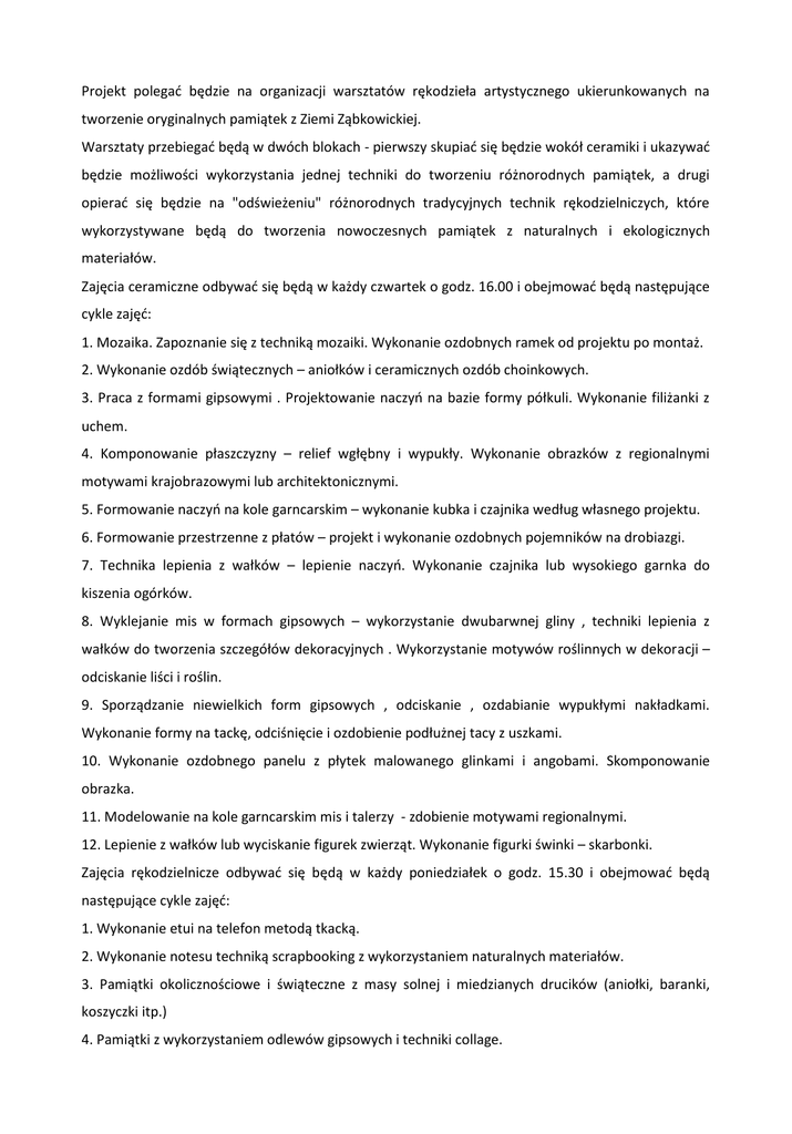Projekt polegać będzie na organizacji warsztatów rękodzieła artystycznego ukierunkowanych na tworzenie oryginalnych pamiątek z Ziemi Ząbkowickiej. Warsztaty przebiegać będą w dwóch blokach - pierwszy skupiać się będzie wokół ceramiki i ukazywać będzie możliwości wykorzystania jednej techniki do tworzeniu różnorodnych pamiątek, a drugi opierać się będzie na "odświeżeniu" różnorodnych tradycyjnych technik rękodzielniczych, które wykorzystywane będą do tworzenia nowoczesnych pamiątek z naturalnych i ekologicznych materiałów. Zajęcia ceramiczne odbywać się będą w każdy czwartek o godz. 16.00 i obejmować będą następujące cykle zajęć: 1. Mozaika. Zapoznanie się z techniką mozaiki. Wykonanie ozdobnych ramek od projektu po montaż. 2. Wykonanie ozdób świątecznych – aniołków i ceramicznych ozdób choinkowych. 3. Praca z formami gipsowymi . Projektowanie naczyń na bazie formy półkuli. Wykonanie filiżanki z uchem. 4. Komponowanie płaszczyzny – relief wgłębny i wypukły. Wykonanie obrazków z regionalnymi motywami krajobrazowymi lub architektonicznymi. 5. Formowanie naczyń na kole garncarskim – wykonanie kubka i czajnika według własnego projektu. 6. Formowanie przestrzenne z płatów – projekt i wykonanie ozdobnych pojemników na drobiazgi. 7. Technika lepienia z wałków – lepienie naczyń. Wykonanie czajnika lub wysokiego garnka do kiszenia ogórków. 8. Wyklejanie mis w formach gipsowych – wykorzystanie dwubarwnej gliny , techniki lepienia z wałków do tworzenia szczegółów dekoracyjnych . Wykorzystanie motywów roślinnych w dekoracji – odciskanie liści i roślin. 9. Sporządzanie niewielkich form gipsowych , odciskanie , ozdabianie wypukłymi nakładkami. Wykonanie formy na tackę, odciśnięcie i ozdobienie podłużnej tacy z uszkami. 10. Wykonanie ozdobnego panelu z płytek malowanego glinkami i angobami. Skomponowanie obrazka. 11. Modelowanie na kole garncarskim mis i talerzy - zdobienie motywami regionalnymi. 12. Lepienie z wałków lub wyciskanie figurek zwierząt. Wykonanie figurki świnki – skarbonki. Zajęcia rękodzielnicze odbywać się będą w każdy poniedziałek o godz. 15.30 i obejmować będą następujące cykle zajęć: 1. Wykonanie etui na telefon metodą tkacką. 2. Wykonanie notesu techniką scrapbooking z wykorzystaniem naturalnych materiałów. 3. Pamiątki okolicznościowe i świąteczne z masy solnej i miedzianych drucików (aniołki, baranki, koszyczki itp.) 4. Pamiątki z wykorzystaniem odlewów gipsowych i techniki collage. 5. Wykonanie kartek pocztowych w technice collage. 6. Wykonanie obrazków z motywem regionalnym techniką embossingu. 7. Wykonanie pamiątkowej torby bawełnianej zdobionej techniką patchworku. 8. Wykonanie koszulki z własnoręcznym rysunkiem. 9. Wykonanie ozdobnych pudełek na drobiazgi techniką decoupage. 10. Pamiątki z minerałów i kamieni szlachetnych (breloczki, biżuteria) 11. Pamiątki ze sznurka i korali. 12. Wykonanie obrazków malowanych na szkle Projekt trwać będzie przez 12 miesięcy. Wszystkie warsztaty będą miały charakter otwarty i przeznaczone będą dla mieszkańców terenu objętego Lokalną Strategią Rozwoju LGD Qwsi, w wieku poniżej 26 lat. O udziale w warsztatach decydować będzie kolejność zgłoszeń. Jednorazowo w zajęciach będzie mogło brać udział do 10 osób. Po każdym zakończonym cyklu zajęć instruktorzy wraz z uczestnikami wybierać będą "produkt miesiąca" , czyli najlepszą pracę, która będzie nagradzana symboliczną nagrodą (książka dotycząca danej techniki, narzędzie przydatne w tej technice itp), co stanowić będzie dodatkową motywację do pracy. Po każdym cyklu zajęć uczestnicy otrzymają certyfikat ukończenia danego cyklu. Na zakończenie projektu odbędzie się wystawa prac powstałych podczas warsztatów, na którą każdy uczestnik będzie mógł zaprosić kogoś bliskiego. Najlepsze prace zostaną zaprezentowane podczas Prezentacji Gospodarczych Ziemi Ząbkowickiej na stoisku Gminnego Ośrodka Kultury i Promocji.