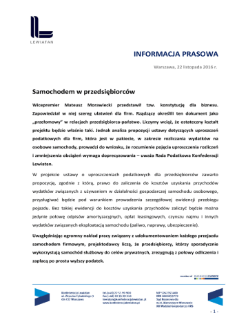 INFORMACJA PRASOWA Warszawa, 22 listopada 2016 r. Samochodem w przedsiębiorców Wicepremier Mateusz Morawiecki przedstawił tzw. konstytucję dla biznesu. Zapowiedział w niej szereg ułatwień dla firm. Rządzący określili ten dokument jako „przełomowy” w relacjach przedsiębiorca-państwo. Liczymy wciąż, że ostateczny kształt projektu będzie właśnie taki. Jednak analiza propozycji ustawy dotyczących uproszczeń podatkowych dla firm, która jest w pakiecie, w zakresie rozliczania wydatków na osobowe samochody, prowadzi do wniosku, że rozumienie pojęcia uproszczenia rozliczeń i zmniejszenia obciążeń wymaga doprecyzowania – uważa Rada Podatkowa Konfederacji Lewiatan. W projekcie ustawy o uproszczeniach podatkowych dla przedsiębiorców zawarto propozycję, zgodnie z którą, prawo do zaliczenia do kosztów uzyskania przychodów wydatków związanych z używaniem w działalności gospodarczej samochodu osobowego, przysługiwać będzie pod warunkiem prowadzenia szczegółowej ewidencji przebiegu pojazdu. Bez takiej ewidencji do kosztów uzyskania przychodów zaliczyć będzie można jedynie połowę odpisów amortyzacyjnych, opłat leasingowych, czynszu najmu i innych wydatków związanych eksploatacją samochodu (paliwo, naprawy, ubezpieczenie). Uwzględniając ogromny nakład pracy związany z udokumentowaniem każdego przejazdu samochodem firmowym, projektodawcy liczą, że przedsiębiorcy, którzy sporadycznie wykorzystują samochód służbowy do celów prywatnych, zrezygnują z połowy odliczenia i zapłacą po prostu wyższy podatek. -1- - Jest to istotna zmiana stanowiska ministra finansów. Obecnie nie budzi wątpliwości, że odpisy amortyzacyjne i raty leasingowe stanowią w całości koszt uzyskania przychodu niezależnie od tego, że samochód sporadycznie wykorzystywany jest do celów prywatnych podatnika. Niedawno minister wydał też interpretację indywidualną, w której potwierdził prawo do odliczenia wydatków związanych z eksploatacją samochodu– mówi Przemysław Pruszyński, doradca podatkowy, sekretarz Rady Podatkowej Konfederacji Lewiatan. Przed ogromnym i nierzadko niewykonalnym zadaniem ewidencyjno-sprawozdawczym staną firmy, mające duże floty samochodów, z których korzystają pracownicy. Ewidencja, którą podatnicy będą zobowiązani prowadzić dla potrzeb podatku dochodowego, poza danymi dotyczącymi osoby kierującej pojazdem, daty, celu wyjazdu, opisu trasy, liczby kilometrów, stanu licznika, nr. rej. pojazdu, będzie zawierać także potwierdzenie podatnika o autentyczności wpisu osoby kierującej pojazdem. Podatnik nie będzie w stanie z pełną odpowiedzialnością potwierdzić czy samochód nie został wykorzystany przez pracownika do celów innych niż działalność gospodarcza. - Zdumiewa fakt, że tak uciążliwe i niekorzystne zmiany prezentowane są pod hasłem przyjaznego traktowania przedsiębiorców i znajdują się w pakiecie ustaw zapowiadanych jako uwalniających biznes w Polsce. Ten przykład pokazuje jak ważne jest przygotowanie tego typu projektów we współpracy z przedsiębiorcami – dodaje Przemysław Pruszyński. Zwiększenie obciążeń biurokratycznych i kosztów funkcjonowania firm w zakresie wykorzystywania samochodów służbowych może odbić się negatywnie na wynikach istotnych dla gospodarki branż – motoryzacyjnej, czy usług leasingowych. Uderzy przede wszystkim w niewielkie przedsiębiorstwa i osoby prowadzące działalność gospodarczą. mówi wicepremier Mateusz Morawiecki Konfederacja Lewiatan -2-