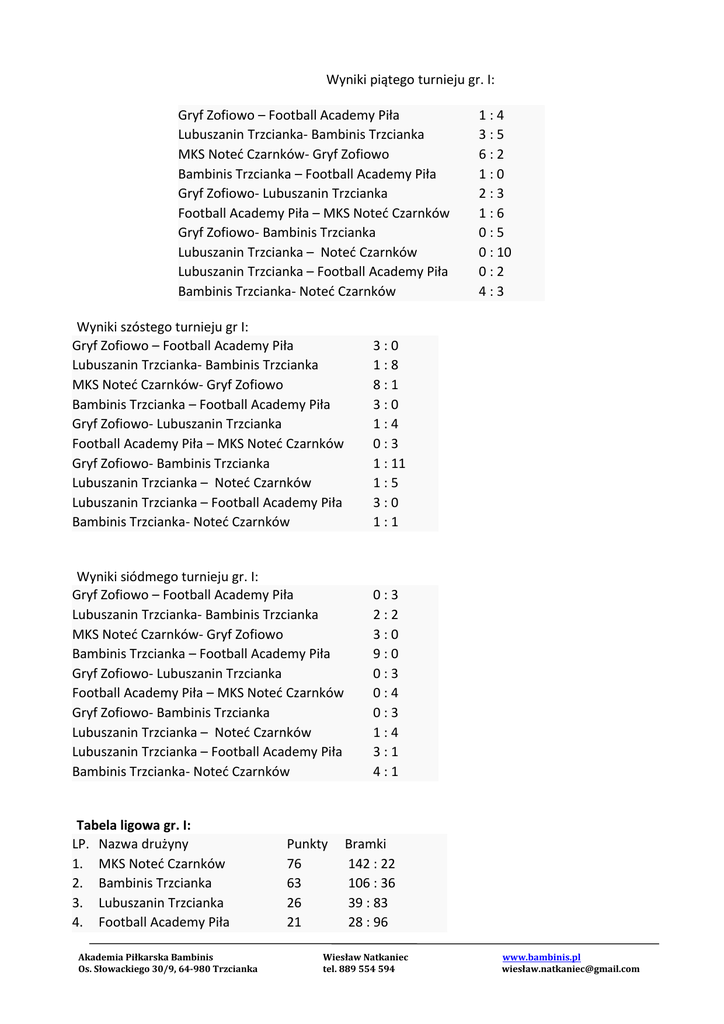 Wyniki piątego turnieju gr. I: Gryf Zofiowo – Football Academy Piła Lubuszanin Trzcianka- Bambinis Trzcianka MKS Noteć Czarnków- Gryf Zofiowo Bambinis Trzcianka – Football Academy Piła Gryf Zofiowo- Lubuszanin Trzcianka Football Academy Piła – MKS Noteć Czarnków Gryf Zofiowo- Bambinis Trzcianka Lubuszanin Trzcianka – Noteć Czarnków Lubuszanin Trzcianka – Football Academy Piła Bambinis Trzcianka- Noteć Czarnków Wyniki szóstego turnieju gr I: Gryf Zofiowo – Football Academy Piła Lubuszanin Trzcianka- Bambinis Trzcianka MKS Noteć Czarnków- Gryf Zofiowo Bambinis Trzcianka – Football Academy Piła Gryf Zofiowo- Lubuszanin Trzcianka Football Academy Piła – MKS Noteć Czarnków Gryf Zofiowo- Bambinis Trzcianka Lubuszanin Trzcianka – Noteć Czarnków Lubuszanin Trzcianka – Football Academy Piła Bambinis Trzcianka- Noteć Czarnków 3:0 1:8 8:1 3:0 1:4 0:3 1 : 11 1:5 3:0 1:1 Wyniki siódmego turnieju gr. I: Gryf Zofiowo – Football Academy Piła Lubuszanin Trzcianka- Bambinis Trzcianka MKS Noteć Czarnków- Gryf Zofiowo Bambinis Trzcianka – Football Academy Piła Gryf Zofiowo- Lubuszanin Trzcianka Football Academy Piła – MKS Noteć Czarnków Gryf Zofiowo- Bambinis Trzcianka Lubuszanin Trzcianka – Noteć Czarnków Lubuszanin Trzcianka – Football Academy Piła Bambinis Trzcianka- Noteć Czarnków 0:3 2:2 3:0 9:0 0:3 0:4 0:3 1:4 3:1 4:1 Tabela ligowa gr. I: LP. Nazwa drużyny 1. MKS Noteć Czarnków 2. Bambinis Trzcianka 3. Lubuszanin Trzcianka 4. Football Academy Piła Akademia Piłkarska Bambinis Os. Słowackiego 30/9, 64-980 Trzcianka Punkty 76 63 26 21 1:4 3:5 6:2 1:0 2:3 1:6 0:5 0 : 10 0:2 4:3 Bramki 142 : 22 106 : 36 39 : 83 28 : 96 Wiesław Natkaniec tel. 889 554 594 www.bambinis.pl wiesł[email protected] 5. Gryf Zofiowo Akademia Piłkarska Bambinis Os. Słowackiego 30/9, 64-980 Trzcianka 18 35 : 122 Wiesław Natkaniec tel. 889 554 594 www.bambinis.pl wiesł[email protected]