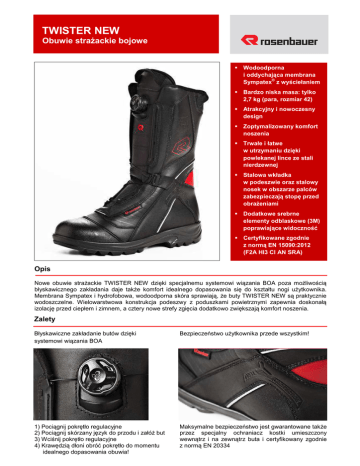TWISTER NEW Obuwie strażackie bojowe Wodoodporna i oddychająca membrana ® Sympatex z wyściełaniem Bardzo niska masa: tylko 2,7 kg (para, rozmiar 42) Atrakcyjny i nowoczesny design Zoptymalizowany komfort noszenia Trwałe i łatwe w utrzymaniu dzięki powlekanej lince ze stali nierdzewnej Stalowa wkładka w podeszwie oraz stalowy nosek w obszarze palców zabezpieczają stopę przed obrażeniami Dodatkowe srebrne elementy odblaskowe (3M) poprawiające widoczność Certyfikowane zgodnie z normą EN 15090:2012 (F2A HI3 CI AN SRA) Opis Nowe obuwie strażackie TWISTER NEW dzięki specjalnemu systemowi wiązania BOA poza możliwością błyskawicznego zakładania daje także komfort idealnego dopasowania się do kształtu nogi użytkownika. Membrana Sympatex i hydrofobowa, wodoodporna skóra sprawiają, że buty TWISTER NEW są praktycznie wodoszczelne. Wielowarstwowa konstrukcja podeszwy z poduszkami powietrznymi zapewnia doskonałą izolację przed ciepłem i zimnem, a cztery nowe strefy zgięcia dodatkowo zwiększają komfort noszenia. Zalety Błyskawiczne zakładanie butów dzięki systemowi wiązania BOA Bezpieczeństwo użytkownika przede wszystkim! 1) Pociągnij pokrętło regulacyjne 2) Pociągnij skórzany język do przodu i załóż but 3) Wciśnij pokrętło regulacyjne 4) Krawędzią dłoni obróć pokrętło do momentu idealnego dopasowania obuwia! Maksymalne bezpieczeństwo jest gwarantowane także przez specjalny ochraniacz kostki umieszczony wewnątrz i na zewnątrz buta i certyfikowany zgodnie z normą EN 20334 TWISTER NEW Obuwie strażackie bojowe Strefa zgięcia Solidne uchwyty do łatwego wkładania System wiązania BOA Strefa zgięcia Osłona systemu wiązania Rosenbauer BOA Wyściełana krawędź cholewy i cholewa Strefa zgięcia Strefa zgięcia Odporny na promieniowanie cieplne, srebrny materiał odblaskowy 3M Ochraniacz kostki po wewnętrznej i zewnętrznej stronie dla maksymalnej ochrony Gumowany nosek ochronny Stalowy nosek Nitrylowa podeszwa z poduszką powietrzną Dane techniczne Masa ok. 2.700 g (para, rozmiar 42) Wysokość buta ok. 260 mm (bez podeszwy, rozmiar 42) Szerokość 10 (standard) i 12 (opcja) Dostępne rozmiary 37 do 49 (standard) oraz 36, 50 i 51 (opcja) Materiał Czarna, wodoodporna, hydrofobowa skóra Membrana Sympatex z wysokiej jakości wyściełaniem warstwowym (odporna na wodę i „oddychająca”) Pielęgnacja obuwia (środki rekomendowane przez producenta) 1. Środek czyszczący Woly Protector 3x3. 300 ml aerozol. 2. Zestaw do pielęgnacji Nikwax. Zestaw składa się z żelu czyszczącego (125 ml), wosku (125 ml, neutralny) i szczotki. 3. Środek czyszczący Solitaire Brillant. Tubka 75 ml. ® Kontakt Rosenbauer International AG Paschinger Straße 90 4060 Leonding, Austria Tel.: +43 732 6794-0 Fax: +43 732 6794-91 www.rosenbauer.com Tekst i ilustracje nie są wiążące. Zdjęcia i rysunki mogą ukazywać opcjonalne wyposażenie, dostępne wyłącznie za dodatkową opłatą. Rosenbauer rezerwuje sobie prawo do zmian w powyższej specyfikacji i wymiarów bez wcześniejszego powiadomienia. BIURO HANDLOWE: ul. Konarskiego 50 05-092 Łomianki tel./fax. (022) 751-68-95 [email protected] www.steo.com.pl