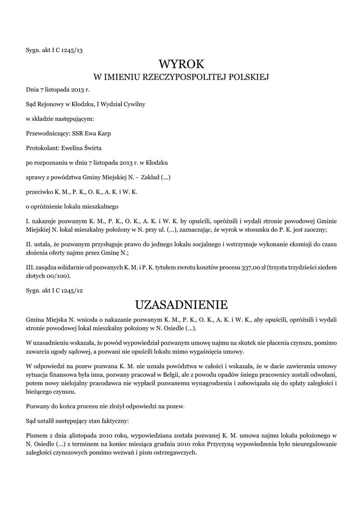 Sygn. akt I C 1245/13 WYROK W IMIENIU RZECZYPOSPOLITEJ POLSKIEJ Dnia 7 listopada 2013 r. Sąd Rejonowy w Kłodzku, I Wydział Cywilny w składzie następującym: Przewodniczący: SSR Ewa Karp Protokolant: Ewelina Świrta po rozpoznaniu w dniu 7 listopada 2013 r. w Kłodzku sprawy z powództwa Gminy Miejskiej N. - Zakład (...) przeciwko K. M., P. K., O. K., A. K. i W. K. o opróżnienie lokalu mieszkalnego I. nakazuje pozwanym K. M., P. K., O. K., A. K. i W. K. by opuścili, opróżnili i wydali stronie powodowej Gminie Miejskiej N. lokal mieszkalny położony w N. przy ul. (...), zaznaczając, że wyrok w stosunku do P. K. jest zaoczny; II. ustala, że pozwanym przysługuje prawo do jednego lokalu socjalnego i wstrzymuje wykonanie eksmisji do czasu złożenia oferty najmu przez Gminę N.; III. zasądza solidarnie od pozwanych K. M. i P. K. tytułem zwrotu kosztów procesu 337,00 zł (trzysta trzydzieści siedem złotych 00/100). Sygn. akt I C 1245/12 UZASADNIENIE Gmina Miejska N. wniosła o nakazanie pozwanym K. M., P. K., O. K., A. K. i W. K., aby opuścili, opróżnili i wydali stronie powodowej lokal mieszkalny położony w N. Osiedle (...). W uzasadnieniu wskazała, że powód wypowiedział pozwanym umowę najmu na skutek nie płacenia czynszu, pomimo zawarcia ugody sądowej, a pozwani nie opuścili lokalu mimo wygaśnięcia umowy. W odpowiedzi na pozew pozwana K. M. nie uznała powództwa w całości i wskazała, że w dacie zawierania umowy sytuacja finansowa była inna, pozwany pracował w Belgii, ale z powodu opadów śniegu pracownicy zostali odwołani, potem nowy nielojalny pracodawca nie wypłacił pozwanemu wynagrodzenia i zobowiązała się do spłaty zaległości i bieżącego czynszu. Pozwany do końca procesu nie złożył odpowiedzi na pozew. Sąd ustalił następujący stan faktyczny: Pismem z dnia 4listopada 2010 roku, wypowiedziana została pozwanej K. M. umowa najmu lokalu położonego w N. Osiedle (...) z terminem na koniec miesiąca grudnia 2010 roku Przyczyną wypowiedzenia było nieuregulowanie zaległości czynszowych pomimo wezwań i pism ostrzegawczych. Dowód: - wypowiedzenie K- 8 - wezwania k- 5, 6,7, 9 - umowa K- 10-11 W dniu 10 listopada 2011 roku, w sprawie (...) pozwana K. M. zawarła przed Sądem Rejonowym w Kłodzku, z powodową Gminą, w imieniu własnym i pozwanego P. K. ugodę dotycząca spłaty zadłużenia w wysokości 11 151, 46 zł w 28 ratach miesięcznych. Sprawa dotyczyła opróżnienia lokalu położonego w N. Osiedle (...) i zapłaty Dowód; - ugoda K- 4 Pozwani nie wywiązali się z zawartej ugody i na wniosek pozwanej K. M. Sąd zawieszał postępowanie celem umożliwienia pozwanym spłaty zaległości. Zaległości nie zostały spłacone w ciągu trwającej rok sprawy i Sąd podjął postępowanie na wniosek Gminy, która wskazała, że dług pozwanych rośnie. Dowód: - przesłuchanie pozwanej k- 25, 37 - protokół K- zestawienie zaległości k- 35 - postanowienia k- 37, pismo k- 39 Pozwani K. M. i P. K. mają 3 dzieci w wieku 11, 5 i 6 lat. Pozwana jest bezrobotna bez prawa do zasiłku i zajmuje się dziećmi. Pozwany jest hydraulikiem, w listopadzie 2012 roku zarabiał 6000 zł i takie zarobki miał od lipca 2012 roku. W okresie osiągania przez pozwanego zarobków w kwocie 6 000 zł miesięcznie , pozwani nie spłacili żadnej kwoty długu. Pozwani mają zaległości w ZUS-ie.Spłąta zaległości czynszowych miała nastąpić do marca 2013 roku, strona powodowa zgodziła się na spłatę do 31 lipca 2013 roku.. Dowód: - przesłuchanie pozwanej k- 25 - pismo K- 34 W tak ustalonym stanie faktycznym Sąd zważył co następuje: Powództwo zasługuje na uwzględnienie w oparciu o ustalenia dokonane na podstawie przeprowadzonego w sprawie postępowania dowodowego. Strona powodowa wykazała prawidłowe wypowiedzenie umowy najmu przed trzema laty oraz próby ugodowego rozwiązania problemu zadłużenia i przywrócenia prawa najmu pozwanym. Pozwana K. M. wykazała, że pomimo zobowiązań w ugodzie zawartej przed Sądem w innej sprawie o opróżnienie lokalu i zapłatę oraz pomimo zobowiązań składanych na rozprawach i pismach w tej sprawie systematycznie nie dotrzymuje zobowiązań, co uzasadnia przyjęcie, że nie czyni żadnych starań by odzyskać prawo najmu lokalu i uprawnienie do zamieszkiwania w nim wraz z rodziną. Pozwani K. M. i P. K. nie wykazali nawet trudnej sytuacji finansowej rodziny bowiem z przesłuchania pozwanej K. M. wynikają jedynie wysokie zarobki pozwanego P. K. w kwocie 6000 zł miesięcznie oraz perspektywy jeszcze lepiej płatnej pracy za granicą. Mając na względzie dobro trójki małoletnich dzieci oraz wskazanie przez pozwana, że była osoba bezrobotną, Sąd orzekł o uprawnieniu pozwanych do lokalu socjalnego na podstawie art.14 Ustawy z dnia 21 czerwca 2001 r.o ochronie praw lokatorów, mieszkaniowym zasobie gminy i o zmianie Kodeksu cywilnego W myśl tego przepisu Sąd w wyroku nakazującym opróżnienie lokalu orzeka o uprawnieniu do otrzymania lokalu socjalnego bądź o braku takiego uprawnienia wobec osób, których nakaz dotyczy. Obowiązek zapewnienia lokalu socjalnego ciąży na gminie właściwej ze względu na miejsce położenia lokalu podlegającego opróżnieniu. 2. Jeżeli w wyroku orzeczono o uprawnieniu, o którym mowa w ust. 1, dwóch lub więcej osób, gmina jest obowiązana zapewnić im co najmniej jeden lokal socjalny. 3. Sąd, badając z urzędu, czy zachodzą przesłanki do otrzymania lokalu socjalnego, orzeka o uprawnieniu osób, o których mowa w ust. 1, biorąc pod uwagę dotychczasowy sposób korzystania przez nie z lokalu oraz ich szczególną sytuację materialną i rodzinną. 4. Sąd nie może orzec o braku uprawnienia do otrzymania lokalu socjalnego wobec małoletniego, niepełnosprawnego w rozumieniu przepisów ustawy z dnia 29 listopada 1990 r. o pomocy społecznej (Dz. U. z 1998 r. Nr 64, poz. 414, z późn. zm3/ i osoby posiadającej status bezrobotnego. O kosztach 