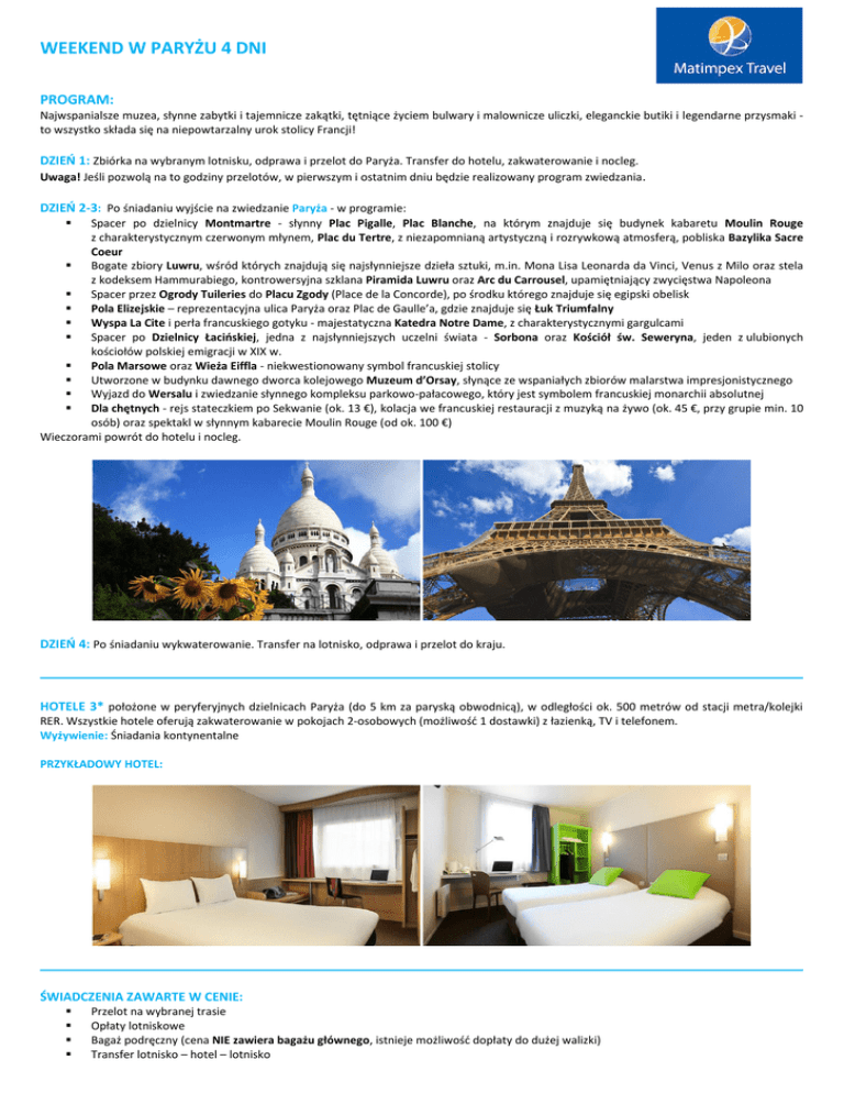 WEEKEND W PARYŻU 4 DNI PROGRAM: Najwspanialsze muzea, słynne zabytki i tajemnicze zakątki, tętniące życiem bulwary i malownicze uliczki, eleganckie butiki i legendarne przysmaki to wszystko składa się na niepowtarzalny urok stolicy Francji! DZIEŃ 1: Zbiórka na wybranym lotnisku, odprawa i przelot do Paryża. Transfer do hotelu, zakwaterowanie i nocleg. Uwaga! Jeśli pozwolą na to godziny przelotów, w pierwszym i ostatnim dniu będzie realizowany program zwiedzania . DZIEŃ 2-3: Po śniadaniu wyjście na zwiedzanie Paryża - w programie: Spacer po dzielnicy Montmartre - słynny Plac Pigalle, Plac Blanche, na którym znajduje się budynek kabaretu Moulin Rouge z charakterystycznym czerwonym młynem, Plac du Tertre, z niezapomnianą artystyczną i rozrywkową atmosferą, pobliska Bazylika Sacre Coeur Bogate zbiory Luwru, wśród których znajdują się najsłynniejsze dzieła sztuki, m.in. Mona Lisa Leonarda da Vinci, Venus z Milo oraz stela z kodeksem Hammurabiego, kontrowersyjna szklana Piramida Luwru oraz Arc du Carrousel, upamiętniający zwycięstwa Napoleona Spacer przez Ogrody Tuileries do Placu Zgody (Place de la Concorde), po środku którego znajduje się egipski obelisk Pola Elizejskie – reprezentacyjna ulica Paryża oraz Plac de Gaulle’a, gdzie znajduje się Łuk Triumfalny Wyspa La Cite i perła francuskiego gotyku - majestatyczna Katedra Notre Dame, z charakterystycznymi gargulcami Spacer po Dzielnicy Łacińskiej, jedna z najsłynniejszych uczelni świata - Sorbona oraz Kościół św. Seweryna, jeden z ulubionych kościołów polskiej emigracji w XIX w. Pola Marsowe oraz Wieża Eiffla - niekwestionowany symbol francuskiej stolicy Utworzone w budynku dawnego dworca kolejowego Muzeum d’Orsay, słynące ze wspaniałych zbiorów malarstwa impresjonistycznego Wyjazd do Wersalu i zwiedzanie słynnego kompleksu parkowo-pałacowego, który jest symbolem francuskiej monarchii absolutnej Dla chętnych - rejs stateczkiem po Sekwanie (ok. 13 €), kolacja we francuskiej restauracji z muzyką na żywo (ok. 45 €, przy grupie min. 10 osób) oraz spektakl w słynnym kabarecie Moulin Rouge (od ok. 100 €) Wieczorami powrót do hotelu i nocleg. DZIEŃ 4: Po śniadaniu wykwaterowanie. Transfer na lotnisko, odprawa i przelot do kraju. HOTELE 3* położone w peryferyjnych dzielnicach Paryża (do 5 km za paryską obwodnicą), w odległości ok. 500 metrów od stacji metra/kolejki RER. Wszystkie hotele oferują zakwaterowanie w pokojach 2-osobowych (możliwość 1 dostawki) z łazienką, TV i telefonem. Wyżywienie: Śniadania kontynentalne PRZYKŁADOWY HOTEL: ŚWIADCZENIA ZAWARTE W CENIE: Przelot na wybranej trasie Opłaty lotniskowe Bagaż podręczny (cena NIE zawiera bagażu głównego, istnieje możliwość dopłaty do dużej walizki) Transfer lotnisko – hotel – lotnisko 3 noclegi w hotelu 3* 3 śniadania Pokoje 2-osobowe z łazienkami Opieka pilota Ubezpieczenie podstawowe Signal Iduna (KL, NNW, CHP i bagaż) KOSZTY DODATKOWE: Orientacyjny koszt realizacji programu zwiedzania to ok. 80-90 € (w zależności od wielkości grupy) - kwota ta obejmuje przejazdy komunikacją miejską podczas realizacji programu, wyjazd kolejką RER do Wersalu, bilety wstępu do zwiedzanych obiektów wraz z kosztami ich rezerwacji (Luwr, Wieża Eiffla - III poziom, Muzeum d’Orsay, Pałac Wersalski) oraz słuchawki podczas zwiedzania. Cena nie zawiera podatku miejskiego w wysokości 1-2 €/os/noc Opcje dla chętnych (rejs stateczkiem po Sekwanie, francuska kolacja, spektakl w Moulin Rouge) są dodatkowo płatne. INFORMACJE DODATKOWE: Promocja „S” - promocja dla osób podróżujących w pojedynkę, dokwaterowanie do pokoju 2- lub 3-osobowego Dopłata za pokój 1-osobowy +500 zł Zniżka dla trzeciej osoby w pokoju -100 zł Gwarancja niezmienności ceny +30 zł WYBIERZ SWÓJ BAGAŻ: Cena wycieczki zawiera jedynie bagaż podręczny: Ryanair (wylot z Krakowa): bagaż podręczny o wadze 10 kg i wymiarach 55x40x20 cm oraz dodatkowy mały bagaż podręczny o wymiarach 35x20x20 cm Wizzair (wylot z Gdańska, Katowic, Warszawy i Wrocławia): bagaż podręczny o wymiarach 42x32x25 cm (bagaż mieszczący się pod siedzeniem fotela lotniczego). Za dopłatą można powiększyć bagaż podręczny do wymiarów 56x45x25 cm (bagaż mieszczący się w schowku nad siedzeniami). Istnieje możliwość wykupienia bagażu głównego – ceny bagażu zależą od przewoźnika, trasy i terminu wycieczki, a dodatkowy bagaż przypisany jest do konkretnej osoby. Szczegółowy cennik bagażu znajdziecie na stronie www.matimpex.pl w zakładce Katalogi i ceny. Prosimy o wybór bagażu w momencie dokonywania rezerwacji, gdyż w przypadku wykupienia bagażu w późniejszym terminie, jego cena będzie wyższa ok. 20-50 zł (w zależności od taryfy przewoźnika). Ze względów organizacyjnych prosimy o ostateczny wybór opcji bagażu najpóźniej na 4 dni robocze przed planowanym terminem wycieczki – po tym terminie dodanie bagażu może nie być możliwe. Przypominamy, że w bagażu podręcznym nie mogą znajdować się płyny ani żele czy fluidy w opakowaniach większych niż 100 ml oraz ostre narzędzia (noże, metalowe pilniczki do paznokci, nożyczki, itp.). Szczegóły na www.matimpex.pl w zakładce Linie lotnicze. POZOSTAŁE UWAGI: Kolejność zwiedzania może ulec zmianie, jednak wszystkie punkty programu zostaną zrealizowane. Pilot nie oprowadza grupy po wnętrzach muzeów. Spotkanie z pilotem nastąpi na lotnisku w kraju lub w Paryżu po przylocie. W pojedynczych przypadkach transfer lotniskowy może być realizowany pod opieką lokalnego kierowcy. Transfery lotniskowe realizowane są busem/autokarem, a przejazdy po mieście komunikacją miejską. W przypadku wylotu we wczesnych godzinach porannych, zamiast śniadania mogą zostać przygotowane pakiety śniadaniowe. UBEZPIECZENIE: Podczas naszej wycieczki Uczestnicy są objęci podstawowym ubezpieczeniem Signal Iduna. Pakiet podstawowy zawiera ubezpieczen
