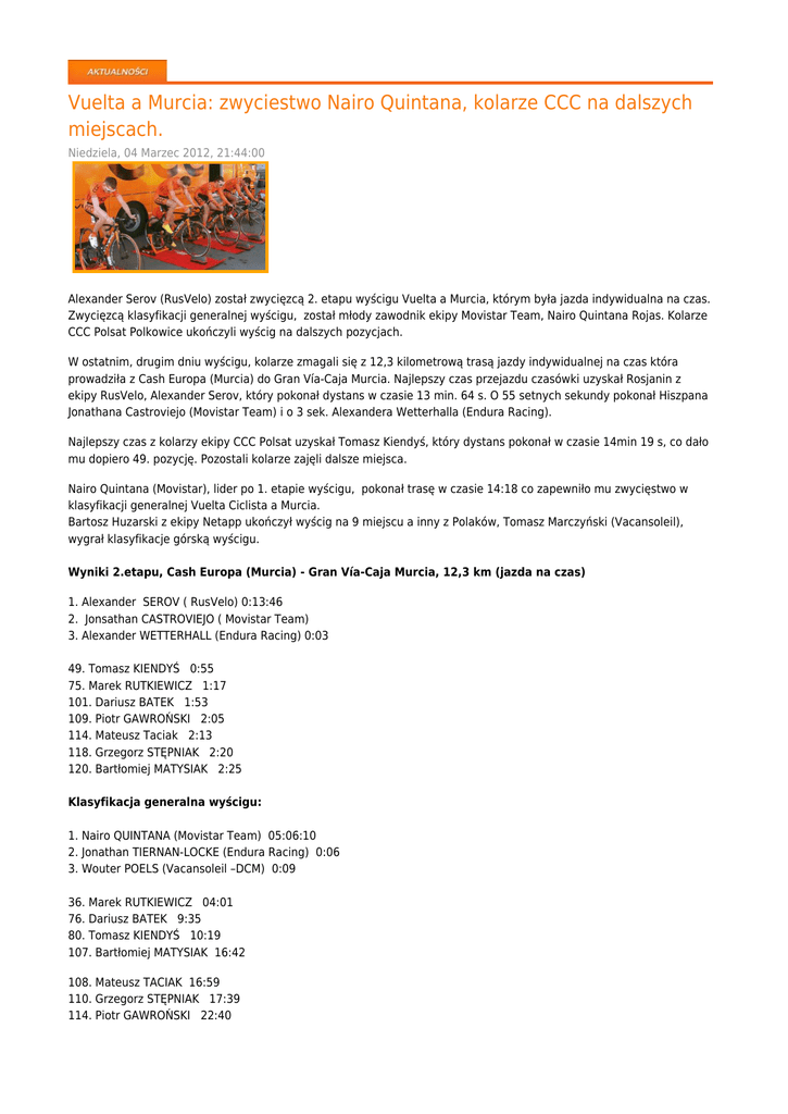 Vuelta a Murcia: zwyciestwo Nairo Quintana, kolarze CCC na dalszych miejscach. Niedziela, 04 Marzec 2012, 21:44:00 Alexander Serov (RusVelo) został zwycięzcą 2. etapu wyścigu Vuelta a Murcia, którym była jazda indywidualna na czas. Zwycięzcą klasyfikacji generalnej wyścigu, został młody zawodnik ekipy Movistar Team, Nairo Quintana Rojas. Kolarze CCC Polsat Polkowice ukończyli wyścig na dalszych pozycjach. W ostatnim, drugim dniu wyścigu, kolarze zmagali się z 12,3 kilometrową trasą jazdy indywidualnej na czas która prowadziła z Cash Europa (Murcia) do Gran Vía-Caja Murcia. Najlepszy czas przejazdu czasówki uzyskał Rosjanin z ekipy RusVelo, Alexander Serov, który pokonał dystans w czasie 13 min. 64 s. O 55 setnych sekundy pokonał Hiszpana Jonathana Castroviejo (Movistar Team) i o 3 sek. Alexandera Wetterhalla (Endura Racing). Najlepszy czas z kolarzy ekipy CCC Polsat uzyskał Tomasz Kiendyś, który dystans pokonał w czasie 14min 19 s, co dało mu dopiero 49. pozycję. Pozostali kolarze zajęli dalsze miejsca. Nairo Quintana (Movistar), lider po 1. etapie wyścigu, pokonał trasę w czasie 14:18 co zapewniło mu zwycięstwo w klasyfikacji generalnej Vuelta Ciclista a Murcia. Bartosz Huzarski z ekipy Netapp ukończył wyścig na 9 miejscu a inny z Polaków, Tomasz Marczyński (Vacansoleil), wygrał klasyfikacje górską wyścigu. Wyniki 2.etapu, Cash Europa (Murcia) - Gran Vía-Caja Murcia, 12,3 km (jazda na czas) 1. Alexander SEROV ( RusVelo) 0:13:46 2. Jonsathan CASTROVIEJO ( Movistar Team) 3. Alexander WETTERHALL (Endura Racing) 0:03 49. Tomasz KIENDYŚ 0:55 75. Marek RUTKIEWICZ 1:17 101. Dariusz BATEK 1:53 109. Piotr GAWROŃSKI 2:05 114. Mateusz Taciak 2:13 118. Grzegorz STĘPNIAK 2:20 120. Bartłomiej MATYSIAK 2:25 Klasyfikacja generalna wyścigu: 1. Nairo QUINTANA (Movistar Team) 05:06:10 2. Jonathan TIERNAN-LOCKE (Endura Racing) 0:06 3. Wouter POELS (Vacansoleil –DCM) 0:09 36. Marek RUTKIEWICZ 04:01 76. Dariusz BATEK 9:35 80. Tomasz KIENDYŚ 10:19 107. Bartłomiej MATYSIAK 16:42 108. Mateusz TACIAK 16:59 110. Grzegorz STĘPNIAK 17:39 114. Piotr GAWROŃSKI 22:40