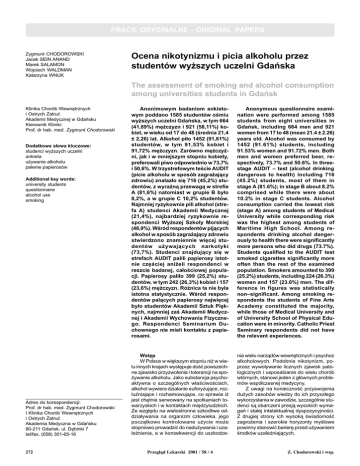 PRACE ORYGINALNE ORIGINAL PAPERS Zygmunt CHODOROWSKI Jacek SEIN ANAND Marek SALAMON Wojciech WALDMAN Katarzyna WNUK Ocena nikotynizmu i picia alkoholu przez studentów wy¿szych uczelni Gdañska The assessment of smoking and alcohol consumption among universities students in Gdañsk Klinika Chorób Wewnêtrznych i Ostrych Zatruæ Akademii Medycznej w Gdañsku Kierownik Kliniki: Prof. dr hab. med. Zygmunt Chodorowski Dodatkowe s³owa kluczowe: studenci wy¿szych uczelni ankieta u¿ywanie alkoholu palenie papierosów Additional key words: university students questionnaire alcohol use smoking Adres do korespondencji: Prof. dr hab. med. Zygmunt Chodorowski I Klinika Chorób Wewnêtrznych i Ostrych Zatruæ Akademia Medyczna w Gdañsku 80-211 Gdañsk, ul. Dêbinki 7 tel/fax. (058) 301-65-16 272 Anonimowym badaniom ankietowym poddano 1585 studentów omiu wy¿szych uczelni Gdañska, w tym 664 (41,89%) mê¿czyzn i 921 (58,11%) kobiet, w wieku od 17 do 48 (rednia 21,4 ± 2,26) lat. Alkohol pi³o 1452 (91,61%) studentów, w tym 91,53% kobiet i 91,72% mê¿czyzn. Zarówno mê¿czyni, jak i w mniejszym stopniu kobiety, preferowali piwo odpowiednio w 73,7% i 50,6%. W trzystrefowym tecie AUDIT (picie alkoholu w sposób zagra¿aj¹cy zdrowiu) znalaz³o siê 716 (45,2%) studentów, z wyran¹ przewag¹ w strefie A (81,6%) natomiast w grupie B by³o 8,2%, a w grupie C 10,2% studentów. Najmniej ryzykownie pili alkohol (strefa A) studenci Akademii Medycznej (21,4%), najbardziej ryzykownie respondenci Wy¿szej Szko³y Morskiej (48,9%). Wród respondentów pij¹cych alkohol w sposób zagra¿aj¹cy zdrowiu stwierdzono znamiennie wiêcej studentów u¿ywaj¹cych narkotyki (73,7%). Studenci znajduj¹cy siê w strefach AUDIT palili papierosy istotnie czêciej ani¿eli respondenci w reszcie badanej, ca³ociowej populacji. Papierosy pali³o 399 (25,2%) studentów, w tym 242 (26,3%) kobiet i 157 (23,6%) mê¿czyzn. Ró¿nica ta nie by³a istotna statystycznie. Wród respondentów pal¹cych papierosy najwiêcej by³o studentów Akademii Sztuk Piêknych, najmniej za Akademii Medycznej i Akademii Wychowania Fizycznego. Respondenci Seminarium Duchownego nie mieli kontaktu z papierosami. Anonymous questionnaire examination were performed among 1585 students from eight universities in Gdañsk, including 664 men and 921 women from 17 to 48 (mean 21.4 ± 2.26) years old. Alcohol was consumed by 1452 (91.61%) students, including 91.53% women and 91.72% men. Both men and women preferred beer, respectively, 73.7% and 50.6%. In threestage AUDIT test (alcohol drinking dangerous to health) including 716 (45.2%) students, most of them in stage A (81.6%); in stage B about 8.2% comprised while there were about 10.2% in stage C students. Alcohol consumption carried the lowest risk (stage A) among students of Medical University while corresponding risk was the highest among students of Maritime High School. Among respondents drinking alcohol dangerously to health there were significantly more persons who did drugs (73.7%). Students qualified to the AUDIT test smoked cigarettes significantly more often than the rest of the examined population. Smokers amounted to 399 (25.2%) students, including 224 (26.3%) women and 157 (23.6%) men. The difference in figures was statistically nonsignificant. Among smoking respondents the students of Fine Arts Academy constituted the majority, while those of Medical University and of University School of Physical Education were in minority. Catholic Priest Seminary respondents did not have the relevant experiences. Wstêp W Polsce w wiêkszym stopniu ni¿ w wielu innych krajach wystêpuje doæ powszechne zjawisko przyzwolenia i tolerancji na spo¿ywanie alkoholu. Jako substancja psychoaktywna o szczególnych w³aciwociach, alkohol wywiera dzia³anie euforyzuj¹ce, rozluniaj¹ce i rozhamowuj¹ce, co sprawia i¿ jest chêtnie serwowany na spotkaniach towarzyskich i w kontaktach miêdzyludzkich. Ze wzglêdu na wielostronne szkodliwe oddzia³ywania na organizm cz³owieka, jego pocz¹tkowo kontrolowane u¿ycie mo¿e stopniowo prowadziæ do nadu¿ywania i uzale¿nienia, a w konsekwencji do uszkodze- nia wielu narz¹dów wewnêtrznych i psychoz alkoholowych. Podobnie nikotynizm, poprzez wywo³ywanie licznych zjawisk patologicznych i usposabianie do wielu chorób wtórnych, stanowi jeden z g³ównych problemów wspó³czesnej medycyny. Z uwagi na koniecznoæ przyswojenia du¿ych zasobów wiedzy do ich przysz³ego wykorzystania w zawodzie, szczególnie studenci s¹ obarczeni presj¹ wysokich wymagañ i sta³ej intelektualnej dyspozycyjnoci. Z drugiej strony ich wysok¹ wiadomoæ zagro¿enia i szerokie horyzonty mylowe powinny stanowiæ barierê przed u¿ywaniem rodków uzale¿niaj¹cych. Przegl¹d Lekarski 2001 / 58 / 4 Z. Chodorowski i wsp. Literatura wiatowa dotycz¹ca wielu problemów zwi¹zanych z uzale¿nieniem m³odzie¿y jest niezwykle bogata i obfituje w tysi¹ce doniesieñ [2,4,5,7-9,11,14,17-20]. Pimiennictwo powiêcone nikotynizmowi i spo¿ywaniu alkoholu w polskich rodowiskach akademickich nie jest zbyt obszerne, ale obejmuje doæ znaczny zakres czasowy [3,6,10,13,15,16]. Celem pracy by³o przedstawienie niektórych problemów epidemiologicznych nikotynizmu i picia alkoholu wród studentów w omiu wy¿szych uczelniach Gdañska. Materia³ i metoda W stworzeniu anonimowej ankiety pos³u¿ono siê jedn¹ ze znanych skal badaj¹cych zjawiska patologiczne zwi¹zane z piciem alkoholu. Wykorzystany do tego celu test AUDIT (Alcohol Use Disorders Identification Test) zosta³ opracowany przez wiatow¹ Organizacjê Zdrowia w celu rozpoznawania osób pij¹cych w sposób ryzykowny lub potencjalnie w przysz³oci mog¹cych popaæ w uzale¿nienie psychiczne i/lub fizyczne jak równie¿ osób ju¿ uzale¿nionych [1]. Sporód innych podobnych testów wyró¿nia siê on du¿¹ czu³oci¹ (92%) i pozwala dok³adnie oceniæ picie alkoholu oraz zwi¹zane z tym problemy w okresie ostatnich 12 miesiêcy. Zawarte w tecie py