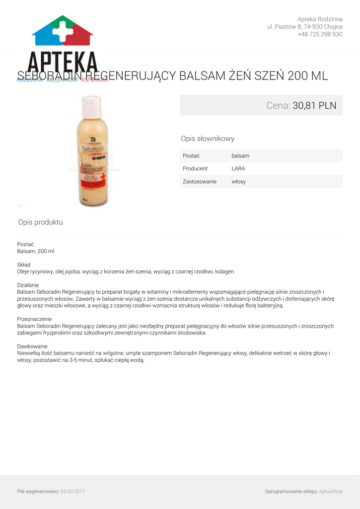 Apteka Rodzinna ul. Piastów 8, 74-500 Chojna +48 725 298 530 SEBORADIN REGENERUJĄCY BALSAM ŻEŃ SZEŃ 200 ML Cena: 30,81 PLN Opis słownikowy Postać balsam Producent LARA Zastosowanie włosy Opis produktu Postać Balsam, 200 ml Skład Oleje rycynowy, olej jojoba, wyciąg z korzenia żeń-szenia, wyciąg z czarnej rzodkwi, kolagen. Działanie Balsam Seboradin Regenerujący to preparat bogaty w witaminy i mikroelementy wspomagające pielęgnację silnie zniszczonych i przesuszonych włosów. Zawarty w balsamie wyciąg z żen-szenia dostarcza unikalnych substancji odżywczych i dotleniających skórę głowy oraz mieszki włosowe, a wyciąg z czarnej rzodkwi wzmacnia strukturę włosów i redukuje florę bakteryjną. Przeznaczenie Balsam Seboradin Regenerujący zalecany jest jako niezbędny preparat pielęgnacyjny do włosów silnie przesuszonych i zniszczonych zabiegami fryzjerskimi oraz szkodliwymi zewnętrznymi czynnikami środowiska. Dawkowanie Niewielką ilość balsamu nanieść na wilgotne, umyte szamponem Seboradin Regenerujący włosy, delikatnie wetrzeć w skórę głowy i włosy, pozostawić na 3-5 minut, spłukać ciepłą wodą. Plik wygenerowano: 03-03-2017 Powered by TCPDF (www.tcpdf.org) Oprogramowanie sklepu: AptusShop