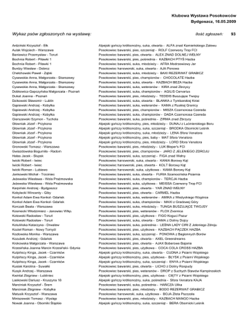 Klubowa Wystawa Posokowców Bydgoszcz, 16.05.2009 Wykaz psów zgłoszonych na wystawę: Ilość zgłoszeń: Ardziński Krzysztof - Ełk Alpejski gończy krótkonożny, suka, otwarta - ALFA znad Kamieńskiego Zalewu Aulak Wojciech - Warszawa Baniewicz Przemysław - Toruń Posokowiec bawarski, pies, szczeniąt - ROLF Czerwony Trop FCI Posokowiec bawarski, pies, otwarta - ALEX ZNAD DOLNEJ WEŁNY Bochnia Robert - Piławki 1 Posokowiec bawarski, pies, pośrednia - KAZBACH PTYŚ Hazba Bochnia Robert - Piławki 1 Burdzy Wiesław - Dobrcz Posokowiec bawarski, suka, młodzieży - AFRA Modrzewiowy Jar Posokowiec hanowerski, suka, otwarta - AJA Ponowa Chełchowski Paweł - Ząbki Posokowiec bawarski, suka, młodzieży - BAXI REZERWAT GRABICZ Cysewskie Anna, Małgorzata - Skarszewy Cysewskie Anna, Małgorzata - Skarszewy Posokowiec bawarski, pies, championów - CHOCOLATE Hazba Posokowiec bawarski, suka, otwarta - KAZBACH BEZA Hazba Cysewskie Anna, Małgorzata - Skarszewy Posokowiec bawarski, suka, weteranów - KIRA znad Zbrzycy Dobkowicz-Gapczyńska Małgorzata - Poznań Dukat Joanna - Poznań Posokowiec bawarski, suka, championów - AGILIS Cervarius Posokowiec bawarski, pies, młodzieży - TEDDIS Buszujące Twojsy Dzikowski Sławomir - Lublin Posokowiec bawarski, suka, otwarta - BLANKA z Tymbarskiej Kniei Gąsiewski Andrzej - Kobyłka Gąsiewski Andrzej - Kobyłka Posokowiec bawarski, suka, weteranów - KAMA z Ruskiej Granicy Posokowiec bawarski, pies, championów - MISZA Czarnonosa Czereda Gąsiewski Andrzej - Kobyłka Posokowiec bawarski, suka, championów - DADA Czarnonosa Czereda Gierszewski Szymon - Tuchola Głowniak Józef - Przykona Posokowiec bawarski, suka, pośrednia - ZIRMA znad Zbrzycy Głowniak Józef - Przykona Alpejski gończy krótkonożny, pies, młodzieży - DUNAJ z Lućmierskiego Boru Alpejski gończy krótkonożny, suka, szczeniąt - BRODKA Obornicki Leśnik Głowniak Józef - Przykona Głowniak Józef - Przykona Głowniak Józef - Przykona Alpejski gończy krótkonożny, suka, młodzieży - LENA Sfora Venatora Alpejski gończy krótkonożny, pies, baby - MAT Sfora Venatora Alpejski gończy krótkonożny, pies, młodzieży - LORD Sfora Venatora Gronowski Tomasz - Warszawa Gwiazdowska Bogumiła - Radom Posokowiec bawarski, pies, młodzieży - LUK Bleper's FCI Posokowiec bawarski, pies, championów - JARO Z JELENIEGO ZDROJU Hałas Jacek - Słupsk Iwicki Robert - Iwiec Iwicki Robert - Iwiec Posokowiec bawarski, suka, szczeniąt - FIGA znad Wełny Posokowiec hanowerski, suka, otwarta - KANIA Borowy Kąt Posokowiec hanowerski, pies, otwarta - KOLT Borowy Kąt Iwicki Roman - Lubiewo Jankowski Michał - Trzciniec Jeżewska Wiesława - Wola Prażmowska Posokowiec hanowerski, suka, użytkowa - KAMA Borowy Kąt Posokowiec bawarski, suka, otwarta - FURIA Szamocińska Psiarnia Posokowiec bawarski, suka, championów - TERCJA Hazba Jeżewska Wiesława - Wola Prażmowska Posokowiec bawarski, suka, użytkowa - MEISSA Czerwony Trop FCI Posokowiec bawarski, pies, otwarta - YAR ZNAD WEŁNY Karpiński Andrzej - Bydgoszcz Kobylecki Wincenty - Giby Konkol Adam Ewa Konkol- Gdańsk Konkol Adam Ewa Konkol- Gdańsk Korczak Beata - Warszawa Kosmecki Włodzimierz - Janowiec Wlkp. Kotowski Radosław - Toruń Kotowski Radosław - Toruń Kotulińska Katarzyna - Drwalew Kozieł Roman - Nowy Tomyśl Kozłowska Monika - Warszawa Kozubek Andrzej - Gdańsk Krokowska Małgorzata - Warszawa Krzesińska Joanna Marcin Krzesiński- Gdynia Kulpińscy Kinga, Jacek - Czarnków Kulpińscy Kinga, Jacek - Czarnków Kulpińscy Kinga, Jacek - Czarnków Kusiak Karolina - Suwałki Kusyk Andrzej - Warszawa Kwintal Zbigniew - Lubliniec Laskowski Dariusz - Kruszyna 18 Marciniak Krzysztof - Śrem Marciniak Zbigniew - Kobyłka Matusik Krzysztof - Warszawa Miniszewski Tomasz - Występ Nowak Joanna - Oborniki Śląskie Posokowiec bawarski, pies, otwarta - CARMEL Hazba Posokowiec bawarski, suka, weteranów - AMIKA z Wieżyckiego Wzgórza Posokowiec bawarski, suka, championów - MAXI z Gradowej Góry Posokowiec bawarski, suka, młodzieży - TUNGA BUSZUJĄCE TWOJSY Posokowiec bawarski, pies, weteranów - FLOX Zvernica Posokowiec bawarski, pies, użytkowa - FIGO Koguci Pazur Posokowiec bawarski, suka, otwarta - DAMA z Doliny Dojcy Posokowiec bawarski, suka, pośrednia - LEŚNA LADY CIRI Z Jeleniego Zdroju Posokowiec bawarski, pies, użytkowa - KAZBACH PĄCZEK HAZBA Posokowiec bawarski, suka, szczeniąt - PONOWA z Bagiennych Borów Posokowiec bawarski, pies, otwarta - AXEL Greendreams Posokowiec bawarski, pies, otwarta - AJAX Boberowe Bajanie Posokowiec bawarski, pies, użytkowa - COCA COLA CROSS HAZBA Alpejski gończy krótkonożny, suka, otwarta - CUDNA z Psiarni Wojskiego Alpejski gończy krótkonożny, pies, użytkowa - BŁYSK z Psiarni Wojskiego Alpejski gończy krótkonożny, suka, szczeniąt - ENYA z Psiarni Wojskiego Posokowiec bawarski, pies, otwarta - LICHO z Doliny Rospudy Posokowiec bawarski, pies, weteranów - DROP z Suchych Stawów Kampinoskich Alpejski gończy krótkonożny, pies, użytkowa - CIĘTY z Psiarni Wojskiego Alpejski gończy krótkonożny, suka, pośrednia - Sfora Venatora KAJA Posokowiec bawarski, suka, pośrednia - HAŃCZA Ulika Posokowiec bawarski, pies, młodzieży - BODO REZERWAT GRABICZ Posokowiec hanowerski, suka, użytkowa - BOJA Złota Pszczoła Posokowiec bawarski, pies, młodzieży - KAZBACH MANGO Hazba Alpejski gończy krótkonożny, suka, szczeniąt - BERA Obornicki Leśnik 93 Nowak Marcin - Oborniki Śląskie Alpejski gończy krótkonożny, suka, użytkowa - ESKA Sfora Venatora Nowosielski Kazimierz - Krzesk - Królowa Niw Orzelski Maciej - Warszawa Posokowiec hanowerski, pies, otwarta - ATOM Krzeska Knieja Posokowiec bawarski, pies, użytkowa - GAZDA z Jeleniego Zdroju Pioch Oliwia - Sopot Posokowiec bawarski, suka, otwarta - VENUS Hazba Pomianowski Grzegorz - Dąbrowa Biskupia Popławski Wiesław - Sarnaki Posokowiec bawarski, suka, użytkowa - MELBA Red Bavaria Posokowiec hanowerski, pies, młodzie