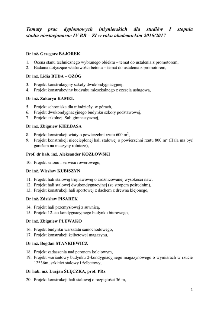 Tematy prac dyplomowych inżynierskich dla studiów I studia niestacjonarne IV BB – ZI w roku akademickim 2016/2017 stopnia Dr inż. Grzegorz BAJOREK 1. 2. Ocena stanu technicznego wybranego obiektu – temat do ustalenia z promotorem, Badania dotyczące właściwości betonu – temat do ustalenia z promotorem, Dr inż. Lidia BUDA – OŻÓG 3. 4. Projekt konstrukcyjny szkoły dwukondygnacyjnej, Projekt konstrukcyjny budynku mieszkalnego z częścią usługową, Dr inż. Zakarya KAMEL 5. 6. 7. Projekt schroniska dla młodzieży w górach, Projekt dwukondygnacyjnego budynku szkoły podstawowej, Projekt szkolnej Sali gimnastycznej, Dr inż. Zbigniew KIEŁBASA 8. 9. Projekt konstrukcji wiaty o powierzchni rzutu 600 m2, Projekt konstrukcji nieocieplonej hali stalowej o powierzchni rzutu 800 m2 (Hala ma być garażem na maszyny rolnicze), Prof. dr hab. inż. Aleksander KOZŁOWSKI 10. Projekt salonu i serwisu rowerowego, Dr inż. Wiesław KUBISZYN 11. Projekt hali stalowej trójnawowej o zróżnicowanej wysokości naw, 12. Projekt hali stalowej dwukondygnacyjnej (ze stropem pośrednim), 13. Projekt konstrukcji hali sportowej z dachem z drewna klejonego, Dr inż. Zdzisław PISAREK 14. Projekt hali przemysłowej z suwnicą, 15. Projekt 12-sto kondygnacyjnego budynku biurowego, Dr inż. Zbigniew PLEWAKO 16. Projekt budynku warsztatu samochodowego, 17. Projekt konstrukcji żelbetowej magazynu, Dr inż. Bogdan STANKIEWICZ 18. Projekt zadaszenia nad peronem kolejowym, 19. Projekt wariantowy budynku 2-kondygnacyjnego magazynowego o wymiarach w rzucie 12*36m, szkielet stalowy i żelbetowy, Dr hab. inż. Lucjan ŚLĘCZKA, prof. PRz 20. Projekt konstrukcji hali stalowej o rozpiętości 36 m, 1 Dr inż. Andrzej WOJNAR 21. Projekt konstrukcji obiektu sportowego, 22. Projekt konstrukcji zadaszenia nad basenem pływackim, Dr hab. inż. Szczepan WOLIŃSKI, prof. PRz 23. Projekt konstrukcji prefabrykowanej żelbetowej trybuny sportowej na 10 tys. widzów, 24. Projekt żelbetowej ramowej konstrukcji prefabrykowanej 3 kondygnacyjnego magazynu, Dr inż. Krystyna WRÓBEL 25. Projekt 3-kondygnacyjnego pawilonu handlowego o konstrukcji żelbetowej szkieletowej, 26. Projekt 4-kondygnacyjnego budynku biurowego o konstrukcji żelbetowej szkieletowej. 2