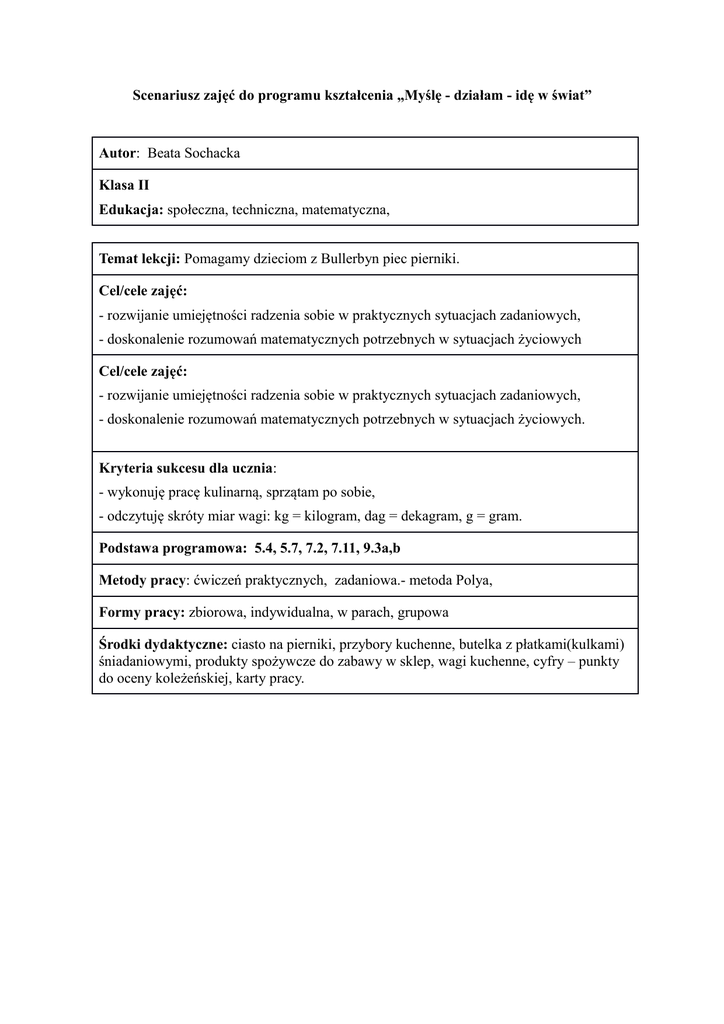 Scenariusz zajęć do programu kształcenia „Myślę - działam - idę w świat” Autor: Beata Sochacka Klasa II Edukacja: społeczna, techniczna, matematyczna, Temat lekcji: Pomagamy dzieciom z Bullerbyn piec pierniki. Cel/cele zajęć: - rozwijanie umiejętności radzenia sobie w praktycznych sytuacjach zadaniowych, - doskonalenie rozumowań matematycznych potrzebnych w sytuacjach życiowych Cel/cele zajęć: - rozwijanie umiejętności radzenia sobie w praktycznych sytuacjach zadaniowych, - doskonalenie rozumowań matematycznych potrzebnych w sytuacjach życiowych. Kryteria sukcesu dla ucznia: - wykonuję pracę kulinarną, sprzątam po sobie, - odczytuję skróty miar wagi: kg = kilogram, dag = dekagram, g = gram. Podstawa programowa: 5.4, 5.7, 7.2, 7.11, 9.3a,b Metody pracy: ćwiczeń praktycznych, zadaniowa.- metoda Polya, Formy pracy: zbiorowa, indywidualna, w parach, grupowa Środki dydaktyczne: ciasto na pierniki, przybory kuchenne, butelka z płatkami(kulkami) śniadaniowymi, produkty spożywcze do zabawy w sklep, wagi kuchenne, cyfry – punkty do oceny koleżeńskiej, karty pracy. Przebieg zajęć „Drogowskazy” -wskazówki Centra Aktywnej Edukacji i uwagi o realizacji Organizacja pracy: • Wcześniej przygotowujemy ciasto na pierniki – dobrą praktyką w tym zakresie jest współpraca z Rodzicami. • Ustalamy z obsługą kuchni termin i czas pieczenia. • Stoliki nakrywamy ceratą. • Uczniowie w ramach zadania domowego, przygotowują fartuszki, deseczki, wałki do ciasta, kuchenne ściereczki. • Nauczyciel przygotowuje produkty (według przepisu na pierniki) do zabawy w sklep oraz wagi kuchenne. 1. Powitanie w porannym kręgu - rozmowa, inspirowana polonistyczno – przygotowanym ciastem: Kto wykonał, w jakim celu, z jakich komunikacyjne produktów, jakich zasad należy przestrzegać podczas pracy? 2. Pasowanie na piekarzy; • Nauczyciel pasuje każdego ucznia na małego piekarza, kładąc drewnianą łyżkę na ramieniu i wsypując mąkę do dłoni. • Zadaniem ucznia jest donieść mąkę na swoje miejsce pracy. 3. W piekarni - praca indywidualna każdego ucznia: wałkowanie ciasta, wyciskanie pierników za pomocą foremek, układanie na artystyczno – ruchowe blaszkach – pierwsze kryterium sukcesu. 4. Przekazanie pierników do kuchni. • pieczenie nadzoruje osoba wspomagająca, rodzic lub obsługa kuchni. 5. Czynności porządkowe. 6. Ćwiczenie interaktywne - krzyżówka „Świąteczne tradycje w Bullerbyn” http://learningapps.org/display?v=pg1ojw7mt01 polonistyczno komunikacyjne 7. Zabawa z Bullerbyn „Poparz, pomyśl, oszacuj” matematyczno – • Uczniowie dobierają się w pary. przyrodnicze • Nauczyciel pokazuje butelkę np. po wodzie mineralnej, w której znajdują się kulki śniadaniowe. • Każda para szacuje, ile kulek jest w butelce. • Para, która odgadnie najlepiej, otrzymuje brawa i prawo do prowadzenia zajęć. 8. Liczenie w zakresie 100 • Para zwycięska wysypuje kulki do miski i głośno przelicza. matematyczno – przyrodnicze • Kulki odliczone wędrują do foliowej torebki. • Następnie uczniowie ważą produkt i podają wynik w gramach i dekagramach np.: 150 g to 15 dag 9. Ważenie produktów w parach – drugie kryterium sukcesu • Uczniowie ważą produkt, jeden podaje wagę w gramach, druki uczeń w dekagramach. • Pozostali uczniowie słuchają i przydzielają punkty – ocena koleżeńska – technika OK: 0 p. – brak poprawnych odpowiedzi, 1 p. – poprawna 1 odpowiedź, 2 p. - dwie odpowiedzi poprawne. 10. Lukrowanie i zdobienie pierników artystyczno – ruchowe 11. Słodki poczęstunek - smakowanie wypieków, picie herbatki. 12. Zabawa w sklep - uczniowie pracują w 2 grupach. • Każdy zespół otrzymuje przepis na pierniki, udaje się do sklepu i przygotowuje produkty zgodnie z listą – karta pracy, zał. nr 1 • Warto, aby w sklepie były rzeczywiste produkty w ilości dla 2 grup. 13. Ocena przygotowanych produktów – porównanie pracy zespołów. matematyczno – przyrodnicze 14. Rozwiązywanie zadań matematycznych– karta pracy -zał. 2 matematyczno - 3. przyrodnicze 15. Przygotowanie słodkich upominków dla domowników atystyczno - (pierniczki, folia przeźroczysta, wstążeczka) ruchowe 16. Podsumowanie zajęć techniką emotikomów. Załącznik 1 Karta pracy dla grupy Zadanie 1 „ Zakupy” Współpracując w grupie, udajcie się do sklepu, kupcie produkty zgodnie z listą: • kostka masła • proszek do pieczenia • kilogram cukru • soda oczyszczona • 2 jajka •kakao • kilogram mąki pszennej • przyprawa do piernika • 250 g miodu • sól Zadanie 2 Przygotujcie produkty zgodnie z wagą podaną na liście. • 100 g masła • 250 g cukru • 2 jajka • 500 g mąki pszennej • 250 g miodu • 1/2 łyżeczki soli • 1/2 łyżeczki proszku do pieczenia • 1,5 łyżeczki sody oczyszczonej • 10 g kakao • 10 g przyprawy do piernika Załącznik 2 Karta pracy dla grupy Do przygotowania ciasta na pierniki potrzeba: • 100 g masła • 250 g cukru • 2 jajka • 500 g mąki pszennej • 250 g miodu • 1/2 (czyli 0,5) łyżeczki soli • 1/2 (0,5) łyżeczki proszku do pieczenia • 1,5 (0,5) łyżeczki sody oczyszczonej • 10 g kakao • 10 g przyprawy do piernika Zadanie 1 Oblicz, ile cukru i mąki potrzebuje mama, aby przygotować 2 porcje ciasta na pierniki. Zadanie 2 Wiedząc, że: 1 kg = 100 dag 100 dag =1000 g; oblicz: 1.Ile cukru zostanie z 1 kg, po przygotowaniu 2 porcji ciasta na pierniki? 2.Czy na przygotowanie 2 porcji ciasta, wystarczy 1 kg maki? • Zapisz obliczenia i odpowiedzi