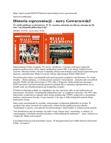https://sport.tvp.pl/24452478/historia-reprezentacji-nowy-gowarzewski Sportowa biblioteka Historia reprezentacji – nowy Gowarzewski! To wielki jubileusz wydawnictwa. W 25. rocznicę założenia tej oficyny ukazuje się 50. tom "encyklopedii piłkarskiej Fuji". SPORT.TVP.PL 16.03.2016 10:02 Reprezentacja Polski rozegrała 793 mecze. Spotkanie z Ukrainą, kończące rozgrywki grupowe podczas Euro 2016, będzie spotkaniem numer 800. Z tej okazji Andrzej Gowarzewski z Bożeną Szmel i Jerzym Cierpiatką oferuje nam kolejną część historii najważniejszej drużyny, zatytułowaną "Biało-Czerwoni. Dzieje reprezentacji Polski 2008-2015". Wcześniej pięć tomów encyklopedii było poświęconych zespołowi narodowemu. Ta, szósta książka – chyba najlepsza, z rewelacyjnymi opisami i statystykami – domyka opis wszystkich meczów Polski od tego pierwszego w 1921 roku z Węgrami. Skala dzieła jest ogromna i PZPN powinien Gowarzewskiemu postawić pomnik lub co najmniej zaproponować, by te książki stały się oficjalną propozycją księgarską związku. Wydawca informuje jednak, że współpracy nie ma i nie kryje żalu, że jest traktowany po macoszemu. 50 tomów "encyklopedii piłkarskiej Fuji" to wyjątkowe zjawisko. Od 1991 roku katowickie wydawnictwo opisało także dzieje polskiej ligi i PZPN, rozgrywki o europejskie puchary, mistrzostwa Europy i Copa America. I do tego w kilku kolejnych tomach dzieje mistrzostw świata. Duża część encyklopedii to roczniki, relacjonujące wydarzenia piłkarskie ze świata. W zeszłym roku autor zawiesił ich wydawanie, zostawił tylko publicystyczną rubrykę "Szelontanie w gowie, czyli główki Gowarzewskiego", która będzie w tematycznych tomach. "Już dwadzieścia pięć lat staramy się robić swoje, burząc mity i niewiedzę, w nadziei, że wspomagamy wizerunek narodowej kultury wokół piłkarskich stadionów" – pisze Andrzej we wstępie do "Biało-czerwonych". I tej kulturotwórczej roli pozostanie wierny. W przygotowaniu jest wielka historia mistrzostw Polski. 10 tomów!