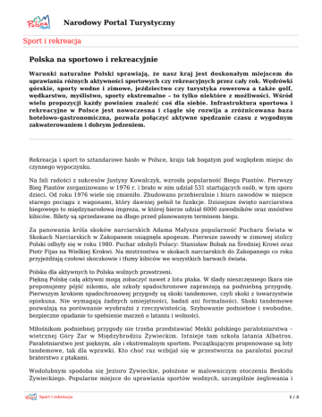 Narodowy Portal Turystyczny Sport i rekreacja Polska na sportowo i rekreacyjnie Warunki naturalne Polski sprawiają, że nasz kraj jest doskonałym miejscem do uprawiania różnych aktywności sportowych czy rekreacyjnych przez cały rok. Wędrówki górskie, sporty wodne i zimowe, jeździectwo czy turystyka rowerowa a także golf, wędkarstwo, myślistwo, sporty ekstremalne – to tylko niektóre z możliwości. Wśród wielu propozycji każdy powinien znaleźć coś dla siebie. Infrastruktura sportowa i rekreacyjne w Polsce jest nowoczesna i ciągle się rozwija a zróżnicowana baza hotelowo-gastronomiczna, pozwala połączyć aktywne spędzanie czasu z wygodnym zakwaterowaniem i dobrym jedzeniem. Rekreacja i sport to sztandarowe hasło w Polsce, kraju tak bogatym pod względem miejsc do czynnego wypoczynku. Na fali radości z sukcesów Justyny Kowalczyk, wzrosła popularność Biegu Piastów. Pierwszy Bieg Piastów zorganizowano w 1976 r. i brało w nim udział 531 startujących osób, w tym sporo dzieci. Od roku 1976 wiele się zmieniło. Zbudowano przebieralnie i biuro zawodów w miejsce starego pociągu z wagonami, który dawniej pełnił te funkcje. Dzisiejsze święto narciarstwa biegowego to międzynarodowa impreza, w której bierze udział 6000 zawodników oraz mnóstwo kibiców. Bilety są sprzedawane na długo przed planowanym terminem biegu. Za panowania króla skoków narciarskich Adama Małysza popularność Pucharu Świata w Skokach Narciarskich w Zakopanem osiągnęła apogeum. Pierwsze zawody w zimowej stolicy Polski odbyły się w roku 1980. Puchar zdobyli Polacy: Stanisław Bobak na Średniej Krowi oraz Piotr Fijas na Wielkiej Krokwi. Na mistrzostwa w skokach narciarskich do Zakopanego co roku przyjeżdżają czołowi skoczkowie i tłumy kibiców we wszystkich barwach świata. Polska dla aktywnych to Polska wolnych przestrzeni. Piękną Polskę całą aktywni mogą zobaczyć nawet z lotu ptaka. W ślady nieszczęsnego Ikara nie proponujemy pójść nikomu, ale szkoły spadochronowe zapraszają na podniebną przygodę. Pierwszym krokiem spadochronowej przygody są skoki tandemowe, czyli skoki z towarzystwie opiekuna. Nie wymagają żadnych umiejętności, badań ani formalności. Skoki tandemowe pozwalają na porównanie wyobraźni z rzeczywistością. Szybowanie podniebne i swobodne, bezpieczne opadanie to spełnienie marzeń o lataniu i wolności. Miłośnikom podniebnej przygody nie trzeba przedstawiać Mekki polskiego paralotniarstwa – wietrznej Góry Żar w Międzybrodziu Żywieckim. Istnieje tam szkoła latania Albatros. Paralotniarstwo jest pięknym, ale i ekstremalnym sportem. Początkującym proponowane są loty tandemowe, tak dla wprawki. Kto choć raz wzbijał się w przestworza na paralotni poczuł braterstwo z ptakami. Wodolubnym spodoba się Jezioro Żywieckie, położone w malowniczym otoczeniu Beskidu Żywieckiego. Popularne miejsce do uprawiania sportów wodnych, szczególnie żeglowania i Sport i rekreacja 1/3 Narodowy Portal Turystyczny Sport i rekreacja windsurfingu. Centra nurkowe są świetnie przygotowanymi ośrodkami sportów podwodnych. Nurkowanie odbywa się w zalanych wyrobiskach kopalni dolomitu, gdzie dodatkową atrakcją są zatopione na dnie koparki lub w innych akwenach z ciekawymi „zabawkami" na dnie. Na wodolubnych i spragnionych wrażeń czekają rafting na Dunajcu i kajakarstwo górskie oraz aquaparki za wodą naturalnie mineralizowaną. Warto wziąć udział w spływach kajakowych na Lubrzańskim Szlaku Kajakowym. Lubuskie sprzyja wypoczynkowi nad wodą. W Lubniewicach jest więcej jezior niż lądu, Łagów z wieżą widokową i szlakami nad brzegiem jeziora, Dąbie ze wspaniałą plażą, czy Lubrza z jeziorem pośrodku lasu. Miłośnikom żeglarstwa Polska nie daje najmniejszego powodu do narzekania. Najpopularniejszym miejscem jest oczywiście Bałtyk oraz Kraina Wielkich Jezior Mazurskich i Solina. Kultowa jest już dzisiaj polska żaglówka Omega. Wiele pokoleń żeglarzy swoje pierwsze rejsy odbywało na popularnej Omce. Omega także na wojnie walczyła - służyła do szkoleń żeglarskich żołnierzy Armii Krajowej. Współczesny żeglarz, po otrzymaniu chrztu z rąk Neptuna oraz jego żony Prozerpiny, może rozwinąć żagle i wypłynąć po horyzont szukać swojego szczęścia. Małe Morze w Kuźnicy na Mierzei Helskiej jest Mekką miłośników windsurfingu. Płycizny Zatoki Puckiej, to jedno z najlepszych miejsc do nauki oraz uprawiania windsurfingu w Europie. Kilka lekcji w działających w Kuźnicy szkołach wystarczy, aby mknąć hożo za widnokrąg na szerokich kadłubach i lekkich żaglach. Deska, żagiel i wiatr dostarczają wrażeń i ładują akumulatory na zmagania z codziennością. Kluby golfowe w wielu miastach Polski zapraszają na pola golfowe. Pasjonaci mawiają, że golf jest bardziej ekscytujący niż wyścigi, karty, spekulacje czy związki małżeńskie. W golfie obowiązuje kodeks etyczny. Zasady, które każdy golfista zna, i których przestrzega. Pola golfowe ciągną się aż po horyzont, tam gdzie lazur nieba spotyka zieleń trawy. Tradycja gry w golfa w Polsce odradza się od lat 90. XX w. Ale golf w Polsce był już popularny przed 1939 r. Życzymy wszystkimi zielonych kart. Wędrowniczków górskich ucieszy gondolowa kolej linowa na Szyndzielnię. Szczyt góry, z której roztacza się piękna panorama Bielska-Białej i Beskidów to doskonały punkt wypadowy na malownicze trasy górskie. Druga kolej linowo-torowa prowadzi na górę Żar. Zbocze góry Żar jest słynne też z tego, że samochody jadą tam pod górę. Wędrując szklakami górskimi idziemy w zasadzie w nieznane. Po drodze spotkać możemy wszystko. Zwierzęta i ludzi, lasy i polany, strumienie i wodospady. Osiągając szczyt poznajemy sens życia i towarzyszy nam niesamowite uczucie wolności! Dla miłośników pieszych i rowerowych wycieczek opolskie przygotowało szlaki turystyczne w rejonie Gór Opawskich, Góry Świętej