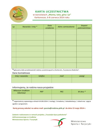 KARTA UCZESTNICTWA w warsztatach „Mama, tata, góry i ja” Karkonosze, 6-8 czerwca 2014 roku Lp. Data urodzenia Nazwisko i imię * Adres zamieszkania Stopień pokrewieństwa *zgłaszamy tylko przedstawicieli rodziny uczestniczących w Konkursie „Turystyczna Rodzinka”. Dane kontaktowe Imię i nazwisko telefon mail uwagi PKS W dniu * Informujemy, że rodzina nasza przyjedzie: Własnym środkiem lokomocji PKP * organizatorzy zapewniają w dniach 6-8.06.2014: 2 noclegi, 2 śniadania, 2 obiadokolacje, 1 obiad oraz zgodne z programem. Kartę proszę odesłać na adres mail: [email protected] do dnia 15 maja 2014 r. Zadanie realizowane w ramach projektu „Turystyka łączy pokolenia” dofinansowanego ze środków Ministerstwa Sportu i Turystyki zajęcia