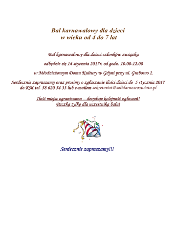 Bal karnawałowy dla dzieci w wieku od 4 do 7 lat Bal karnawałowy dla dzieci członków związku odbędzie się 14 stycznia 2017r. od godz. 10.00-12.00 w Młodzieżowym Domu Kultury w Gdyni przy ul. Grabowo 2. Serdecznie zapraszamy oraz prosimy o zgłaszanie ilości dzieci do 5 stycznia 2017 do KM tel. 58 620 54 33 lub e-mailem [email protected] Ilość miejsc ograniczona – decyduje kolejność zgłoszeń! Paczka tylko dla uczestnika balu! Serdecznie zapraszamy!!!