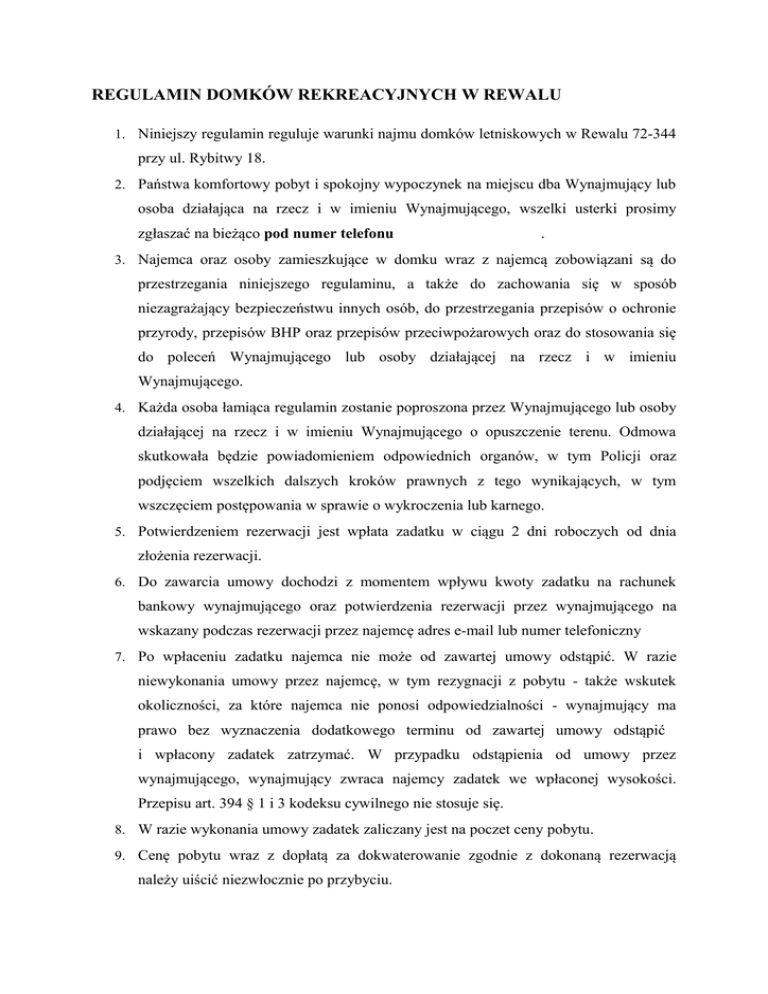 REGULAMIN DOMKÓW REKREACYJNYCH W REWALU 1. Niniejszy regulamin reguluje warunki najmu domków letniskowych w Rewalu 72-344 przy ul. Rybitwy 18. 2. Państwa komfortowy pobyt i spokojny wypoczynek na miejscu dba Wynajmujący lub osoba działająca na rzecz i w imieniu Wynajmującego, wszelki usterki prosimy zgłaszać na bieżąco pod numer telefonu . 3. Najemca oraz osoby zamieszkujące w domku wraz z najemcą zobowiązani są do przestrzegania niniejszego regulaminu, a także do zachowania się w sposób niezagrażający bezpieczeństwu innych osób, do przestrzegania przepisów o ochronie przyrody, przepisów BHP oraz przepisów przeciwpożarowych oraz do stosowania się do poleceń Wynajmującego lub osoby działającej na rzecz i w imieniu Wynajmującego. 4. Każda osoba łamiąca regulamin zostanie poproszona przez Wynajmującego lub osoby działającej na rzecz i w imieniu Wynajmującego o opuszczenie terenu. Odmowa skutkowała będzie powiadomieniem odpowiednich organów, w tym Policji oraz podjęciem wszelkich dalszych kroków prawnych z tego wynikających, w tym wszczęciem postępowania w sprawie o wykroczenia lub karnego. 5. Potwierdzeniem rezerwacji jest wpłata zadatku w ciągu 2 dni roboczych od dnia złożenia rezerwacji. 6. Do zawarcia umowy dochodzi z momentem wpływu kwoty zadatku na rachunek bankowy wynajmującego oraz potwierdzenia rezerwacji przez wynajmującego na wskazany podczas rezerwacji przez najemcę adres e-mail lub numer telefoniczny 7. Po wpłaceniu zadatku najemca nie może od zawartej umowy odstąpić. W razie niewykonania umowy przez najemcę, w tym rezygnacji z pobytu - także wskutek okoliczności, za które najemca nie ponosi odpowiedzialności - wynajmujący ma prawo bez wyznaczenia dodatkowego terminu od zawartej umowy odstąpić i wpłacony zadatek zatrzymać. W przypadku odstąpienia od umowy przez wynajmującego, wynajmujący zwraca najemcy zadatek we wpłaconej wysokości. Przepisu art. 394 § 1 i 3 kodeksu cywilnego nie stosuje się. 8. W razie wykonania umowy zadatek zaliczany jest na poczet ceny pobytu. 9. Cenę pobytu wraz z dopłatą za dokwaterowanie zgodnie z dokonaną rezerwacją należy uiścić niezwłocznie po przybyciu. 10. Rezygnacja z części pobytu, późniejszy przyjazd lub wcześniejsze opuszczenie ośrodka z przyczyn nieleżących po stronie wynajmującego nie uprawnia do obniżenia lub zwrotu ceny za pobyt zgodnie z zawartą umową. 11. Za zgodą Wynajmującego lub osoby działającej na rzecz i w imieniu Wynajmującego, po wniesieniu dodatkowej opłaty na wniosek najemcy do najmowanego domku może zostać dokwaterowana dodatkowa osoba. 12. Pobyt osób niepełnoletnich w domkach letniskowych w Rewalu 72-344 ul. Rybitwy 18 możliwy jest tylko pod opieką osoby pełnoletniej. 13. Na zabezpieczenia szkód materialnych wyrządzonych przez najemcą oraz osoby zamieszkujące w domku wraz z najemcą najemca wnosi przy zameldowaniu u kierownictwa ośrodka zwrotną kaucję w wysokości 200,00 zł. 14. Po przekazaniu domku najemcy najemca jest zobowiązany do sprawdzenia stanu wyposażenia domku oraz podpisania protokołu odbiorczego. 15. W ośrodku obowiązuje doba hotelowa, która trwa od godziny 16:00 do godziny 10:00 dnia następnego. 16. Na terenie ośrodka znajduje się ogrodzony parking niestrzeżony. Do bezpłatnej dyspozycji najemcy każdego domku jest 1 miejsce parkingowe. 17. Wynajmujący nie ponosi odpowiedzialności za szkody powstałe w wyniku pozostawienia przez najemcę samochodu na parkingu, o którym mowa w punkcie 20 (w tym za kradzież samochodu), ani za jakiekolwiek inne szkody powstałe w wyniku pozostawienia przez najemcę lub osoby zamieszkujące w domku wraz z najemcą jakichkolwiek rzeczy na terenie ośrodka. 18. Wynajmujący nie przyjmuje żadnych rzeczy na przechowanie. Obowiązek zabezpieczenia swoich rzeczy przed kradzieżą lub zniszczeniem spoczywa na ich właścicielach. 19. Wynajmujący nie ponosi odpowiedzialności za niedogodności w pobycie powstałe z przyczyn niezależnych od wynajmującego, np. przerwy w dostawie prądu lub wody. 20. Na terenie posesji w Rewalu 72-344 przy ul. Rybitwy 18 obowiązuje cisza nocna w godzinach od 22:00 do 7:00. 21. Goście mogą przebywać na terenie posesji w Rewalu 72-344 przy ul. Rybitwy 18 wyłącznie w godzinach od 8:00 do 21:00. 22. Rozpalanie grilla na terenie ośrodka dozwolone jest wyłącznie w miejscach do tego wyznaczonych przez Wynajmującego lub osoby działającej na rzecz i w imieniu Wynajmującego z zachowaniem szczególnej ostrożności oraz przepisów przeciwpożarowych. 23. W domkach obowiązuje bezwzględny zakaz używania otwartego ognia i palenia papierosów. Każdorazowe złamanie tego zakazu skutkuje obowiązkiem zapłaty do rąk kierownictwa ośrodka kary pieniężnej w wysokości 300,00 zł. 24. W przypadku pożaru lub innego zagrożenia wszystkie osoby przebywająca na terenie posesji zobowiązane są postępować zgodnie z wywieszoną w domku instrukcją przeciwpożarową. 25. Nie zezwala się na pobyt zwierząt na terenie posesji w Rewalu 72-344 przy ul. Rybitwy 18 chyba że zostało to uzgodnione z Wynajmującym lub osobą działającą na rzecz i w imieniu Wynajmującego. 26. Najemca jest zobowiązany do zdania domku w stanie zgodnym z protokołem odbiorczym. 27. Najemca ponosi odpowiedzialność za wszelkie braki w wyposażeniu najmowanego domku oraz wszelkie inne szkody materialne w mieniu Wynajmującego wyrządzone przez najemcę i osoby zamieszkujące w domku wraz z najemcą. 28. Wykorzystanie przez wynajmującego kaucji, o której mowa w punkcie 13 nie ogranicza prawa wynajmującego do dochodzenia od osób wskazanych w punkcie 31 dalszych roszczeń odszkodowawczych ponad kwotę wpłaconej kaucji. 29. Przed opuszczeniem posesji w Rewalu 72-344 przy ul. Rybitwy 18 najemca zobowiązany jest posprzątać najmowany domek i teren wokół domku oraz wynieść nieczystości do pojemników na śmieci. 30. Po zakończonym pobycie najemca zo