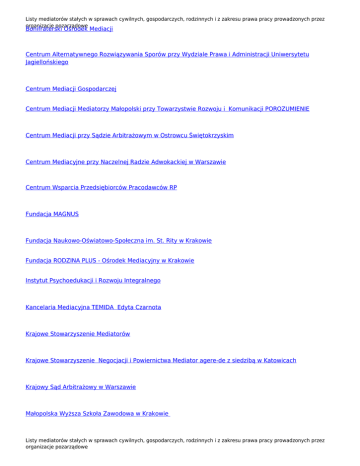 Listy mediatorów stałych w sprawach cywilnych, gospodarczych, rodzinnych i z zakresu prawa pracy prowadzonych przez organizacje pozarządowe Bonifraterski Ośrodek Mediacji Centrum Alternatywnego Rozwiązywania Sporów przy Wydziale Prawa i Administracji Uniwersytetu Jagiellońskiego Centrum Mediacji Gospodarczej Centrum Mediacji Mediatorzy Małopolski przy Towarzystwie Rozwoju i Komunikacji POROZUMIENIE Centrum Mediacji przy Sądzie Arbitrażowym w Ostrowcu Świętokrzyskim Centrum Mediacyjne przy Naczelnej Radzie Adwokackiej w Warszawie Centrum Wsparcia Przedsiębiorców Pracodawców RP Fundacja MAGNUS Fundacja Naukowo-Oświatowo-Społeczna im. St. Rity w Krakowie Fundacja RODZINA PLUS - Ośrodek Mediacyjny w Krakowie Instytut Psychoedukacji i Rozwoju Integralnego Kancelaria Mediacyjna TEMIDA Edyta Czarnota Krajowe Stowarzyszenie Mediatorów Krajowe Stowarzyszenie Negocjacji i Powiernictwa Mediator agere-de z siedzibą w Katowicach Krajowy Sąd Arbitrażowy w Warszawie Małopolska Wyższa Szkoła Zawodowa w Krakowie Listy mediatorów stałych w sprawach cywilnych, gospodarczych, rodzinnych i z zakresu prawa pracy prowadzonych przez organizacje pozarządowe Listy mediatorów stałych w sprawach cywilnych, gospodarczych, rodzinnych i z zakresu prawa pracy prowadzonych przez organizacje pozarządowe Małopolski Uczniowski Klub Zapaśniczy GLADIATOR Małopolskie Centrum Arbitrażu i Mediacji przy Izbie Przemysłowo-Handlowej w Krakowie Małopolskie Centrum Mediacji w Krakowie Małopolskie Stowarzyszenie Mediacji w Krakowie Miejski Ośrodek Pomocy Społecznej w Bukownie Niezależny Samodzielny Związek Zawodowy SOLIDARNOŚĆ Okręgowa Izba Radców Prawnych w Krakowie Ośrodek Mediacji Fundacji Wydziału Prawa i Administracji Uniwersytetu Śląskiego FACULTAS luridica Ośrodek Mediacji Fundacji Obrony Praw Człowieka Ośrodek Mediacji przy Stowarzyszeniu Inżynierów Doradców i Rzeczoznawców Ośrodek Mediacyjny przy Stowarzyszeniu Pomocy Poszkodowanym w Wypadkach, Kolizajach Drogowych oraz na skutek Błędów Lekarskich WOKANDA Ośrodek Mediacji przy Wyższej Szkole Menadżerskiej w Warszawie Ośrodek Mediacyjny Stowarzyszenia Notariuszy Rzeczypospolitej Polskiej Ośrodek Pomocy Społecznej w Libiążu Polskie Centrum Mediacji - Oddział w Krakowie Polskie Centrum Mediacji DIALOG Stowarzyszenie ALTERNATYWA MEDIATORZY MAłOPOLSKI-CENTRUM MEDIACJI Listy mediatorów stałych w sprawach cywilnych, gospodarczych, rodzinnych i z zakresu prawa pracy prowadzonych przez organizacje pozarządowe Listy mediatorów stałych w sprawach cywilnych, gospodarczych, rodzinnych i z zakresu prawa pracy prowadzonych przez organizacje pozarządowe Stowarzyszenie Inicjatyw Społecznych Solny Gwarek Stowarzyszenie IN PLUS Stowarzyszenie MAŁOPOLSKIE CENTRUM MEDIACJI W KRAKOWIE Stowarzyszenie Mediatorów i Edukatorów MEDIANART Stowarzyszenie Mediatorów Gospodarczych Stowarzyszenie Mediatorów, Negocjatorów i Koncyliatorów A.S.A.M Stowarzyszenie Mediatorów Polskich Stowarzyszenie MEDIATORZY POLSCY Stowarzyszenie Psychologiczno-Pedagogiczne ANTIDOTUM Stowarzyszenie Psychologów, Prawników i Mediatorów QUALIS VITA Stowarzyszenie Psychologów Sądowych w Polsce Stowarzyszenie Syndyków, Rzeczoznawców i Doradców Gospodarczych Polska-Europa Terenowy Komitet Ochrony Praw Dziecka - Ośrodek Mediacyjno-Interwencyjny Wyższa Szkoła Bankowa Listy mediatorów stałych w sprawach cywilnych, gospodarczych, rodzinnych i z zakresu prawa pracy prowadzonych przez organizacje pozarządowe