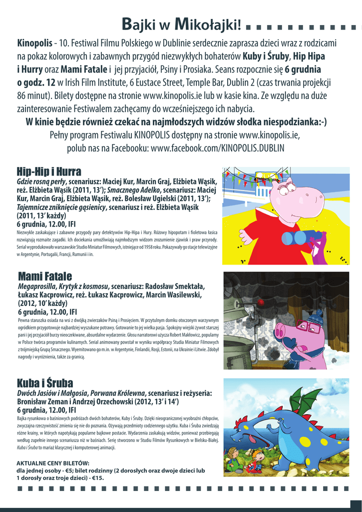 Bajki w Mikołajki! ............ Kinopolis - 10. Festiwal Filmu Polskiego w Dublinie serdecznie zaprasza dzieci wraz z rodzicami na pokaz kolorowych i zabawnych przygód niezwykłych bohaterów Kuby i Śruby, Hip Hipa i Hurry oraz Mami Fatale i jej przyjaciół, Psiny i Prosiaka. Seans rozpocznie się 6 grudnia o godz. 12 w Irish Film Institute, 6 Eustace Street, Temple Bar, Dublin 2 (czas trwania projekcji 86 minut). Bilety dostępne na stronie www.kinopolis.ie lub w kasie kina. Ze względu na duże zainteresowanie Festiwalem zachęcamy do wcześniejszego ich nabycia. W kinie będzie również czekać na najmłodszych widzów słodka niespodzianka:-) Pełny program Festiwalu KINOPOLIS dostępny na stronie www.kinopolis.ie, polub nas na Facebooku: www.facebook.com/KINOPOLIS.DUBLIN Hip-Hip i Hurra Gdzie rosną perły, scenariusz: Maciej Kur, Marcin Graj, Elżbieta Wąsik, reż. Elżbieta Wąsik (2011, 13’); Smacznego Adelko, scenariusz: Maciej Kur, Marcin Graj, Elżbieta Wąsik, reż. Bolesław Ugielski (2011, 13’); Tajemnicze zniknięcie gąsienicy, scenariusz i reż. Elżbieta Wąsik (2011, 13’ każdy) 6 grudnia, 12.00, IFI Niezwykle zaskakujące i zabawne przygody pary detektywów Hip-Hipa i Hury. Różowy hipopotam i fioletowa łasica rozwiązują rozmaite zagadki. Ich dociekania umożliwiają najmłodszym widzom zrozumienie zjawisk i praw przyrody. Serial wyprodukowało warszawskie Studio Miniatur Filmowych, istniejące od 1958 roku. Pokazywały go stacje telewizyjne w Argentynie, Portugalii, Francji, Rumunii i in. Mami Fatale Megaprosilla, Krytyk z kosmosu, scenariusz: Radosław Smektała, Łukasz Kacprowicz, reż. Łukasz Kacprowicz, Marcin Wasilewski, (2012, 10’ każdy) 6 grudnia, 12.00, IFI Pewna staruszka osiada na wsi z dwójką zwierzaków Psiną i Prosięciem. W przytulnym domku otoczonym warzywnym ogródkiem przygotowuje najbardziej wyszukane potrawy. Gotowanie to jej wielka pasja. Spokojny wiejski żywot starszej pani i jej przyjaciół burzy nieoczekiwane, absurdalne wydarzenie. Głosu narratorowi użycza Robert Makłowicz, popularny w Polsce twórca programów kulinarnych. Serial animowany powstał w wyniku współpracy Studia Miniatur Filmowych z trójmiejską Grupą Smacznego. Wyemitowano go m.in. w Argentynie, Finlandii, Rosji, Estonii, na Ukrainie i Litwie. Zdobył nagrody i wyróżnienia, także za granicą. Kuba i Śruba Dwóch Jasiów i Małgosia, Porwana Królewna, scenariusz i reżyseria: Bronisław Zeman i Andrzej Orzechowski (2012, 13’ i 14’) 6 grudnia, 12.00, IFI Bajka rysunkowa o baśniowych podróżach dwóch bohaterów, Kuby i Śruby. Dzięki nieograniczonej wyobraźni chłopców, zwyczajna rzeczywistość zmienia się nie do poznania. Ożywają przedmioty codziennego użytku. Kuba i Śruba zwiedzają różne krainy, w których napotykają popularne bajkowe postacie. Wydarzenia zaskakują widzów, ponieważ przebiegają według zupełnie innego scenariusza niż w baśniach. Serię stworzono w Studiu Filmów Rysunkowych w Bielsku-Białej. Kuba i Śruba to mariaż klasycznej i komputerowej animacji. ................................ AKTUALNE CENY BILETÓW: dla jednej osoby - €5; bilet rodzinny (2 dorosłych oraz dwoje dzieci lub 1 dorosły oraz troje dzieci) - €15.