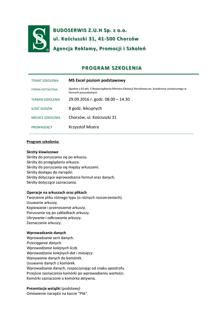 BUDOSERWIS Z.U.H Sp. z o.o. ul. Kościuszki 31, 41-500 Chorzów Agencja Reklamy, Promocji i Szkoleń P R OG RAM SZ KOL EN I A TEMAT SZKOLENIA MS Excel poziom podstawowy FORMA KSZTAŁCENIA Zgodnie z §3 pkt. 5 Rozporządzenia Ministra Edukacji Narodowej ws. kształcenia ustawicznego w formach pozaszkolnych TERMIN SZKOLENIA 29.09.2016 r. godz. 08.00 – 14.30 ILOŚĆ GODZIN 8 godz. lekcyjnych MIEJSCE SZKOLENIA Chorzów, ul. Kościuszki 31 PROWADZĄCY Krzysztof Mizera Program szkolenia: Skróty klawiszowe Skróty do poruszania się po arkuszu. Skróty do przeglądania arkusza. Skróty do poruszania się między arkuszami. Skróty dostępu do narzędzi. Skróty dotyczące wprowadzania formuł oraz danych. Skróty dotyczące zaznaczania. Operacje na arkuszach oraz plikach Tworzenie pliku różnego typu (o różnych rozszerzeniach). Usuwanie arkuszy. Kopiowanie i przenoszenie arkuszy. Poruszanie się po zakładkach arkuszy. Ukrywanie i odkrywanie arkuszy. Zaznaczanie arkuszy. Wprowadzanie danych Wprowadzanie serii danych. Przeciąganie danych. Wprowadzanie kolejnych liczb. Wprowadzanie kolejnych dat i miesięcy. Wpisywanie danych do komórek. Usuwanie danych z komórek. Wprowadzanie danych, rozpoczynając od znaku apostrofu. Przejście zaznaczenia komórki po wprowadzeniu wartości. Komórki zaznaczone a komórka aktywna. Prezentacja wstążki (podstawy) Omówienie narzędzi na karcie "Plik". Drukowanie. Zapisywanie pliku. Otwieranie pliku. Ostatnio używane. Omówienie narzędzi grupy "Czcionka", na karcie "Narzędzia główne". Nadawanie tła komórkom. Nadawanie obramowania komórkom. Zmiana koloru i rozmiaru czcionki. Omówienie narzędzi grupy "Wyrównanie", na karcie "Narzędzia główne". Dopasowanie tekstu do rozmiaru komórki za pomocą "Zawijaj tekst", "Zmniejsz aby dopasować" oraz "scal komórki". Wyrównywanie zawartości komórki w pionie oraz w poziomie. Zmiana kierunku zapisu tekstu (np. na pionowy). Zachowanie danych w scalanych komórkach. Omówienie narzędzi grupy "Liczba", na karcie "Narzędzia główne". Zamiana formatu danych na procentowy, liczbowy, dat, czasu, walutowy, księgowy. Zmiana ustawień separatora tysięcznego. Zmiana liczby prezentowanych miejsc po przecinku. Omówienie narzędzi grupy "Komórki", na karcie "Narzędzia główne". Wstawianie i usuwanie wierszy i kolumn. Automatyczne ustawianie wysokości wierszy i szerokości kolumn. Ręczne ustawianie wysokości wierszy i szerokości kolumn. Wklejanie z przesunięciem komórek. Przycisk pełnej palety narzędzi (starter okna dialogowego), wyświetlającej polecenia niedostępne na wstążce. Opcje programu Excel – karta "Plik". Referencje – odwołania Czym jest odwołanie się do komórki, czyli referencja. Referencje względne - odwołanie do komórek. Referencje bezwzględne - odwołanie do komórek przy użyciu znaku "$". Referencje mieszane w ramach jednego odwołania. Referencje do wielokomórkowych zakresów. Wiele referencji w jednej formule. Wprowadzanie danych do komórki, czyli "Tryb edycji". Przeciąganie (kopiowanie) formuł. Odwołania do innych arkuszy oraz do innych plików. Funkcje i formuły Różnice między funkcją a formułą. Operatory matematyczne: dodawanie, odejmowanie, mnożenie, dzielenie. Wprowadzanie funkcji. Wpisywanie funkcji bezpośrednio w komórce. Wprowadzanie funkcji narzędziem Wprowadź funkcję Wprowadzanie funkcji z polecenia na wstążce. Wprowadzanie argumentów funkcji. Wpisywanie argumentów bezpośrednio w komórce. Wykorzystanie okna "Wstawianie funkcji". Korzystanie z pomocy: opisy funkcji wraz z przykładami. Wykorzystanie narzędzia Autosumy. Wady i zalety. Błędy w formule. Rodzaje błędów. Funkcje matematyczne. SUMA, ŚREDNIA, ILOCZYN, ILE.LICZB, ILE.NIEPUSTYCH, MOD, PIERWIASTEK, POTĘGA. Funkcje pozycji. MIN, MAX, MIN.K, MAX.K. Funkcje zaokrągleń. ZAOKR, ZAOKR.DO.CAŁK, ZAOKR.DÓŁ, ZAOKR.GÓRA, ZAOKR.W.DÓŁ, ZAOKR.W.GÓRĘ. Funkcje logiczne. LUB, ORAZ, JEŻELI. JEŻELI.BŁĄD Tabele Tworzenie tabeli. Dodawanie kolumn w tabeli. Wstawianie wiersza podsumowania. Formatowanie tabeli. Wady i zalety tabel automatycznych. Filtrowanie i sortowane (podstawy) Wstawianie autofiltru. Sortowanie za pomocą autofiltru. Sortowanie liczb. Sortowanie dat. Sortowanie tekstów. Sortowanie wg kolorów. Filtrowanie za pomocą autofiltru. Filtrowanie z użyciem listy. Filtrowanie liczb. Filtrowanie dat. Filtrowanie tekstów. Filtrowanie wg kolorów. Ponowne stosowanie filtru. Usuwanie filtru. Widok Widoki arkusza. Widok normalny. Układ strony. Podgląd podziału stron. Widoki niestandardowe. Pełny ekran. Blokowanie elementów okna. Zamrażanie pierwszego wiersza i pierwszej kolumny. Zamrażanie dowolnych wierszy i kolumn. Dzielenia okna. Otwieranie jednego pliku w wielu oknach. Rozmieszczanie okien plików Excela. Wklej specjalnie (podstawy) Podstawowe kopiowanie oraz wklejanie danych. Zasady dotyczące wklejania specjalnie. Wklejanie wartości. Wklejanie formatów. Wklejanie formuł. Wykresy (podstawy) Jak stworzyć wykres. Typy wykresów. Wybór właściwego typu. Kolumnowy. Liniowy. Słupkowy. Kołowy. Punktowy. Formatowanie wyglądu wykresu. Kolor serii danych. Kolor tła. Rodzaj czcionki. Kolor konturu. Gotowe szablony układów wykresu. Wstawianie i edycja elementów wykresu. Tło wykresu. Tytuł wykresu. Legenda. Oś pionowa i pozioma. Linie pomocnicze. Etykiety osi. Etykiety danych. Drukowanie (podstawy) Ustawianie marginesów. Wybór zakresu drukowania. Drukowanie aktywnych arkuszy. Drukowanie całego pliku. Drukowanie zaznaczonych komórek. Ustawienia orientacji strony - pozioma i pionowa. Ustawienia rozmiaru kartki. Wstawianie nagłówka oraz stopki wydruku. Elementy graficzne Wstawianie obrazów. Wstawianie pól tekstowych. Wstawianie i edytowanie obiektów typu SmartArt. Komentarze. Wstawianie komentarzy. Usuwanie komentarzy. Edytowanie komentarzy. Ukrywanie i odkrywanie komentarzy. Funkcja WYSZUKAJ.PIONOWO (podstawy) Omówienie zastosowania i zasad dz