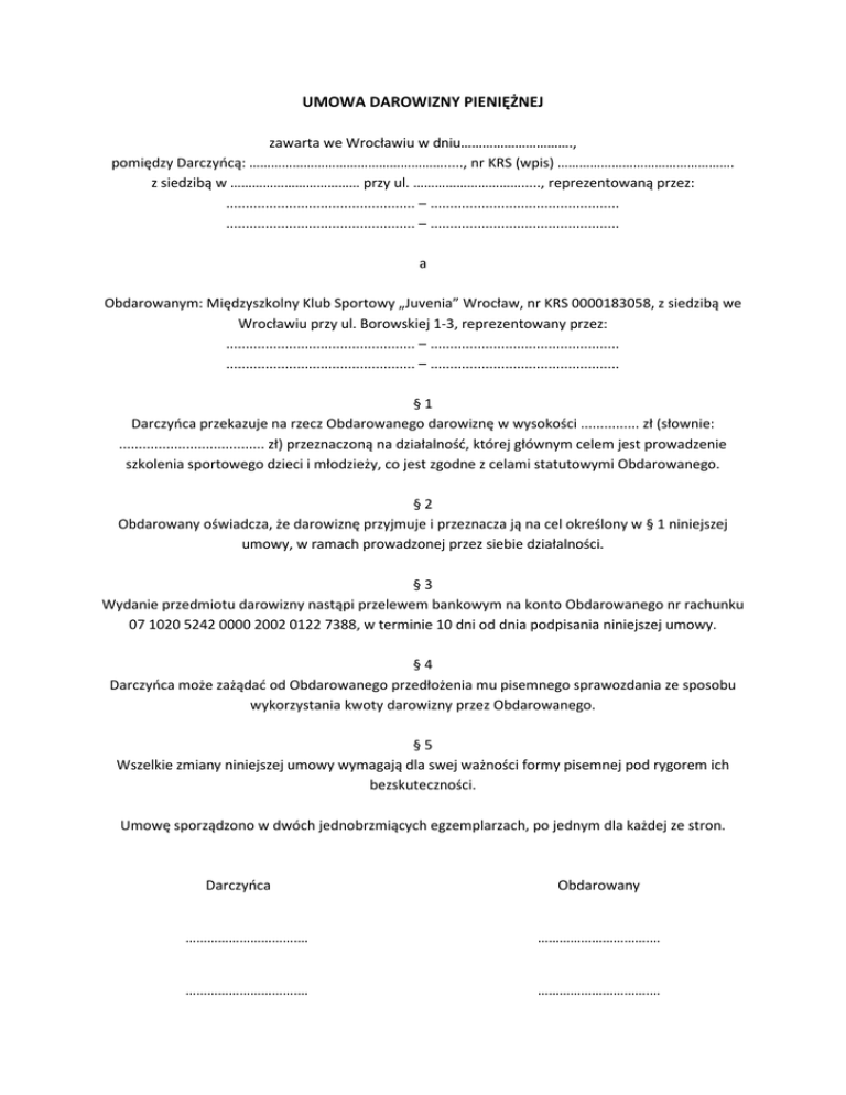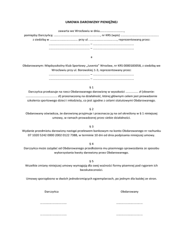 UMOWA DAROWIZNY PIENIĘŻNEJ zawarta we Wrocławiu w dniu…………………………., pomiędzy Darczyńcą: ………………………………………………....., nr KRS (wpis) …………………………………………. z siedzibą w ……………………………… przy ul. …………………………....., reprezentowaną przez: ................................................ – ................................................ ................................................ – ................................................ a Obdarowanym: Międzyszkolny Klub Sportowy „Juvenia” Wrocław, nr KRS 0000183058, z siedzibą we Wrocławiu przy ul. Borowskiej 1-3, reprezentowany przez: ................................................ – ................................................ ................................................ – ................................................ §1 Darczyńca przekazuje na rzecz Obdarowanego darowiznę w wysokości ............... zł (słownie: ..................................... zł) przeznaczoną na działalność, której głównym celem jest prowadzenie szkolenia sportowego dzieci i młodzieży, co jest zgodne z celami statutowymi Obdarowanego. §2 Obdarowany oświadcza, że darowiznę przyjmuje i przeznacza ją na cel określony w § 1 niniejszej umowy, w ramach prowadzonej przez siebie działalności. §3 Wydanie przedmiotu darowizny nastąpi przelewem bankowym na konto Obdarowanego nr rachunku 07 1020 5242 0000 2002 0122 7388, w terminie 10 dni od dnia podpisania niniejszej umowy. §4 Darczyńca może zażądać od Obdarowanego przedłożenia mu pisemnego sprawozdania ze sposobu wykorzystania kwoty darowizny przez Obdarowanego. §5 Wszelkie zmiany niniejszej umowy wymagają dla swej ważności formy pisemnej pod rygorem ich bezskuteczności. Umowę sporządzono w dwóch jednobrzmiących egzemplarzach, po jednym dla każdej ze stron. Darczyńca Obdarowany ………………………….… ………………………….… ………………………….… ………………………….… Darowizny od osób prawnych: Zapisy ustawy o podatku dochodowym od osób prawnych (art. 18 ust 1 pkt 1 i 7) dotyczące możliwości odliczenia darowizny od podatku dochodowego (od 01.01.2004 r.) określają, iż można odliczyć darowizny: • przekazane na cele zawierające się w sferze zadań publicznych (określone w art. 4 ustawy z dnia 24 kwietnia 2003 r. o działalności pożytku publicznego i wolontariacie), organizacjom, (m.in. stowarzyszeniom i fundacjom) o których mowa w art. 3 ust. 2 i 3 tej ustawy, prowadzącym działalność pożytku publicznego w sferze zadań publicznych określonych w tej ustawie. • przekazane na cele kultu religijnego Od podstawy opodatkowania można odliczyć darowizny w kwocie nie wyższej niż 10% uzyskanego dochodu. Należy pamiętać, iż w przypadku gdy przedmiotem darowizny są pieniądze, to powinna ona być udokumentowana dowodem wpłaty na rachunek bankowy obdarowanej organizacji. Zaś w przypadku darowania rzeczy lub usług - dokumentem potwierdzającym przekazanie tej darowizny oraz dokumentami potwierdzającymi faktyczne wydatki związane z tą darowizną. Uwaga: jeżeli darowizna przekracza na rzecz jednej organizacji 15.000 zł jednorazowo lub 35.000 zł w ciągu roku należy sporządzić CIT-D. Darowizny od osób fizycznych: Zapisy Ustawy o podatku od osób fizycznych (art. 26 ust. 1 pkt 9) dotyczące możliwości odliczenia darowizny od podatku dochodowego (od 01.01.2004 r.) określają, iż można odliczyć darowizny: • przekazane na cele zawierające się w sferze zadań publicznych (określone w art. 4 ustawy z dnia 24 kwietnia 2003 r. o działalności pożytku publicznego i wolontariacie), organizacjom, (m.in. stowarzyszeniom i fundacjom), o których mowa w art. 3 ust. 2 i 3 tej ustawy, prowadzącym działalność pożytku publicznego w sferze zadań publicznych (niekoniecznie posiadającym status organizacji pożytku publicznego) określonych w tej ustawie. • przekazane na cele kultu religijnego Od podstawy opodatkowania można odliczyć darowizny w kwocie nie wyższej niż 6% uzyskanego dochodu. Należy pamiętać, iż w przypadku gdy przedmiotem darowizny są pieniądze, to powinna ona być udokumentowana dowodem wpłaty na rachunek bankowy obdarowanej organizacji. Zaś w przypadku darowania rzeczy lub usług - dokumentem potwierdzającym przekazanie tej darowizny oraz dokumentami potwierdzającymi faktyczne wydatki związane z tą darowizną.