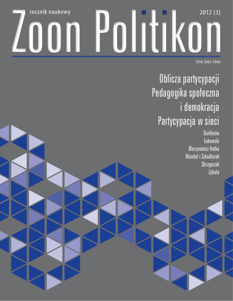 rocznik naukowy 2012 (3) ISSN 2082-7806 Oblicza partycypacji Pedagogika społeczna i demokracja Partycypacja w sieci Durkheim Łukowski Marynowicz-Hetka Mendel i Szkudlarek Skrzypczak Zybała rocznik naukowy Warszawa 2012 Rada Naukowa i Redakcyjna: Edmund Wnuk-Lipiński – Collegium Civitas i Instytut Studiów Politycznych PAN Ewa Nalewajko – Instytut Studiów Politycznych PAN i Collegium Civitas Wojciech Łukowski – Uniwersytet Warszawski Maria Mendel – Uniwersytet Gdański Andrzej Zybała – Collegium Civitas i Krajowa Szkoła Administracji Publicznej Bohdan Skrzypczak – Centrum Wspierania Aktywności Lokalnej CAL Katarzyna Iwińska – Collegium Civitas Redakcja: Rafał Krenz (sekretarz redakcji) – Centrum Wspierania Aktywności Lokalnej CAL Wojciech Łukowski – Uniwersytet Warszawski Barbara Markowska – Collegium Civitas Stanisław Mocek (redaktor naczelny) – Collegium Civitas i Instytut Studiów Politycznych PAN Marta Sałkowska – Collegium Civitas Anna Siwek – Instytut Studiów Politycznych PAN Szymon Wróbel – Instytut Filozofii i Socjologii PAN Adres redakcji: [email protected] Redaktor prowadzące numeru: Barbara Markowska, Maria Mendel Recenzja: prof. dr hab. Hanna Palska – Instytut Filozofii i Socjologii PAN, Collegium Civitas Redakcja językowa i korekta: Joanna Czarkowska, Małgorzata Izdebska-Młot, Katarzyna Lidia Bazga Wydawca: Centrum Wspierania Aktywności Lokalnej CAL Realizacja: Joanna Szeligowska, Fundacja „Fundusz Współpracy” Projekt graficzny: Pracownia C&C Skład i łamanie: Studio Graficzne Piotr Kurasiak Druk: Kreatywna Dolina, Trzebinia Nakład: 500 egz. Przekazując teksty do redakcji, autorzy przenoszą na wydawcę prawo do publikacji. Redakcja zastrzega sobie prawo skracania i adiustowania nadesłanych tekstów. Publikacja RECENZOWANA Publikacja BEZPŁATNA, dostępna w wersji elektronicznej na www.decydujmyrazem.pl Publikacja współfinansowana przez Unię Europejską w ramach Europejskiego Funduszu Społecznego Spis treści WPROWADZENIE..........................................................................................................................................................................................................................................7 BARBARA MARKOWSKA, MARIA MENDEL CZĘŚĆ I: OBLICZA PARTYCYPACJI [artykuły pod redakcją Barbary Markowskiej, Collegium Civitas] BOHDAN SKRZYPCZAK, Pedagogika publiczna – edukacyjne konteksty kreowania lokalnych polityk publicznych..............................................................................................................................................................................................................................13 WOJCIECH ŁUKOWSKI, Partycypacja, czyli o trudnościach w dzieleniu się władzą.........................................................................33 ANDRZEJ ZYBAŁA, Labirynty pojęciowe w świecie partycypacji......................................................................................................................53 ANNA RADIUKIEWICZ, O obywatelskości we współczesnym świecie – kierunki zmian i przestrzenie rozwoju......................................................................................................................................................................................................................67 MARCIN JEWDOKIMOW, Nowe koncepcje uczestnictwa w kulturze – od władzy symbolicznej do negocjacji i partycypacji.........................................................................................................................................................................................................83 JOANNA ERBEL, Czego nam jeszcze brakuje do pełnej partycypacji?........................................................................................................95 CZĘŚĆ II: PEDAGOGIKA SPOŁECZNA I DEMOKRACJA [artykuły pod redakcją Marii Mendel, Uniwersytet Gdański] EWA MARYNOWICZ-HETKA, Społeczny wymiar działania w polu praktyki socjalnej: istota i sens................................109 JACEK KOŁTAN, Solidaryzm, antypolityka i zanik zaufania. Rozwój i upadek solidarnościowego etosu................129 MONIKA POPOW, Partycypacja a nierówności społeczne. Problematyka partycypacji społecznej w świetle pedagogicznych aspektów teorii radykalnej demokracji...............................................................................................141 KAROLINA STAREGO, Sensus communis jako wspólnota równych. Teoretyczne podstawy animacji jako procesu demokratyzacji..................................................................................................................................................................................................163 MARCIN BORYCZKO, Krytyczna animacja społeczna. O roli teorii dla praktyki animacyjnej.............................................189 MARIA MENDEL, TOMASZ SZKUDLAREK, Demokratyczna izolacja. Krytyczna partycypacja obywatelska....................207 CZĘŚĆ III: PRZEKŁAD BARBARA MARKOWSKA, Edukacja i socjologia. Wprowadzenie.......................................................................................................................225 ÉMILE DURKHEIM, Edukacja i socjologia [1922]. Przekład: ANASTAZJA DWULIT.......................................................................................229 CZĘŚĆ IV: DEBATA PARTYCYPACJA W SIECI (SZYMON WRÓBEL, PAWEŁ DYBEL, MIROSŁAW FILICIAK, MACIEJ BUDZICH, JUSTYNA HOFMOKL) Moderator: EDWIN BENDYK.................................................................................................................................................................................................................255 CONTENTS INTRODUCTION......................................................................................................................................................................................................