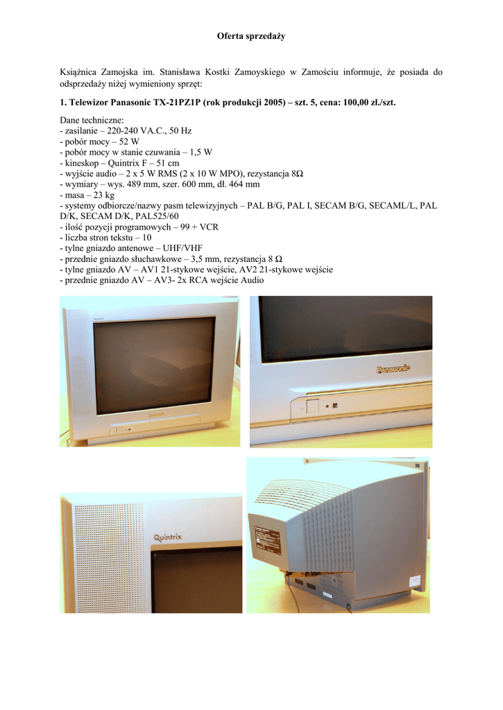Oferta sprzedaży Książnica Zamojska im. Stanisława Kostki Zamoyskiego w Zamościu informuje, że posiada do odsprzedaży niżej wymieniony sprzęt: 1. Telewizor Panasonic TX-21PZ1P (rok produkcji 2005) – szt. 5, cena: 100,00 zł./szt. Dane techniczne: - zasilanie – 220-240 VA.C., 50 Hz - pobór mocy – 52 W - pobór mocy w stanie czuwania – 1,5 W - kineskop – Quintrix F – 51 cm - wyjście audio – 2 x 5 W RMS (2 x 10 W MPO), rezystancja 8Ω - wymiary – wys. 489 mm, szer. 600 mm, dł. 464 mm - masa – 23 kg - systemy odbiorcze/nazwy pasm telewizyjnych – PAL B/G, PAL I, SECAM B/G, SECAML/L, PAL D/K, SECAM D/K, PAL525/60 - ilość pozycji programowych – 99 + VCR - liczba stron tekstu – 10 - tylne gniazdo antenowe – UHF/VHF - przednie gniazdo słuchawkowe – 3,5 mm, rezystancja 8 Ω - tylne gniazdo AV – AV1 21-stykowe wejście, AV2 21-stykowe wejście - przednie gniazdo AV – AV3- 2x RCA wejście Audio 2. Telewizor Panasonic TX-29PM11P/U (rok produkcji 2005) – szt. 3, cena: 150,00 zł./szt. Dane techniczne: - zasilanie – 220-240 VA.C., 50 Hz - pobór mocy – 87 W - pobór mocy w stanie czuwania – 09 W - kineskop – Quintrix F – 68 cm - wyjście audio – 2 x 10 W RMS (2 x 20 W MPO), rezystancja 8Ω - wymiary – wys. 584 mm, szer. 781 mm, dł. 491 mm - masa – 43 kg - systemy odbiorcze/nazwy pasm telewizyjnych – PAL B/G, PAL I, SECAM B/G, SECAML/L, PAL D/K, SECAM D/K, PAL525/60 - ilość pozycji programowych – 99 + VCR - liczba stron tekstu – 250 - tylne gniazdo antenowe – UHF/VHF - przednie gniazdo słuchawkowe – 3,5 mm, rezystancja 8 Ω - tylne gniazdo AV – AV1 21-stykowe wejście, AV2 21-stykowe wejście - przednie gniazdo AV – AV3- 2x RCA wejście Audio 3. Szafa katalogowa trzyczęściowa (rok produkcji 2005) – szt. 11, cena 250,00 zł./szt. Wymiary szafy: - wysokość – 156 cm - szerokość - 112 cm - głębokość – 53 cm Ilość szufladek – 50 Szafa posiada 2 wysuwane półki. W sprawach związanych z zakupem w/w sprzętu prosimy o kontakt z kierownikiem administracyjnym Książnicy Zamojskiej – tel. 607 101 930. Zamość dn. 1.07.2016 r.