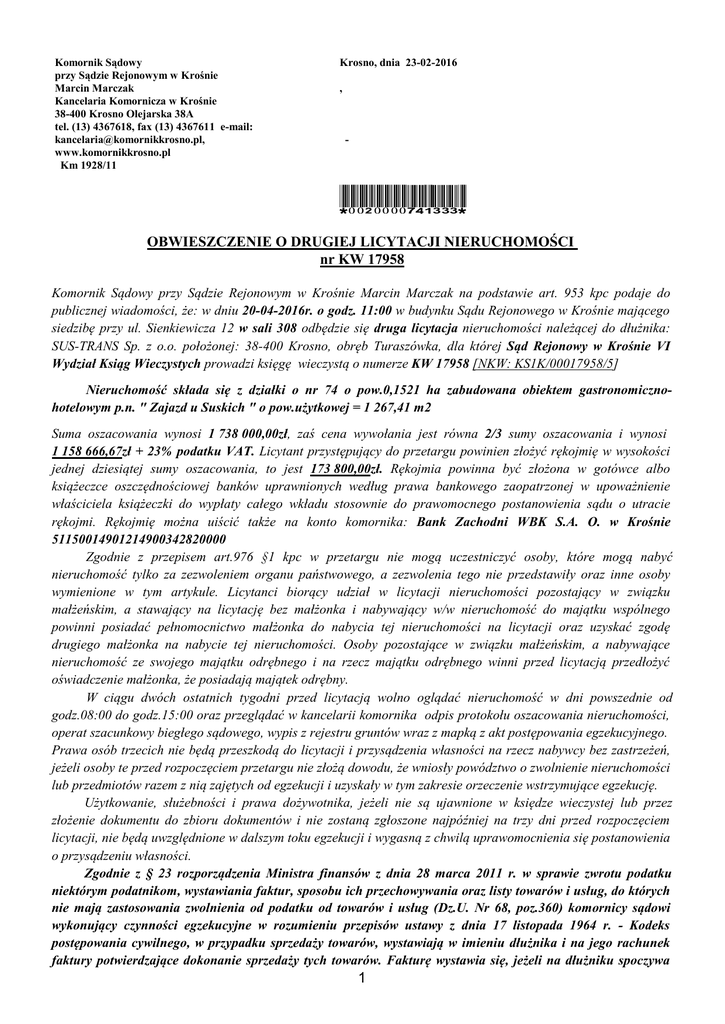 Komornik Sądowy przy Sądzie Rejonowym w Krośnie Marcin Marczak Kancelaria Komornicza w Krośnie 38-400 Krosno Olejarska 38A tel. (13) 4367618, fax (13) 4367611 e-mail: [email protected], www.komornikkrosno.pl Km 1928/11 Krosno, dnia 23-02-2016 , - *0020000741333* OBWIESZCZENIE O DRUGIEJ LICYTACJI NIERUCHOMOŚCI nr KW 17958 Komornik Sądowy przy Sądzie Rejonowym w Krośnie Marcin Marczak na podstawie art. 953 kpc podaje do publicznej wiadomości, że: w dniu 20-04-2016r. o godz. 11:00 w budynku Sądu Rejonowego w Krośnie mającego siedzibę przy ul. Sienkiewicza 12 w sali 308 odbędzie się druga licytacja nieruchomości należącej do dłużnika: SUS-TRANS Sp. z o.o. położonej: 38-400 Krosno, obręb Turaszówka, dla której Sąd Rejonowy w Krośnie VI Wydział Ksiąg Wieczystych prowadzi księgę wieczystą o numerze KW 17958 [NKW: KS1K/00017958/5] Nieruchomość składa się z działki o nr 74 o pow.0,1521 ha zabudowana obiektem gastronomicznohotelowym p.n. " Zajazd u Suskich " o pow.użytkowej = 1 267,41 m2 Suma oszacowania wynosi 1 738 000,00zł, zaś cena wywołania jest równa 2/3 sumy oszacowania i wynosi 1 158 666,67zł + 23% podatku VAT. Licytant przystępujący do przetargu powinien złożyć rękojmię w wysokości jednej dziesiątej sumy oszacowania, to jest 173 800,00zł. Rękojmia powinna być złożona w gotówce albo książeczce oszczędnościowej banków uprawnionych według prawa bankowego zaopatrzonej w upoważnienie właściciela książeczki do wypłaty całego wkładu stosownie do prawomocnego postanowienia sądu o utracie rękojmi. Rękojmię można uiścić także na konto komornika: Bank Zachodni WBK S.A. O. w Krośnie 51150014901214900342820000 Zgodnie z przepisem art.976 §1 kpc w przetargu nie mogą uczestniczyć osoby, które mogą nabyć nieruchomość tylko za zezwoleniem organu państwowego, a zezwolenia tego nie przedstawiły oraz inne osoby wymienione w tym artykule. Licytanci biorący udział w licytacji nieruchomości pozostający w związku małżeńskim, a stawający na licytację bez małżonka i nabywający w/w nieruchomość do majątku wspólnego powinni posiadać pełnomocnictwo małżonka do nabycia tej nieruchomości na licytacji oraz uzyskać zgodę drugiego małżonka na nabycie tej nieruchomości. Osoby pozostające w związku małżeńskim, a nabywające nieruchomość ze swojego majątku odrębnego i na rzecz majątku odrębnego winni przed licytacją przedłożyć oświadczenie małżonka, że posiadają majątek odrębny. W ciągu dwóch ostatnich tygodni przed licytacją wolno oglądać nieruchomość w dni powszednie od godz.08:00 do godz.15:00 oraz przeglądać w kancelarii komornika odpis protokołu oszacowania nieruchomości, operat szacunkowy biegłego sądowego, wypis z rejestru gruntów wraz z mapką z akt postępowania egzekucyjnego. Prawa osób trzecich nie będą przeszkodą do licytacji i przysądzenia własności na rzecz nabywcy bez zastrzeżeń, jeżeli osoby te przed rozpoczęciem przetargu nie złożą dowodu, że wniosły powództwo o zwolnienie nieruchomości lub przedmiotów razem z nią zajętych od egzekucji i uzyskały w tym zakresie orzeczenie wstrzymujące egzekucję. Użytkowanie, służebności i prawa dożywotnika, jeżeli nie są ujawnione w księdze wieczystej lub przez złożenie dokumentu do zbioru dokumentów i nie zostaną zgłoszone najpóźniej na trzy dni przed rozpoczęciem licytacji, nie będą uwzględnione w dalszym toku egzekucji i wygasną z chwilą uprawomocnienia się postanowienia o przysądzeniu własności. Zgodnie z § 23 rozporządzenia Ministra finansów z dnia 28 marca 2011 r. w sprawie zwrotu podatku niektórym podatnikom, wystawiania faktur, sposobu ich przechowywania oraz listy towarów i usług, do których nie mają zastosowania zwolnienia od podatku od towarów i usług (Dz.U. Nr 68, poz.360) komornicy sądowi wykonujący czynności egzekucyjne w rozumieniu przepisów ustawy z dnia 17 listopada 1964 r. - Kodeks postępowania cywilnego, w przypadku sprzedaży towarów, wystawiają w imieniu dłużnika i na jego rachunek faktury potwierdzające dokonanie sprzedaży tych towarów. Fakturę wystawia się, jeżeli na dłużniku spoczywa 1 obowiązek podatkowy związany ze sprzedażą towarów Asesor Komorniczy Andrzej Dębski Komornik Sądowy Marcin Marczak 2