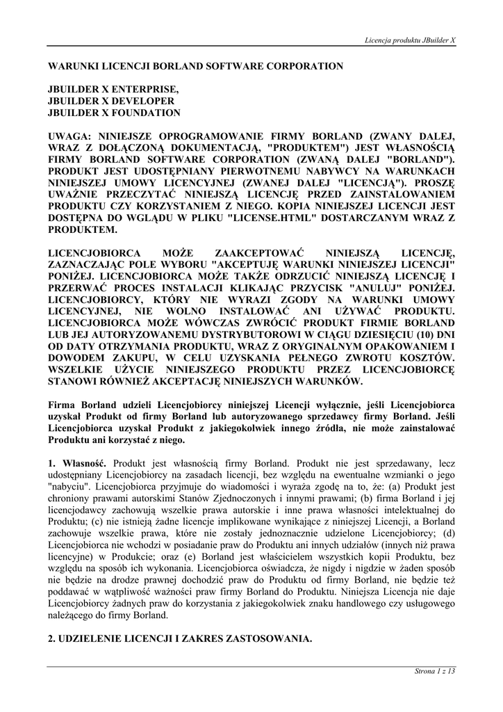1. Własność. Produkt jest własnością firmy Borland. Produkt nie jest sprzedawany, lecz