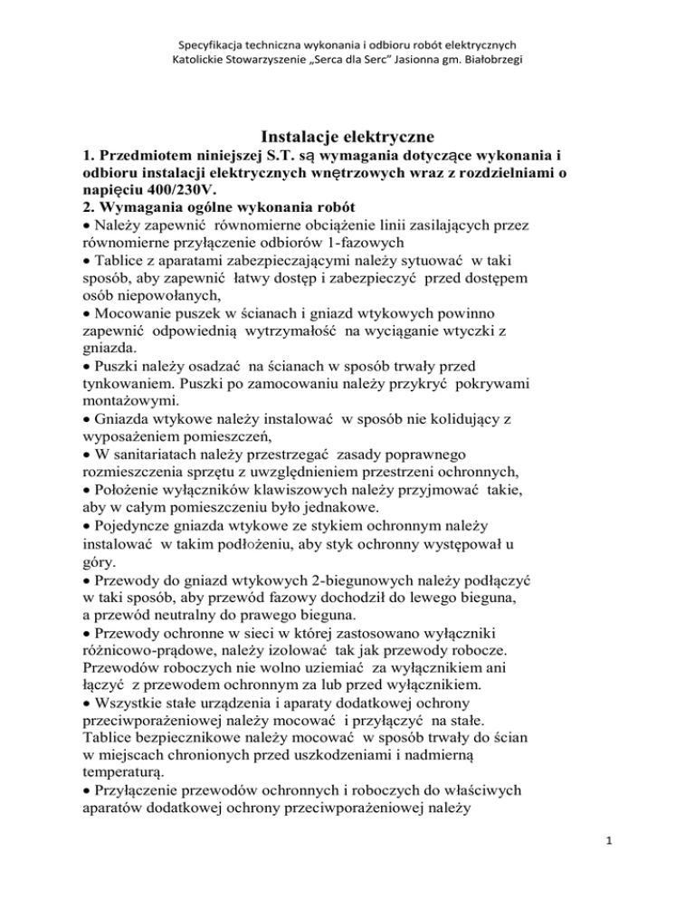 Specyfikacja techniczna wykonania i odbioru robót elektrycznych Katolickie Stowarzyszenie „Serca dla Serc” Jasionna gm. Białobrzegi Instalacje elektryczne 1. Przedmiotem niniejszej S.T. są wymagania dotyczące wykonania i odbioru instalacji elektrycznych wnętrzowych wraz z rozdzielniami o napięciu 400/230V. 2. Wymagania ogólne wykonania robót Należy zapewnić równomierne obciążenie linii zasilających przez równomierne przyłączenie odbiorów 1-fazowych Tablice z aparatami zabezpieczającymi należy sytuować w taki sposób, aby zapewnić łatwy dostęp i zabezpieczyć przed dostępem osób niepowołanych, Mocowanie puszek w ścianach i gniazd wtykowych powinno zapewnić odpowiednią wytrzymałość na wyciąganie wtyczki z gniazda. Puszki należy osadzać na ścianach w sposób trwały przed tynkowaniem. Puszki po zamocowaniu należy przykryć pokrywami montażowymi. Gniazda wtykowe należy instalować w sposób nie kolidujący z wyposażeniem pomieszczeń, W sanitariatach należy przestrzegać zasady poprawnego rozmieszczenia sprzętu z uwzględnieniem przestrzeni ochronnych, Położenie wyłączników klawiszowych należy przyjmować takie, aby w całym pomieszczeniu było jednakowe. Pojedyncze gniazda wtykowe ze stykiem ochronnym należy instalować w takim podłożeniu, aby styk ochronny występował u góry. Przewody do gniazd wtykowych 2-biegunowych należy podłączyć w taki sposób, aby przewód fazowy dochodził do lewego bieguna, a przewód neutralny do prawego bieguna. Przewody ochronne w sieci w której zastosowano wyłączniki różnicowo-prądowe, należy izolować tak jak przewody robocze. Przewodów roboczych nie wolno uziemiać za wyłącznikiem ani łączyć z przewodem ochronnym za lub przed wyłącznikiem. Wszystkie stałe urządzenia i aparaty dodatkowej ochrony przeciwporażeniowej należy mocować i przyłączyć na stałe. Tablice bezpiecznikowe należy mocować w sposób trwały do ścian w miejscach chronionych przed uszkodzeniami i nadmierną temperaturą. Przyłączenie przewodów ochronnych i roboczych do właściwych aparatów dodatkowej ochrony przeciwporażeniowej należy 1 Specyfikacja techniczna wykonania i odbioru robót elektrycznych Katolickie Stowarzyszenie „Serca dla Serc” Jasionna gm. Białobrzegi wykonać wyłącznie poprzez zaciski łączeniowe tych aparatów Trasowanie należy wykonać uwzględniając konstrukcję budynku oraz zapewniając bezkolizyjność z innymi instalacjami. Trasa instalacji powinna być przejrzysta, prosta i dostępna dla prawidłowej konserwacji i remontów. Trasy powinny przebiegać w liniach pionowych i poziomych. Instalację należy układać przed tynkowaniem, natomiast wna istniejących ścianach i stropach wykonać bruzdy pod układanie instalacji. Zabrania się kucia bruzd w cienkich ścianach działowych w sposób osłabiający ich konstrukcję. Zabrania się kucia bruzd, przebić i przepustów w betonowych elementach konstrukcyjno-budowlanych. Instalacje wtynkowe należy wykonywać przewodami wtynkowymi. Dopuszcza się stosowanie przewodów wielożyłowych płaskich. Przewody wprowadzone do puszek powinny mieć nadwyżkę długości niezbędną do wykonania połączeń. Zagięcia i łuki w płaszczyźnie przewodu powinny być łagodne. W tym celu należy przeciąć wzdłuż mostki pomiędzy żyłami przewodu nie uszkadzając izolacji. Przewody mocować do podłoża za pomocą klamerek. Dopuszcza się mocowanie za pomocą gwoździków wbijanych w mostek przewodu. Mocowanie klamerkami i gwoździkami należy wykonywać w odstępach ok. 50 cm. Zabrania się zaginania gwoździków na przewodzie. Do puszek należy wprowadzić tylko te przewody, które wymagają łączenia w puszce; pozostałe przewody należy prowadzić obok puszki. Przed tynkowaniem końce przewodów należy zwinąć w luźny krążek i włożyć do puszek, a puszki zakryć pokrywami lub w inny sposób zabezpieczyć przed zatynkowaniem. Zabrania się układania przewodów bezpośrednio w betonie, w warstwie wyrównawczej podłogi, w złączach płyt itp. Bez zastosowania osłon w postaci rur. Łączenia przewodów należy wykonywać w sprzęcie i osprzęcie instalacyjnym i w odbiornikach. Nie wolno stosować połączeń skręcanych. W przypadku stosowania zacisków do których przewody są przyłączone za pomocą oczek, pomiędzy oczkiem a nakrętką oraz pomiędzy oczkami powinny znajdować się podkładki metalowe, zabezpieczone przed korozją w sposób umożliwiający przepływ prądu. 2 Specyfikacja techniczna wykonania i odbioru robót elektrycznych Katolickie Stowarzyszenie „Serca dla Serc” Jasionna gm. Białobrzegi Końce przewodów miedzianych z żyłami wielodrutowymi powinny być zabezpieczone zaprasowanymi tulejkami lub ocynowane. 3. Odbiór robót Przed przystąpieniem do robót montażowych należy odebrać protokolarnie front robót od generalnego wykonawcy lub inwestora. Stan robót budowlanych i wykończeniowych powinien być taki, aby roboty elektromontażowe można było prowadzić bez narażenia instalacji na uszkodzenie, a pracowników na wypadki przy pracy. Roboty międzyoperacyjne powinien przeprowadzić inspektor nadzoru. Odbiorom międzyoperacyjnym powinny podlegać: _ ułożone rury przed wciągnięciem przewodów, _ zamocowane konstrukcje wsporcze i oprawy oświetleniowe, _ instalacja przed załączeniem pod napięcie Odbiorom robót ulegających zakryciu podlegają: _ instalacje podtynkowe przed tynkowaniem, _ inne fragmenty instalacji które będą niewidoczne lub trudne do sprawdzenia, Usterki stwierdzone przy odbiorze należy wpisać do dziennika budowy. Do odbioru końcowego wykonawca powinien przedstawić: _ aktualną dokumentację powykonawczą _ protokoły prób montażowych i pomiarów, _ oświadczenie wykonawcy o zakończeniu robót i gotowości instalacji do eksploatacji. Przy przekazaniu instalacji do eksploatacji należy spisać protokół potwierdzający usunięcie usterek. 3