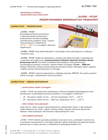 „ALFINE-PF330” Pomiary bezinwazyjne z rejestracją danych Sprawdzony w praktyce … wysoka jakość przy niskiej cenie! „ALFINE – PF330” PRZEPŁYWOMIERZ BEZINWAZYJNY PRZENOŚNY „ALFINE-PF330” – PRZEZNACZENIE „ALFINE – PF330” jest przepływomierzem przenośnym z rejestracją danych pomiarowych, przeznaczonym do bezinwazyjnego opomiarowania przepływu wody i czystych cieczy płynących o temperaturze o o -20 C … +135 C, w rurociągach całkowicie wypełnionych. ! „ALFINE – PF330” łączy doskonałą jakość i wyróżniające cechy metrologiczne z atrakcyjną i wyważoną ceną. „ALFINE – PF330” składa się standardowo z przetwornika elektronicznego z wyświetlaczem i przyciskami do konfiguracji, z zaawansowanymi funkcjami rejestracji i przekazu danych pomiarowych do PC oraz dwóch kompletów bezinwazyjnych sond pomiarowych, umożliwiających pomiary w szerokim zakresie średnic rurociągów: 13 mm … 2000 mm. Ważnym elementem zestawu pomiarowego jest specjalny osprzęt, ułatwiający szybki, wygodny i stabilny montaż sond pomiarowych na rurociągu. „ALFINE – PF330” może być doposażony w oddzielny przyrząd „PGR 05” do pomiaru grubości ścianki rurociągu, z wbudowanym wzorcem grubości. „ALFINE-PF330” – OBSZAR ZASTOSOWAŃ … szeroki zakres średnic rurociągów „ALFINE – PF330” jest dostarczany standardowo z dwoma kompletami bezinwazyjnych sond pomiarowych, umożliwiających pomiary przepływu w rurociągach o średnicach: o o „A” - dla zakresu średnic 13 mm … 115 mm, temperatura -20 C … +135 C o o „B” – dla zakresu średnic 50 mm … 2000 mm, temperatura -20 C … +135 C. … różne rodzaje cieczy płynących woda (zimna / ciepła / gorąca / demineralizowana / destylowana / pitna / z ujęć wodnych), media chłodnicze (np. woda + glikol), roztwory wodne, roztwory chemiczne, płynne leki, alkohole, media spożywcze, soki owocowe, oleje hydrauliczne i inne … Rev. 130419 … różne gałęzie przemysłu „ALFINE – PF330” idealnie sprawdza się działach utrzymania ruchu, automatyki i kontroli oraz w pomiarach wykonywanych w warunkach polowych, gdzie oczekiwana jest rejestracja danych pomiarowych w miejscu pomiaru z możliwością ich późniejszej obróbki w PC. „ALFINE-TIM” ul. Poznańska 30-32 62-080 Tarnowo Podgórne tel. 61 8966945 fax: 61 8164383 [email protected] www.alfine.pl 1/7 „ALFINE-PF330” Pomiary bezinwazyjne z rejestracją danych Rev. 130419 „ALFINE-PF330” – WYBRANE PARAMETRY TECHNICZNE Zasada działania Transit Time Prędkość przepływu cieczy płynącej jest wyznaczana na podstawie pomiaru różnicy prędkości rozchodzenia się fali ultradźwiękowej w kierunku zgodnym i przeciwnym do kierunku przepływu. Przepływ objętościowy jest wyznaczany na podstawie prędkości przepływu oraz średnicy wewnętrznej rurociągu. Ciecz płynąca Woda i ciecze czyste (w tym mieszaniny wody z glikolem, oleje hydrauliczne, diesel) zawierające nie więcej niż 3% cząstek stałych. Sondy pomiarowe Bezinwazyjne, montowane na powierzchni rurociągu, bez kontaktu z cieczą płynącą, bez zatrzymywania procesu, bez zakłócania przepływu, bez względu na ciśnienie w rurociągu, bez przecinania lub nawiercania rurociągu, bez części ruchomych, bez spadku ciśnienia, pomiar w rurociągach o dowolnym nachyleniu. Średnice rurociągów Przepływomierz „ALFINE-PF330” jest dostarczany z dwiema parami sond: Sondy pomiarowe typu „A” Sondy pomiarowe typu „B” 13 mm … 115 mm 50 mm … 2000 mm Opcja: Sondy pomiarowe typu „D” 1000 mm … 5000 mm Tryb pracy sond Reflex V; Double Reflex VV; Triple Reflex VVV; Diagonal \ Tryb pracy sond pomiarowych oraz ich wzajemna odległość podawane są w postaci czytelnego komunikatu wyświetlanego automatycznie, po zaprogramowaniu warunków w miejscu pomiaru. Materiały rurociągów Wybierane z menu: stal / stal nierdzewna / miedź / UPVC / PVDF stal miękka / blacha ocynkowana / żeliwo / szkło / mosiądz Grubość ścianki rurociągu: 1 mm … 75 mm Temperatura rurociągu -20 C … +135 C (sondy pomiarowe „A” oraz „B” o o -20 C … +80 C (sondy pomiarowe „D” (opcja) Kable Kable sygnałowe (2 szt.) są zakończone miniaturowymi wtyczkami koncentrycznymi Lemo. Kable są rozróżnione kolorami: czerwony dla sondy na napływie, niebieski dla sondy na wypływie. Kabel 4 – 20 mA + Pulse Output (1 szt.) Kabel USB (1 szt.) Kabel RS232-C (1 szt.) Długość każdego kabla wynosi 2 m. o o „ALFINE-TIM” ul. Poznańska 30-32 62-080 Tarnowo Podgórne tel. 61 8966945 fax: 61 8164383 [email protected] www.alfine.pl 2/7 „ALFINE-PF330” Pomiary bezinwazyjne z rejestracją danych „ALFINE-PF330” – WYBRANE PARAMETRY TECHNICZNE (CD) Montaż sond Montaż sond pomiarowych na rurociągu jest łatwy i wygodny. W zestawie dostarczany jest osprzęt do montażu sond pomiarowych: statywy + prowadnica + łańcuszki stalowe. Zalecane odcinki proste: 20 x DN na napływie, 10 x DN na wypływie (DN = średnica rurociągu). Odstęp pomiędzy sondami jest podawany na wyświetlaczu. Przetwornik elektroniczny Przenośny, lekki i poręczny. Obudowa IP 54 / ABS / niepalna / 264 x 168 x 50 mm, 1.1 kg Ekspozycja wyników pomiarów Czytelny wyświetlacz graficzny o rozdzielczości 64 x 240 pixeli, z podświetlaniem, wymiary wyświetlacza: 127 mm x 34 mm. Wyświetlane wielkości Przepływ chwilowy / prędkość przepływu / jakość sygnału sumator przepływu w przód / sumator przepływu w tył (po 12 miejsc) data / godzina / stan naładowania akumulatorków / błędy / alarmy. Jednostki inżynierskie są wybierane z menu. Zakres pomiarowy 0.1 m/s … 20 m/s Pomiar przepływu w obu kierunkach (w przód / w tył). ! Dokładność pomiaru (w warunkach referencyjnych) ( str. 5) W badaniach testowych na stanowisku firmy „ALFINE-TIM” mierzono przy prędkości przepływu 2 mm/s. Właściwość ta jest przydatna przy detekcji wycieków i nieszczelności.