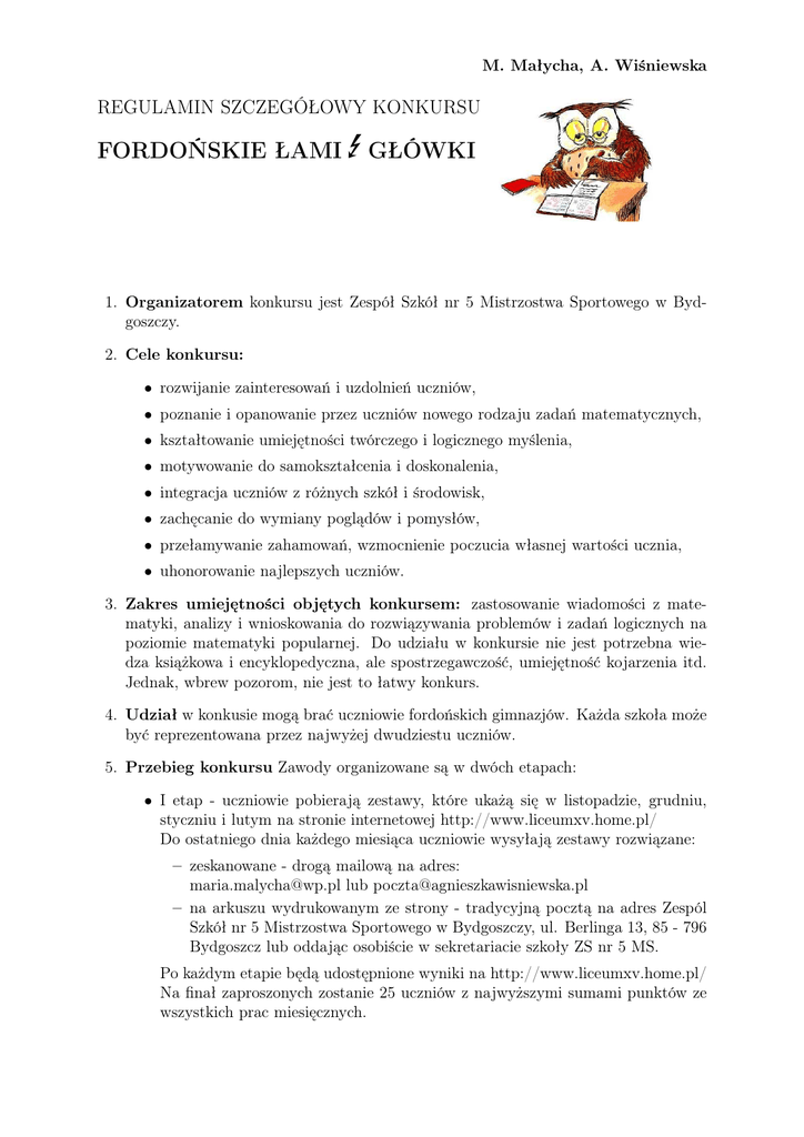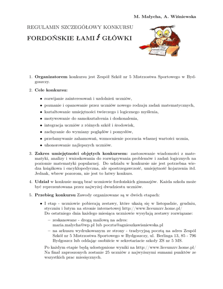 M. Małycha, A. Wiśniewska REGULAMIN SZCZEGÓŁOWY KONKURSU FORDOŃSKIE ŁAMI E GŁÓWKI 1. Organizatorem konkursu jest Zespół Szkół nr 5 Mistrzostwa Sportowego w Bydgoszczy. 2. Cele konkursu: • rozwijanie zainteresowań i uzdolnień uczniów, • poznanie i opanowanie przez uczniów nowego rodzaju zadań matematycznych, • kształtowanie umiejętności twórczego i logicznego myślenia, • motywowanie do samokształcenia i doskonalenia, • integracja uczniów z różnych szkół i środowisk, • zachęcanie do wymiany poglądów i pomysłów, • przełamywanie zahamowań, wzmocnienie poczucia własnej wartości ucznia, • uhonorowanie najlepszych uczniów. 3. Zakres umiejętności objętych konkursem: zastosowanie wiadomości z matematyki, analizy i wnioskowania do rozwiązywania problemów i zadań logicznych na poziomie matematyki popularnej. Do udziału w konkursie nie jest potrzebna wiedza książkowa i encyklopedyczna, ale spostrzegawczość, umiejętność kojarzenia itd. Jednak, wbrew pozorom, nie jest to łatwy konkurs. 4. Udział w konkusie mogą brać uczniowie fordońskich gimnazjów. Każda szkoła może być reprezentowana przez najwyżej dwudziestu uczniów. 5. Przebieg konkursu Zawody organizowane są w dwóch etapach: • I etap - uczniowie pobierają zestawy, które ukażą się w listopadzie, grudniu, styczniu i lutym na stronie internetowej http://www.liceumxv.home.pl/ Do ostatniego dnia każdego miesiąca uczniowie wysyłają zestawy rozwiązane: – zeskanowane - drogą mailową na adres: [email protected] lub [email protected] – na arkuszu wydrukowanym ze strony - tradycyjną pocztą na adres Zespól Szkół nr 5 Mistrzostwa Sportowego w Bydgoszczy, ul. Berlinga 13, 85 - 796 Bydgoszcz lub oddając osobiście w sekretariacie szkoły ZS nr 5 MS. Po każdym etapie będą udostępnione wyniki na http://www.liceumxv.home.pl/ Na finał zaproszonych zostanie 25 uczniów z najwyższymi sumami punktów ze wszystkich prac miesięcznych. M. Małycha, A. Wiśniewska • II etap - finał - zakwalifikowani uczestnicy rozwiązują zestaw zadań w czasie dwóch godzin. W sprawdzaniu prac biorą udział nauczyciele, którzy przyszli z uczniami. Finał odbędzie się w marcu 2011 roku w Zespole Szkół nr 5 Mistrzostwa Sportowego. Dokładny termin zostanie podany na stronie internetowej http://www.liceumxv.home.pl na dwa tygodnie przed finałem. 6. Zgłoszeniem udziału będzie nadesłanie rozwiązań, w listopadzie według opisanego wyżej sposobu, z dołączoną informacją zawierającą pełną nazwę szkoły, e-mail szkoły, numer telefonu do szkoły, imię i nazwisko nauczyciela opiekującego się uczniem, email lub numer telefonu nauczyciela. Na końcu należy dopisać Wyrażam zgodę na przetwarzanie moich danych osobowych przez organizatorów Konkursu Fordońskie Łamigłówki w trakcie trwania i tuż po jego zakończeniu. 7. Skład komisji konkursowej: • Agnieszka Wiśniewska (ZS nr 5 MS) • Maria Małycha (ZS nr 5 MS) • nauczyciele z zaproszonych szkół 8. Przygotowując konkursowe zestawy wykorzystano: • A. D. Bragdon, L. Fellows „Gimnastyka dla mózgu” • J. Cameron „Twoje IQ 506 zagadek matematycznych, wizualnych, logicznych” • J. Cameron „500 łamigłówek, zagadek logicznych i testów IQ” • P. Carter, K. Russell „Łamigłówki rysunkowe” • P. Carter, K. Russell „Łamigłówki liczbowe” • H. J. Eysenck „Sprawdź swoją inteligencję” • S. Griffiths Jones „Sudoku. 101 łamigłówek” • M. Penszko „Łamigłówki - podróże w krainę matematyki rekreacyjnej” • H. Tao „Sudoku MIX 110 Sudoku o różnym stopniu trudności”