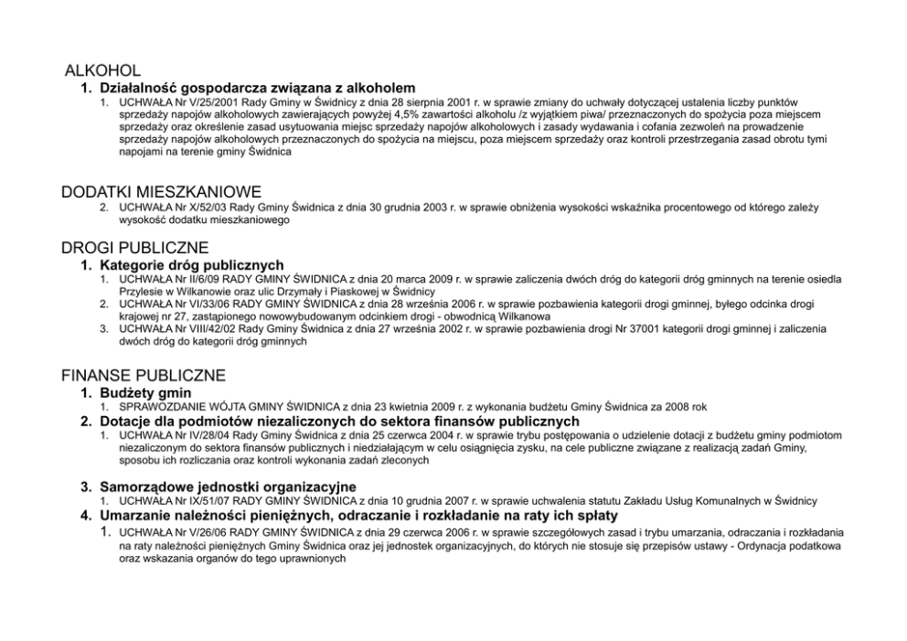 ALKOHOL 1. Działalność gospodarcza związana z alkoholem 1. UCHWAŁA Nr V/25/2001 Rady Gminy w Świdnicy z dnia 28 sierpnia 2001 r. w sprawie zmiany do uchwały dotyczącej ustalenia liczby punktów sprzedaży napojów alkoholowych zawierających powyżej 4,5% zawartości alkoholu /z wyjątkiem piwa/ przeznaczonych do spożycia poza miejscem sprzedaży oraz określenie zasad usytuowania miejsc sprzedaży napojów alkoholowych i zasady wydawania i cofania zezwoleń na prowadzenie sprzedaży napojów alkoholowych przeznaczonych do spożycia na miejscu, poza miejscem sprzedaży oraz kontroli przestrzegania zasad obrotu tymi napojami na terenie gminy Świdnica DODATKI MIESZKANIOWE 2. UCHWAŁA Nr X/52/03 Rady Gminy Świdnica z dnia 30 grudnia 2003 r. w sprawie obniżenia wysokości wskaźnika procentowego od którego zależy wysokość dodatku mieszkaniowego DROGI PUBLICZNE 1. Kategorie dróg publicznych 1. UCHWAŁA Nr II/6/09 RADY GMINY ŚWIDNICA z dnia 20 marca 2009 r. w sprawie zaliczenia dwóch dróg do kategorii dróg gminnych na terenie osiedla Przylesie w Wilkanowie oraz ulic Drzymały i Piaskowej w Świdnicy 2. UCHWAŁA Nr VI/33/06 RADY GMINY ŚWIDNICA z dnia 28 września 2006 r. w sprawie pozbawienia kategorii drogi gminnej, byłego odcinka drogi krajowej nr 27, zastąpionego nowowybudowanym odcinkiem drogi - obwodnicą Wilkanowa 3. UCHWAŁA Nr VIII/42/02 Rady Gminy Świdnica z dnia 27 września 2002 r. w sprawie pozbawienia drogi Nr 37001 kategorii drogi gminnej i zaliczenia dwóch dróg do kategorii dróg gminnych FINANSE PUBLICZNE 1. Budżety gmin 1. SPRAWOZDANIE WÓJTA GMINY ŚWIDNICA z dnia 23 kwietnia 2009 r. z wykonania budżetu Gminy Świdnica za 2008 rok 2. Dotacje dla podmiotów niezaliczonych do sektora finansów publicznych 1. UCHWAŁA Nr IV/28/04 Rady Gminy Świdnica z dnia 25 czerwca 2004 r. w sprawie trybu postępowania o udzielenie dotacji z budżetu gminy podmiotom niezaliczonym do sektora finansów publicznych i niedziałającym w celu osiągnięcia zysku, na cele publiczne związane z realizacją zadań Gminy, sposobu ich rozliczania oraz kontroli wykonania zadań zleconych 3. Samorządowe jednostki organizacyjne 1. UCHWAŁA Nr IX/51/07 RADY GMINY ŚWIDNICA z dnia 10 grudnia 2007 r. w sprawie uchwalenia statutu Zakładu Usług Komunalnych w Świdnicy 4. Umarzanie należności pieniężnych, odraczanie i rozkładanie na raty ich spłaty 1. UCHWAŁA Nr V/26/06 RADY GMINY ŚWIDNICA z dnia 29 czerwca 2006 r. w sprawie szczegółowych zasad i trybu umarzania, odraczania i rozkładania na raty należności pieniężnych Gminy Świdnica oraz jej jednostek organizacyjnych, do których nie stosuje się przepisów ustawy - Ordynacja podatkowa oraz wskazania organów do tego uprawnionych KANALIZACJA 1. Regulaminy dostarczania wody i odprowadzania ścieków UCHWAŁA Nr X/58/07 RADY GMINY ŚWIDNICA z dnia 28 grudnia 2007 r. w sprawie regulaminu dostarczania wody i odprowadzania ścieków 2. Pozostałe zagadnienia POROZUMIENIE MIĘDZYGMINNE z dnia 25 maja 2004 r. pomiędzy Miastem Zielona Góra, Gminą Zielona Góra a Gminą Świdnica w sprawie uporządkowania gospodarki wodno-ściekowej Miasta Zielona Góra oraz Gmin Zielona Góra i Świdnica. KULTURA I SZTUKA 3. Pozostałe zagadnienia UCHWAŁA Nr V/31/03 Rady Gminy Świdnica z dnia 10 września 2003 r. w sprawie ustanowienia i zasad przyznawania Nagrody Kulturalnej Gminy Świdnica NAUCZYCIELE UCHWAŁA Nr VI/45/09 RADY GMINY ŚWIDNICA z dnia 24 czerwca 2009 r. w sprawie tworzenia specjalnego funduszu nagród oraz zasad przyznawania nagród dla nauczycieli za ich osiągnięcia dydaktyczno - wychowawcze w szkołach i placówkach oświatowych prowadzonych przez Gminę Świdnica UCHWAŁA Nr VI/44/09 RADY GMINY ŚWIDNICA z dnia 24 czerwca 2009 r. w sprawie regulaminu przyznawania dodatków do wynagrodzeń nauczycieli zatrudnionych w szkołach i placówkach oświatowych prowadzonych przez Gminę Świdnica NAZWY ULIC, PLACÓW PUBLICZNYCH I MIEJSCOWOŚCI UCHWAŁA Nr VIII/58/08 RADY GMINY ŚWIDNICA z dnia 23 grudnia 2008 r. w sprawie nadania nazwy ulicy w miejscowości Radomia, Gmina Świdnica UCHWAŁA Nr VII/31/07 RADY GMINY ŚWIDNICA z dnia 18 lipca 2007 r. w sprawie nadania nazwy ulicy w miejscowości Radomia, Gmina Świdnica UCHWAŁA Nr VII/30/07 RADY GMINY ŚWIDNICA z dnia 18 lipca 2007 r. w sprawie nadania nazwy ulicy w miejscowości Świdnica, Gmina Świdnica UCHWAŁA Nr II/5/07 RADY GMINY ŚWIDNICA z dnia 2 marca 2007 r. w sprawie nadania nazw ulicom w miejscowości Słone gmina Świdnica UCHWAŁA Nr VI/30/06 RADY GMINY ŚWIDNICA z dnia 28 września 2006 r. w sprawie nadania nazwy ulicy w miejscowości Świdnica gmina Świdnica UCHWAŁA NR VIII/33/05 RADY GMINY ŚWIDNICA z dnia 23 września 2005r. w sprawie nadania nazw nowo powstałym ulicom w miejscowości Świdnica Gmina Świdnica UCHWAŁA Nr IV/25/03 Rady Gminy Świdnica z dnia 27 czerwca 2003 r. w sprawie nadania nazw nowo powstałym ulicom na terenie wsi Świdnica Gmina Świdnica OCHRONA PRZYRODY 2. Ochrona w drodze uznania 1) Pomniki przyrody UCHWAŁA Nr VII/38/06 RADY GMINY ŚWIDNICA z dnia 26 października 2006 r. w sprawie ustanowienia pomników przyrody na terenie Gminy Świdnica OPŁATY 1. Opłata adiacencka UCHWAŁA Nr IX/48/07 RADY GMINY ŚWIDNICA z dnia 10 grudnia 2007 r. w sprawie ustalenia stawki procentowej opłaty adiacenckiej 2. Opłaty drogowe UCHWAŁA Nr XI/78/09 RADY GMINY ŚWIDNICA z dnia 30 grudnia 2009 r. w sprawie wysokości stawek opłat za zajęcie pasa drogowego oraz umieszczanie w nim urządzeń infrastruktury technicznej, obiektów budowlanych nie związanych z potrzebami zarządzania drogami lub potrzebami ruchu drogowego oraz reklam. 3. Opłata targowa UCHWAŁA Nr II/4/09 RADY GMINY ŚWIDNICA z dnia 20 marca 2009 r. w sprawie zarządzenia poboru podatku rolnego, leśnego, podatku od nieruchomości oraz opłaty targowej w drodze inkasa, wyznaczenia inkasentów oraz określenia wysokości wynagrodzenia za inkaso Uchwała Nr IX/44/2003 Rady Gmin