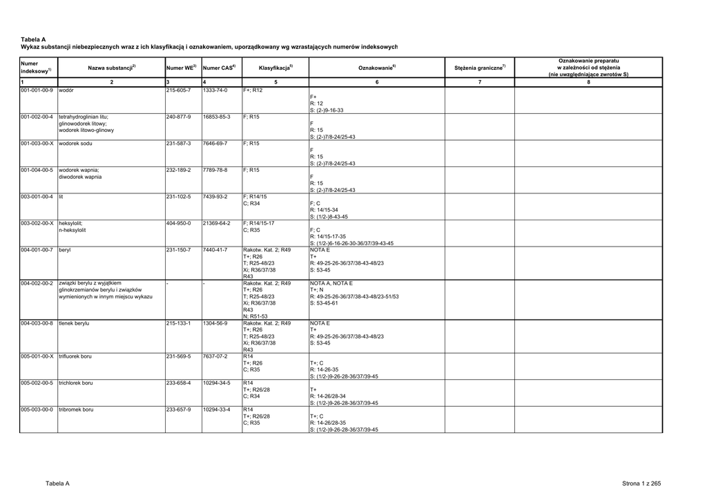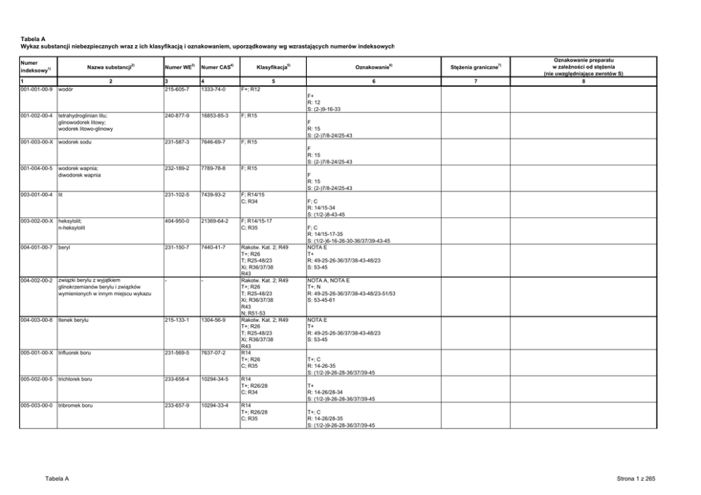 Wykaz substancji niebezpiecznych wraz z ich klasyfikacją i oznakowaniem, uporządkowany wg wzrastających numerów indeksowych