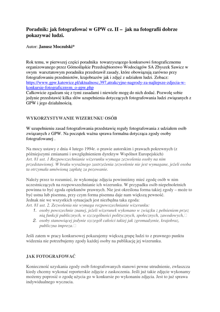 Poradnik: jak fotografować w GPW cz. II – jak na fotografii dobrze pokazywać ludzi. Autor: Janusz Moczulski* Rok temu, w pierwszej części poradnika towarzyszącego konkursowi fotograficznemu organizowanego przez Górnośląskie Przedsiębiorstwo Wodociągów SA Zbyszek Sawicz w swym warsztatowym poradniku przedstawił zasady, które obowiązują zarówno przy fotografowaniu przedmiotów, krajobrazów jak i zdjęć z udziałem ludzi. Zobacz: https://www.gpw.katowice.pl/aktualnosc,397,atrakcyjne-nagrody-za-najlepsze-zdjecia-wkonkursie-fotograficznym_o-gpw.php Całkowicie zgadzam się z tymi zasadami i niewiele mogę do nich dodać. Pozwolę sobie jedynie przedstawić kilka słów uzupełnienia dotyczących fotografowania ludzi związanych z GPW i jego działalnością. WYKORZYSTYWANIE WIZERUNKU OSÓB W uzupełnieniu zasad fotografowania przedstawię reguły fotografowania z udziałem osób związanych z GPW. Na początek ważna sprawa formalna dotycząca zgody osoby fotografowanej . Na mocy ustawy z dnia 4 lutego 1994r. o prawie autorskim i prawach pokrewnych (z późniejszymi zmianami i uwzględnieniem dyrektyw Wspólnot Europejskich) Art. 81 ust. 1 Rozpowszechnianie wizerunku wymaga zezwolenia osoby na nim przedstawionej. W braku wyraźnego zastrzeżenia zezwolenie nie jest wymagane, jeżeli osoba ta otrzymała umówioną zapłatę za pozowanie. Należy przez to rozumieć, że wykonując zdjęcia powinniśmy mieć zgodę osób w nim uczestniczących na rozpowszechnianie ich wizerunku. W przypadku osób niepełnoletnich powinna to być zgoda opiekunów prawnych. Nie jest określona forma takiej zgody – może to być ustna lub pisemna, przy czym forma pisemna daje nam większą pewność. Jednak nie we wszystkich sytuacjach jest niezbędna taka zgoda: Art. 81 ust. 2. Zezwolenia nie wymaga rozpowszechnianie wizerunku: 1. osoby powszechnie znanej, jeżeli wizerunek wykonano w związku z pełnieniem przez nią funkcji publicznych, w szczególności politycznych, społecznych, zawodowych, 2. osoby stanowiącej jedynie szczegół całości takiej jak zgromadzenie, krajobraz, publiczna impreza. Jeśli zatem w pracy konkursowej pokazujemy większą grupę ludzi to z prawnego punktu widzenia nie potrzebujemy zgody każdej osoby na publikację jej wizerunku. JAK FOTOGRAFOWAĆ Konieczność uzyskania zgody osób fotografowanych stanowi pewne utrudnienie, zwłaszcza kiedy chcemy wykonać reporterskie zdjęcie z zaskoczenia. Jeśli już takie zdjęcie wykonamy możemy poprosić o zgodę użycia go w konkursie po wykonaniu zdjęcia. Jest to już sprawa indywidualnego wyczucia. USTAWIENIE OSOBY FOTOGRAFOWANEJ Fotografowanie ludzi wbrew pozorom jest znacznie trudniejsze niż wszelkich planów stałych z przedmiotami, wodą i elementami przyrody. W naturalnych planach bez udziału człowieka fotografujemy istniejący stan. Nie wpływamy na jego wygląd. Do nas należy tylko znalezienie odpowiedniego kadru, wybranie światła, zastosowanie odpowiedniego obiektywu, wybranie najlepszej pozycji do wykonania zdjęcia. Natomiast fotografując ludzi, przeważnie wpływamy dodatkowo na ich wygląd. Musimy to robić świadomie. Twarze i sylwetki znajdują się w nieustannym ruchu w większym czy mniejszym wymiarze. Fotografując ludzi musimy wykonywać znacznie większą ilość zdjęć do późniejszego wyboru niż przy wykonywaniu zdjęć natury. Przeważnie najlepsze najbardziej naturalne zdjęcia są na początku i końcu sesji. Na początku osoba ta jeszcze bywa dość luźna, a na końcu po jakim czasie jest na tyle zmęczona, że znowu przyjmuje naturalny wygląd. Jeśli fotografowana osoba zdaje sobie sprawę, że jest fotografowana przyjmuje przeróżne gesty i wyrazy twarzy nie zawsze naturalne. Osoba w ruchu pozwala na uzyskanie lepszego efektu niż unieruchomiona w jakiejś pozycji. Nie należy tego ruchu ograniczać. Fotografując musimy często wpłynąć na osobę i jej zachowanie. Nie jest to łatwe. Najważniejsze jest znalezienie kontaktu z. Zanim zrobisz pierwsze zdjęcie nawiąż kontakt osobą którą chcesz fotografować. Nieodzowny jest tu uśmiech i zainteresowanie bezpośrednio osobą lub czymś co jest z nią związane.. Osoba fotografowana powierza fotografującemu swój wizerunek, jeśli nie ma do fotografa odrobiny zaufania będzie na planie sztywna, bez wyrazu. Natomiast jeśli ta osoba cię zaakceptuję, znacznie łatwiej będzie wykonać jej dobre zdjęcie. Dobrze jest przed wykonaniem zdjęcia poobserwować daną osobę bez zwracania na siebie jej uwagi, po to by potem kiedy wykonujemy zdjęcie poprosić ją o przyjęcie wcześniej zaobserwowanej postawy. Należy się starać, by uzyskać jak najbardziej naturalną pozycję i wyraz twarzy. Jeśli jest to niemożliwe, dobrze jest prowokować przyjęcie odpowiedniej postawy poprzez rozmowę o rzeczach przyjemnych dla wywołania uśmiechu czy zadawania pytań, by wywołać stan zamyślenia. Stosowanie bezpośrednich form, typu uśmiechnij się skutkuje przeważnie nienaturalnym uśmiechem. Ale jak sam się uśmiechniesz, wywołasz uśmiech. Można też osobę fotografowaną próbować rozwścieczyć, ale osobiście nie polecam… USTAWIENIE PLANU ZDJĘCIOWEGO Jak już doszliśmy do ustawienia danej postaci możemy też nieco wpłynąć na inne elementy obrazu. Sprawdzić, czy nie ma czegoś nienaturalnego we włosach czy ubiorze, usunąć z kadru rzeczy niepotrzebne jak krawędź krzesła czy stołu, widoczny śmieć czy jakiś przedmiot w nieodpowiednim miejscu. Należy zwrócić uwagę czy stan ubioru odpowiada naszym wcześniej przyjętym założeniom i efektowi jaki chcemy osiągnąć. Czy w tle nie pojawi się niezamierzony element, przykładowo jakiś kwiat czy pręt sprawiający na zdjęciu wrażenie, że wyrasta z głowy. Może trzeba otworzyć lub zamknąć jakieś drzwi czy okno. Fotografując osobę znajdującą się w kadrze dobrze jest zaobserwować też plan na krawędzi kadru i wszystkie rogi. Należy to robić 
