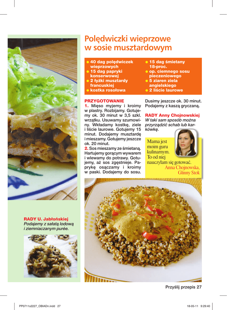Polędwiczki wieprzowe w sosie musztardowym 40 dag polędwiczek wieprzowych ● 15 dag papryki konserwowej ● 2 łyżki musztardy francuskiej ● kostka rosołowa ● PRZYGOTOWANIE 1. Mięso myjemy i kroimy w plastry. Rozbijamy. Gotujemy ok. 30 minut w 3,5 szkl. wrzątku. Usuwamy szumowiny. Wkładamy kostkę, ziele i liście laurowe. Gotujemy 15 minut. Dodajemy musztardę i mieszamy. Gotujemy jeszcze ok. 20 minut. 2. Sos mieszamy ze śmietaną. Hartujemy gorącym wywarem i wlewamy do potrawy. Gotujemy, aż sos zgęstnieje. Paprykę osączamy i kroimy w paski. Dodajemy do sosu. 15 dag śmietany 18-proc. ● op. ciemnego sosu pieczeniowego ● 5 ziaren ziela angielskiego ● 2 liście laurowe ● Dusimy jeszcze ok. 30 minut. Podajemy z kaszą gryczaną. RADY Anny Chojnowskiej W taki sam sposób można przyrządzić schab lub karkówkę. Mama jest moim guru kulinarnym. To od niej nauczyłam się gotować. Anna Chojnowska, Glinny Stok RADY U. Jabłońskiej Podajemy z sałatą lodową i ziemniaczanym purée. Przyślij przepis 27 PP0711s2227_OBIADn.indd 27 18-05-11 9:29:40