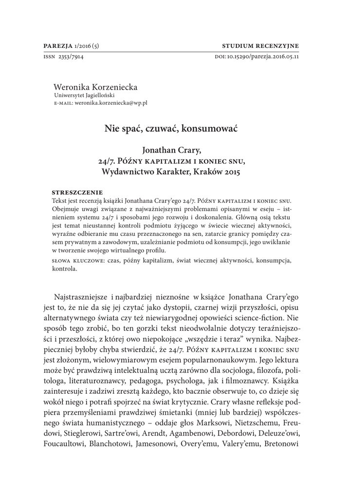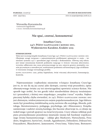 parezja · 1/2016(5) · studium recenzyjne · parezja 1/2016 (5) 143 studium recenzyjne issn 2353/7914 doi: 10.15290/parezja.2016.05.11 Weronika Korzeniecka Uniwersytet Jagielloński e-mail: [email protected] Nie spać, czuwać, konsumować Jonathan Crary, 24/7. Późny kapitalizm i koniec snu, Wydawnictwo Karakter, Kraków 2015 streszczenie Tekst jest recenzją książki Jonathana Crary’ego 24/7. Późny kapitalizm i koniec snu. Obejmuje uwagi związane z najważniejszymi problemami opisanymi w eseju – istnieniem systemu 24/7 i sposobami jego rozwoju i doskonalenia. Główną osią tekstu jest temat nieustannej kontroli podmiotu żyjącego w świecie wiecznej aktywności, wyraźne odbieranie mu czasu przeznaczonego na sen, zatarcie granicy pomiędzy czasem prywatnym a zawodowym, uzależnianie podmiotu od konsumpcji, jego uwikłanie w tworzenie swojego wirtualnego profilu. słowa kluczowe: czas, późny kapitalizm, świat wiecznej aktywności, konsumpcja, kontrola. Najstraszniejsze i najbardziej nieznośne w książce Jonathana Crary’ego jest to, że nie da się jej czytać jako dystopii, czarnej wizji przyszłości, opisu alternatywnego świata czy też niewiarygodnej opowieści science-fiction. Nie sposób tego zrobić, bo ten gorzki tekst nieodwołalnie dotyczy teraźniejszości i przeszłości, z której owo niepokojące „wszędzie i teraz” wynika. Najbezpieczniej byłoby chyba stwierdzić, że 24/7. Późny kapitalizm i koniec snu jest złożonym, wielowymiarowym esejem popularnonaukowym. Jego lektura może być prawdziwą intelektualną ucztą zarówno dla socjologa, filozofa, politologa, literaturoznawcy, pedagoga, psychologa, jak i filmoznawcy. Książka zainteresuje i zadziwi zresztą każdego, kto bacznie obserwuje to, co dzieje się wokół niego i potrafi spojrzeć na świat krytycznie. Crary własne refleksje podpiera przemyśleniami prawdziwej śmietanki (mniej lub bardziej) współczesnego świata humanistycznego – oddaje głos Marksowi, Nietzschemu, Freudowi, Stieglerowi, Sartre’owi, Arendt, Agambenowi, Debordowi, Deleuze’owi, Foucaultowi, Blanchotowi, Jamesonowi, Overy’emu, Valery’emu, Bretonowi 144 · w. korzeniecka · itd. Sporo? Owszem – sporo, a oprócz tego nawiązuje jeszcze do filmu (od Hitchcocka, poprzez Tarkowskiego, Godarda po Nolana) i opisuje przeprowadzane ostatnimi czasy badania naukowe. A jednak tekst jest spójny, nie rozpada się, nie rozmywa. Crary posłusznie krąży wokół jednego tematu, ogląda go z różnych stron, rozbija, rozkłada, ale ani przez chwilę nie błądzi. Mówi nam zarówno to, o czym wiemy od dawna i o czym sporo myśleliśmy, to, co wiemy, ale z czego nie zdawaliśmy sobie sprawy, i to, co nas szczerze zaskakuje, w co nie możemy uwierzyć, co przeraża. Powodem całego zamieszania jest rzeczywistość kapitalistyczna, system 24/7, od którego właściwie nie sposób się uwolnić i którego częścią jest w pewnym sensie każdy, czy tego chce, czy nie chce. Zawsze działaj. Czym jest 24/7? Rzeczywistość 24/7 wymaga nieustannej aktywności, funkcjonowania, trwania bez przerwy, działania w trybie maszyny, a więc produktywnego wykorzystywania dwudziestu czterech godzin przez siedem dni w tygodniu. Jest światem, w którym zaciera się granica pomiędzy czasem zawodowym a prywatnym, czyli tak zwanym życiem codziennym. Właściwie nie ma tu miejsca na pasywność, odpoczynek, czekanie, wszystkie „puste” chwile okazują się bezsensowne, ale także nieistotne, niewygodne i bezwartościowe, skoro nie można o nich myśleć w kategoriach wymiany, handlu, konsumpcji czy zysku. System 24/7 nie tylko domaga się nieprzerwanej czujności, ale także wiele oferuje, umożliwia działanie niecykliczne, wykraczające poza sztywne ramy dnia i nocy. Dziś przecież nie ma już takich momentów, w których nie można kupować, konsumować, eksploatować. Właśnie to jest tutaj najważniejsze i do zdobywania, posiadania, wymieniania, zużywania i wyrzucania, przekonuje świat kapitalistyczny. Bez przerwy. Bez wytchnienia. Świat 24/7 jest światem odczarowanym, pozbawionym cieni, niejasnych obszarów i zmiennych temporalności. To świat identyczny z samym sobą, świat o najpłytszej z możliwych przeszłości, a więc z zasady pozbawiony widm (Crary, 2015, s. 38). Jest jednolity i uproszczony, nie pozostawia żadnych niuansów czy odchyleń, stara się wszystko uniwersalizować i włączać w obręb własnego systemu, po czym sensownie wykorzystać. Przywodzi na myśl (choć akurat Crary o tym nie pisze) powstałą ponad dwadzieścia lat temu w Stanach Zjednoczonych, a szczególnie modną dzisiaj w Polsce „filozofię” coachingu, która kieruje się właśnie takim sposobem myślenia. Nic w tym dziwnego, ponieważ coaching jest bezpośrednią odpowiedzią na wymagania systemu kapitalistycznego parezja · 1/2016(5) · studium recenzyjne · 145 i wszystkiego, co się z nim wiąże, a więc konkurencji, aktywności, wytrzymałości, ciągłego braku zaspokojenia i wręcz obowiązku wyznaczania sobie nowych celów. Dlatego jego zwolennicy namawiają, aby nigdy nie rezygnować, zawsze działać i dążyć do ideału, który najczęściej oznacza bycie zdrowym, szczupłym, pięknym, silnym, bogatym i spełnionym. Recepta jest prosta, należy się tylko podporządkować, ulec ogólnym zasadom, wpleść swoją podmiotowość (jeśli jeszcze cokolwiek z niej zostanie) w pędzącą machinę i nie tracić motywacji ani siły, dokładnie jak w systemie 24/7. Crary zauważa, że wszystkie działania, które nie dają się wpisać w rzeczywistość ciągłej aktywności konsumpcyjnej, w takim świecie okazują się przede wszystkim nieopłacalne, są marnotrawstwem, które najlepiej byłoby jakkolwiek wykorzystać, a jeśli to niemożliwe – wyeliminować albo przynajmniej ograniczyć. Największym problemem rzeczywistości 24/7 jest sen. Obudź się i… kupuj! Sen wiąże się ze stratami, jest czasem pasywności, zawiesz