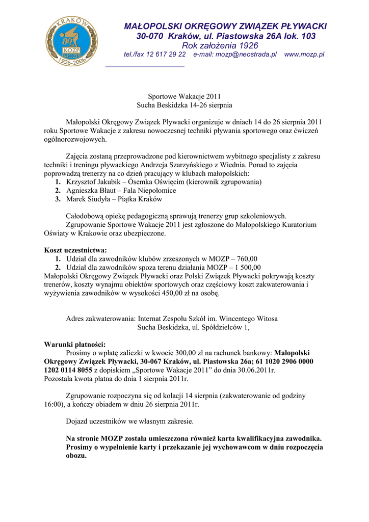KR 19 AKÓW KOZP MOZP 2 6- 20 0 1 MAŁOPOLSKI OKRĘGOWY ZWIĄZEK PŁYWACKI 30-070 Kraków, ul. Piastowska 26A lok. 103 Rok założenia 1926 tel./fax 12 617 29 22 e-mail: [email protected] www.mozp.pl Sportowe Wakacje 2011 Sucha Beskidzka 14-26 sierpnia Małopolski Okręgowy Związek Pływacki organizuje w dniach 14 do 26 sierpnia 2011 roku Sportowe Wakacje z zakresu nowoczesnej techniki pływania sportowego oraz ćwiczeń ogólnorozwojowych. Zajęcia zostaną przeprowadzone pod kierownictwem wybitnego specjalisty z zakresu techniki i treningu pływackiego Andrzeja Szarzyńskiego z Wiednia. Ponad to zajęcia poprowadzą trenerzy na co dzień pracujący w klubach małopolskich: 1. Krzysztof Jakubik – Ósemka Oświęcim (kierownik zgrupowania) 2. Agnieszka Błaut – Fala Niepołomice 3. Marek Siudyła – Piątka Kraków Całodobową opiekę pedagogiczną sprawują trenerzy grup szkoleniowych. Zgrupowanie Sportowe Wakacje 2011 jest zgłoszone do Małopolskiego Kuratorium Oświaty w Krakowie oraz ubezpieczone. Koszt uczestnictwa: 1. Udział dla zawodników klubów zrzeszonych w MOZP – 760,00 2. Udział dla zawodników spoza terenu działania MOZP – 1 500,00 Małopolski Okręgowy Związek Pływacki oraz Polski Związek Pływacki pokrywają koszty trenerów, koszty wynajmu obiektów sportowych oraz częściowy koszt zakwaterowania i wyżywienia zawodników w wysokości 450,00 zł na osobę. Adres zakwaterowania: Internat Zespołu Szkół im. Wincentego Witosa Sucha Beskidzka, ul. Spółdzielców 1, Warunki płatności: Prosimy o wpłatę zaliczki w kwocie 300,00 zł na rachunek bankowy: Małopolski Okręgowy Związek Pływacki, 30-067 Kraków, ul. Piastowska 26a; 61 1020 2906 0000 1202 0114 8055 z dopiskiem „Sportowe Wakacje 2011” do dnia 30.06.2011r. Pozostała kwota płatna do dnia 1 sierpnia 2011r. Zgrupowanie rozpoczyna się od kolacji 14 sierpnia (zakwaterowanie od godziny 16:00), a kończy obiadem w dniu 26 sierpnia 2011r. Dojazd uczestników we własnym zakresie. Na stronie MOZP została umieszczona również karta kwalifikacyjna zawodnika. Prosimy o wypełnienie karty i przekazanie jej wychowawcom w dniu rozpoczęcia obozu. Lista zawodników zgłoszonych na obóz: 1. • • • • • • FALA NIEPOŁOMICE: Wojtusik Melania Jelonek Justyna Henke Marek Janik Milena Kozik Anna Leszczyńska Klaudia 2. UKS OMEGA 21 OLKUSZ • Kocjan Oskar • Różanowski Mateusz • • Kuś Jakub Stano Jakub 3. ZKS UNIA TARNÓW • Miłosz Jarmuła 4. AZS AGH • Aleksandra Kogut 5. JORDAN KRAKÓW • Helena Pałys 6. • • • • • • • • • • • • • • • • • UKS PIĄTKA KRAKÓW Bruno Włodarczyk Klimczak Marcin Bylica Wiktoria Maciąg Piotr Swół Amelia Ciembka Jakub Ciembka Julia Fitner Paweł Grygierek Martyna Dera Antoni Ciszewski Jakub Słoczyński Wojciech Laskowski Jeremi Kępa Alicja Piątkiewicz Tomasz Wojnar Mateusz Akarys Saparkhan 7. • • • • • • • • • • UKS Jasień Sucha Beskidzka Sikora Marta Bąk Katarzyna Bąk Karolina Bachorzyk Kinga Lasek Dagmara Gajewska Katarzyna Konderek Martyna Polak Natalia Ogarek Mikołaj Pochopień Stanisław • • • • • *Uczestnicy zgrupowania bez zakwaterowania i wyżywienia: Natalia Rogowska Michał Światłoń Iza Kaczorowska Sylwia Gorycka Aleksandra Sikora 8. • • • AUSTRIA Lukas Liszka Markus Liszka Aleksander Szarzyński 9. • • • UKS ÓSEMKA OŚWIĘCIM Góralczyk Anna Palka Maria Kłapa Filip 10. SZWECJA • Zofia Glabik 11. KORONA KRAKÓW • Piętka Marcin