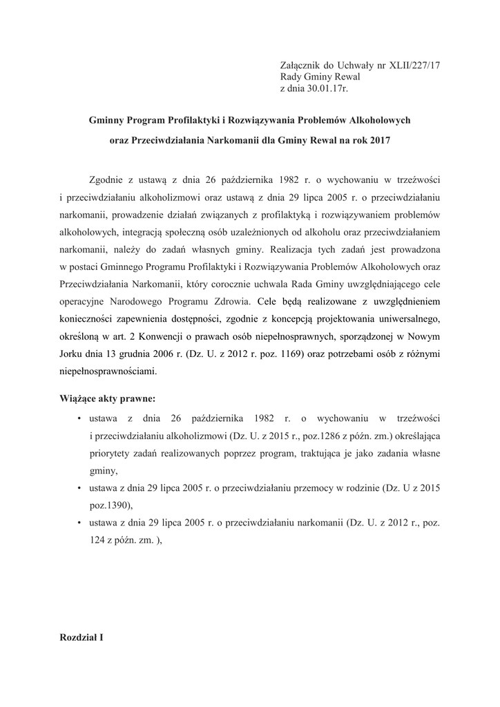 Załącznik do Uchwały nr XLII/227/17 Rady Gminy Rewal z dnia 30.01.17r. Gminny Program Profilaktyki i Rozwiązywania Problemów Alkoholowych oraz Przeciwdziałania Narkomanii dla Gminy Rewal na rok 2017 Zgodnie z ustawą z dnia 26 października 1982 r. o wychowaniu w trzeźwości i przeciwdziałaniu alkoholizmowi oraz ustawą z dnia 29 lipca 2005 r. o przeciwdziałaniu narkomanii, prowadzenie działań związanych z profilaktyką i rozwiązywaniem problemów alkoholowych, integracją społeczną osób uzależnionych od alkoholu oraz przeciwdziałaniem narkomanii, należy do zadań własnych gminy. Realizacja tych zadań jest prowadzona w postaci Gminnego Programu Profilaktyki i Rozwiązywania Problemów Alkoholowych oraz Przeciwdziałania Narkomanii, który corocznie uchwala Rada Gminy uwzględniającego cele operacyjne Narodowego Programu Zdrowia. Cele bę dą realizowane z uwzglę dnieniem konieczności zapewnienia dostę pności, zgodnie z koncepcją projektowania uniwersalnego, określoną w art. 2 Konwencji o prawach osób niepełnosprawnych, sporzą dzonej w Nowym Jorku dnia 13 grudnia 2006 r. (Dz. U. z 2012 r. poz. 1169) oraz potrzebami osób z różnymi niepełnosprawnościami. Wiążące akty prawne: • ustawa z dnia 26 października 1982 r. o wychowaniu w trzeźwości i przeciwdziałaniu alkoholizmowi (Dz. U. z 2015 r., poz.1286 z późn. zm.) określająca priorytety zadań realizowanych poprzez program, traktująca je jako zadania własne gminy, • ustawa z dnia 29 lipca 2005 r. o przeciwdziałaniu przemocy w rodzinie (Dz. U z 2015 poz.1390), • ustawa z dnia 29 lipca 2005 r. o przeciwdziałaniu narkomanii (Dz. U. z 2012 r., poz. 124 z późn. zm. ), Rozdział I Diagnoza problemów uzależnień. W 2012 roku Studio Diagnozy i Profilaktyki z Krakowa przeprowadziło dla gminy Rewal badania diagnostyczne problemów uzależnień (alkoholizm, narkomania, uzależnienie od komputera i internetu) i innych zagrożeń społecznych (cyberprzemocy, przemoc rówieśnicza i domowa). Raport z badań jest dostępny na stronie internetowej Urzędu Gminy Rewal w zakładce Gminna Komisja Rozwiązywania Problemów Alkoholowych. Badaniami objęto poniższe obszary problemowe: • Lokalne zagrożenia społeczne w grupie dorosłych mieszkańców: - podstawowe problemy społeczne w opinii mieszkańców gminy Rewal - bezrobocie oraz wykluczenie społeczne - spożywanie alkoholu oraz związane z nim inne problemy społeczne - narkotyki w środowisku lokalnym - przemoc - dorośli mieszkańcy a gry hazardowe • Problemy społeczne w środowisku dzieci i młodzieży - dzieci i młodzież a substancje psychoaktywne - spożywanie alkoholu wśród dzieci i młodzieży - palenie papierosów - zachowania związane z używaniem narkotyków i dopalaczy - dzieci i młodzież a zachowania przemocowe - hazard i inne ryzykowne zachowania -używanie komputera przez dzieci i młodzież oraz zagrożenie cyberprzemocy Dostępność napojów alkoholowych Uchwałą nr XXXI/152/16 Rady Gminy Rewal z dnia 31.05.2016 r. w sprawie ustalenia liczby punktów sprzedaży napojów alkoholowych zawierających powyżej 4,5% alkoholu, z wyjątkiem piwa przeznaczonych do spożycia w miejscu sprzedaży i poza miejscem sprzedaży, ustanowiono na terenie gminy Rewal limit punktów sprzedaży z przeznaczeniem do spożycia: • poza miejscem sprzedaży - maksymalnie 150 • w miejscu sprzedaży - maksymalnie 220 Na terenie gminy ogółem jest 273 punktów sprzedaży napojów alkoholowych, w tym: - przeznaczonych do spożycia poza miejscem sprzedaży: 56 - przeznaczonych do spożycia w miejscu sprzedaży: 217 Wydano 592 zezwolenia (w tym jednorazowych) na sprzedaż napojów alkoholowych (stan na dzień 30.12.2016 r.) Czynnikami, które sprzyjają wzrostowi spożycia alkoholu w naszej gminie są m.in. zagęszczenie punktów sprzedaży, nieprzestrzeganie przepisów przez osoby sprzedające napoje alkoholowe, w szczególności sprzedaż alkoholu osobom niepełnoletnim, obniżenie cen napojów alkoholowych. 11 lipca 2013 roku na zlecenie Urzędu gminy Rewal, firma Centrum Profilaktyki i Reedukacji „Atelier” z Krakowa przeprowadziła szkolenie pn. „Zakup kontrolowany”. Akcją objęto 20 sklepów spożywczych prowadzących sprzedaż alkoholu, działających w Rewalu, Pobierowie, Pustkowie, Niechorzu, Trzęsaczu i Pogorzelicy. „Zakup kontrolowany” polega na odwiedzeniu każdego punktu sprzedaży alkoholu przez osobę wyglądającą na niepełnoletnią w asyście psychologa, w celu dokonania zakupu wybranego rodzaju alkoholu. Wyniki zakupu kontrolowanego: • w 12 punktach sprzedawcy poprosili tajemniczego klienta o okazanie dokumentu potwierdzającego pełnoletniość, jego brak poskutkował odmową sprzedaży, • do sprzedaży alkoholu doszło w 8 punktach - sklepach spożywczych; w jednym z punktów zapytano o wiek i dokument potwierdzający, jednak sprzedawca zdecydował się na zakup pod wpływem próśb kupującego; w pozostałych punktach sprzedaż odbyła się bez przeszkód; • w 3 (z 8) punktów w których doszło do zakupu obecny był tylko personel, w pozostałych 5 oprócz personelu obecni byli także inni klienci; W trakcie realizacji szkolenia zauważono istotne uchybienia w przestrzeganiu postanowień ustawy o wychowaniu w trzeźwości i przeciwdziałaniu alkoholizmowi: • w 12 punktach brak było informacji o szkodliwości alkoholu, do której uwidocznienia zobowiązuje ustawodawca w art 13 ust. 2 ustawy; • w 9 punktach brak było informacji dotyczących zakazu sprzedaży alkoholu określonych w art. 15 ust. 1 pkt 1-3; • w 14 punktach sprzedaży stwierdzono niezgodną z ustawą reklamę napojów alkoholowych (art. 131 ust. 1); Rozdział II Zasoby umożliwiające prowadzenie działalności profilaktycznej i naprawczej Baza w gminie Rewal: • Gminna Komisja Rozwiązywania Problemów Alkoholowych w Rewalu • Gminny Ośrodek Pomocy Społecznej w Rewalu • Komisariat Policji • Punkt Konsultacyjno - Informac